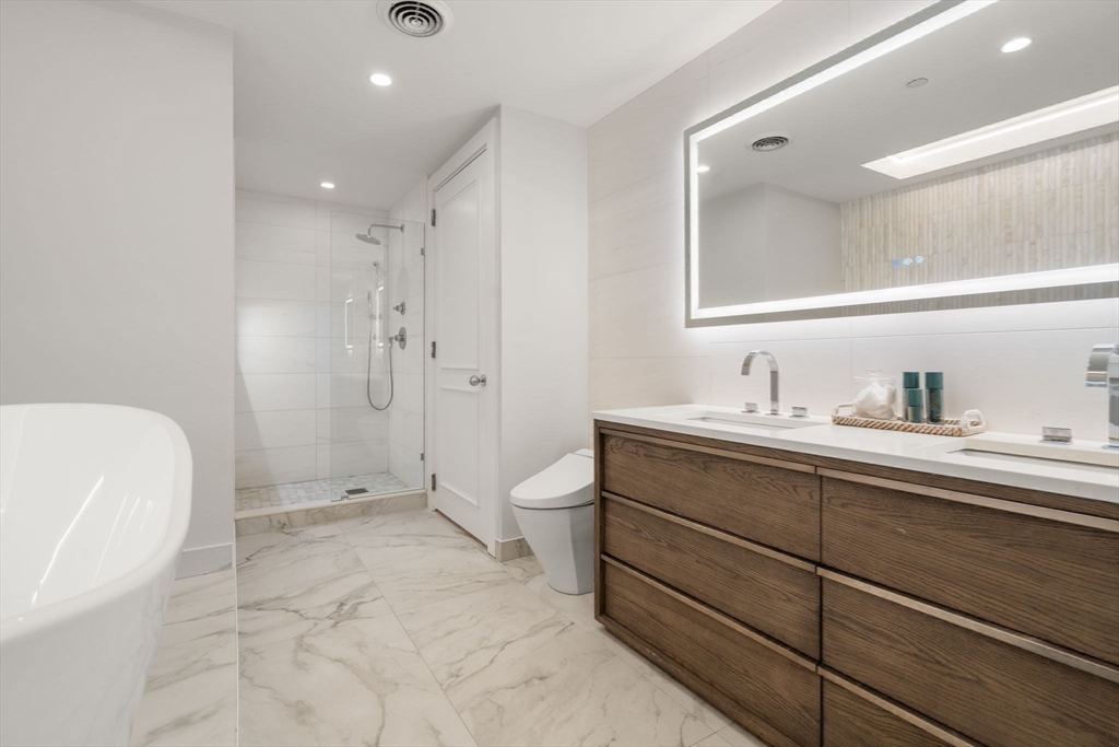 Elevated living at Boston Waterfront’s premier full-service luxury residences along the iconic Harborwalk. Beautifully renovated 2BR offering dramatic views of the Rose Kennedy Greenway stretching to Boston Harbor. Layout blends sophistication w/comfort featuring custom lighting, moldings & herringbone wood floors throughout. Stunning living/dining area framed by floor-to-ceiling windows, a striking fireplace & chef’s kitchen w/marble countertops & backsplash. A serene primary suite features a luxurious marble bath designed w/timeless elegance. Stylish powder room w/custom marble vanity & a laundry room with built-ins. Unparalleled amenities incl. 1 valet garage parking space, private storage unit, 24/7 concierge, doorman, exceptional hotel services, dining, room service, fitness center, indoor heated pool, spa, & outdoor patio on Boston Harbor. Sought after location just steps to Seaport, Financial District, historic North End, Faneuil Hall, water shuttle & South Station.