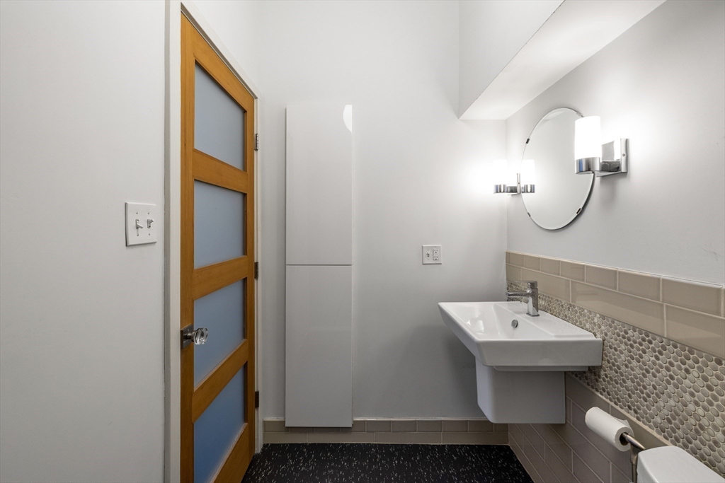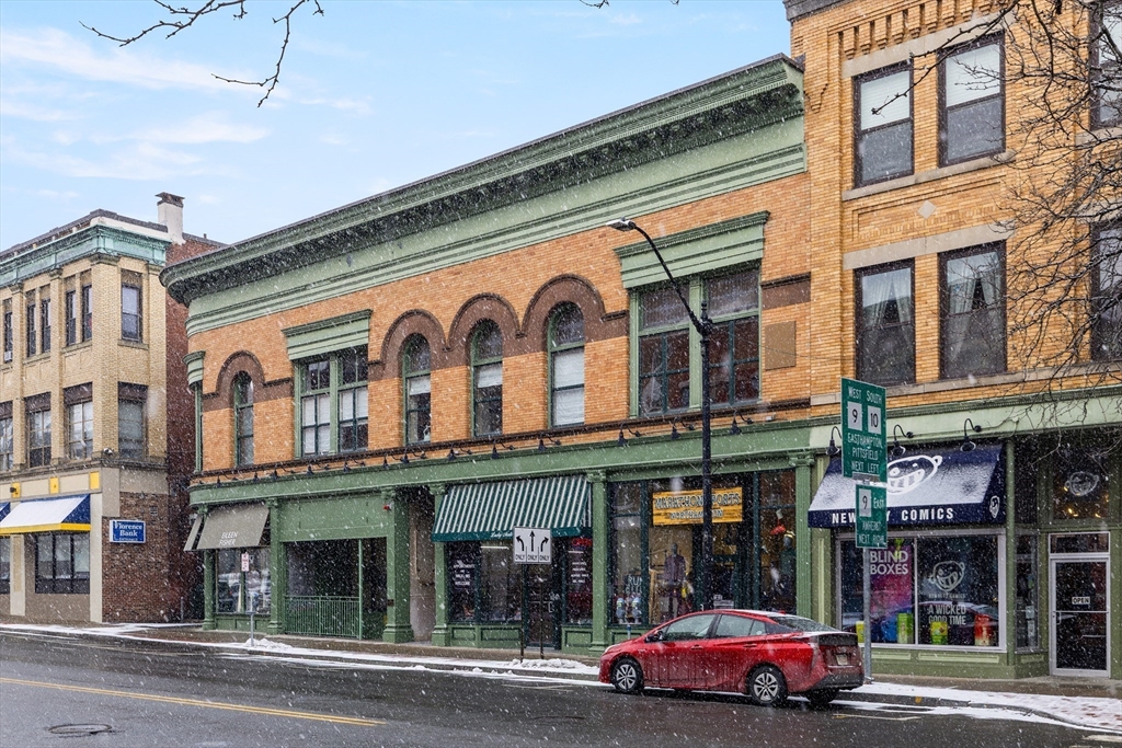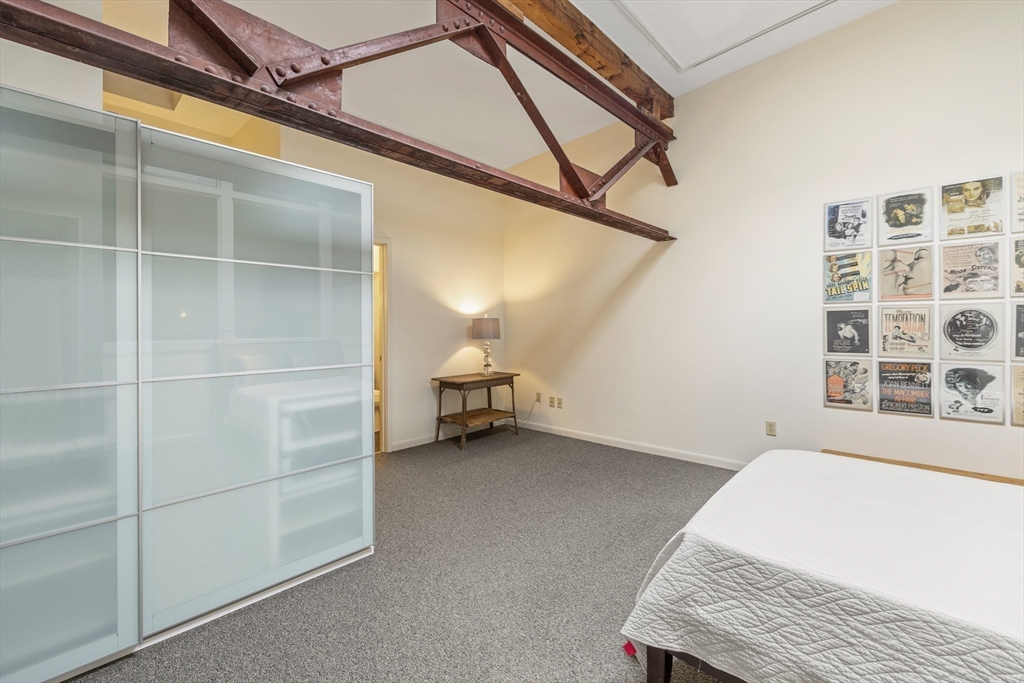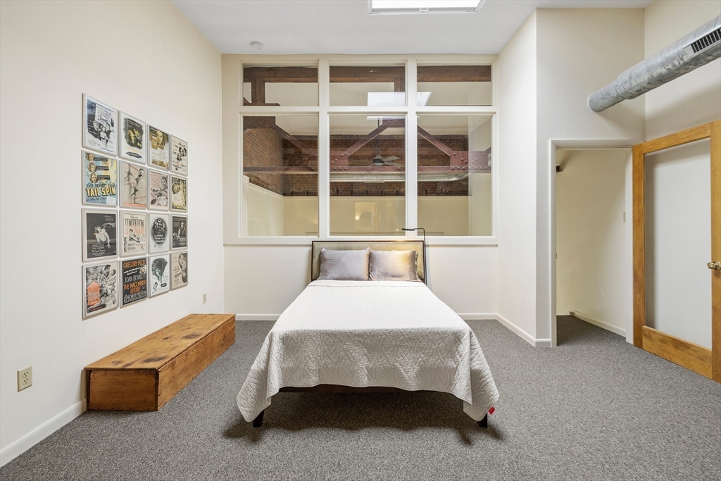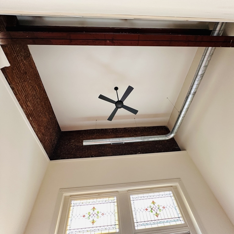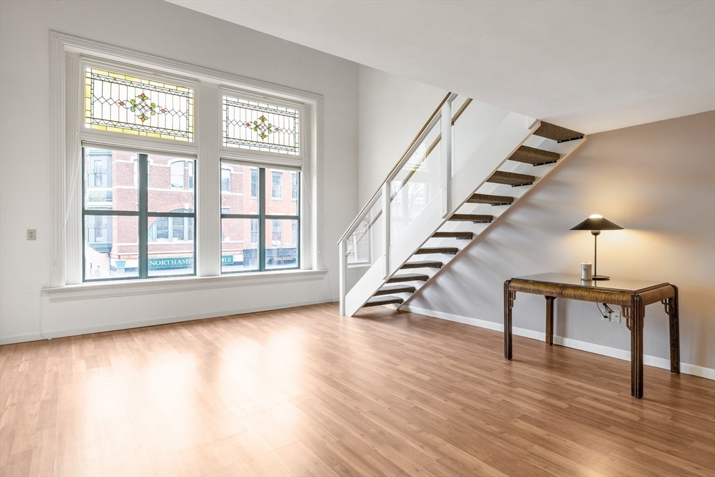 Live in the heart of downtown Northampton in this professional loft-style condo at 30 Pleasant St. Floor-to-ceiling windows with original stained glass overlook Pleasant Street, filling the space with abundant natural light. The open living area showcases soaring 25-foot ceilings, exposed brick, exposed steel beams, recessed lighting, and a central ceiling fan.The remodeled kitchen features stainless steel appliances, sleek cabinetry, and ample storage. Upstairs, the lofted primary suite offers a skylight, large armoire-style closet system, and a fully renovated tiled bath with a walk-in shower. Significant recent updates include a new furnace, new central AC, and a new hot water heater. This home includes an in-unit washer and dryer. The self-managed association offers a low monthly condo fee of $209.77, and pets are permitted. Convenient parking is available for a monthly fee at the nearby garage ($110) or the Strong Ave lot ($45) located directly behind the building.