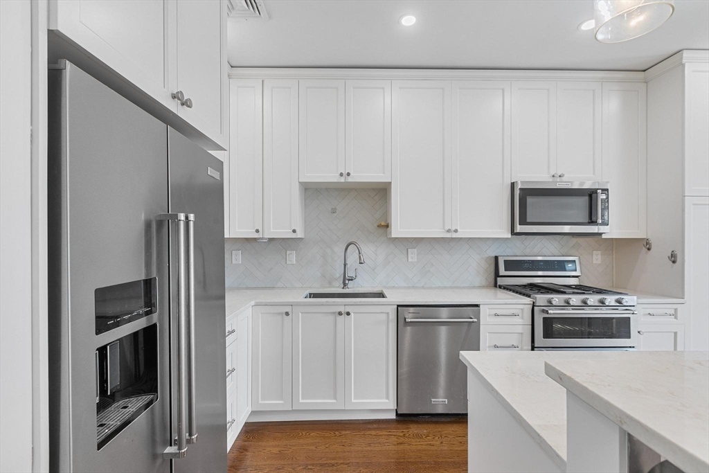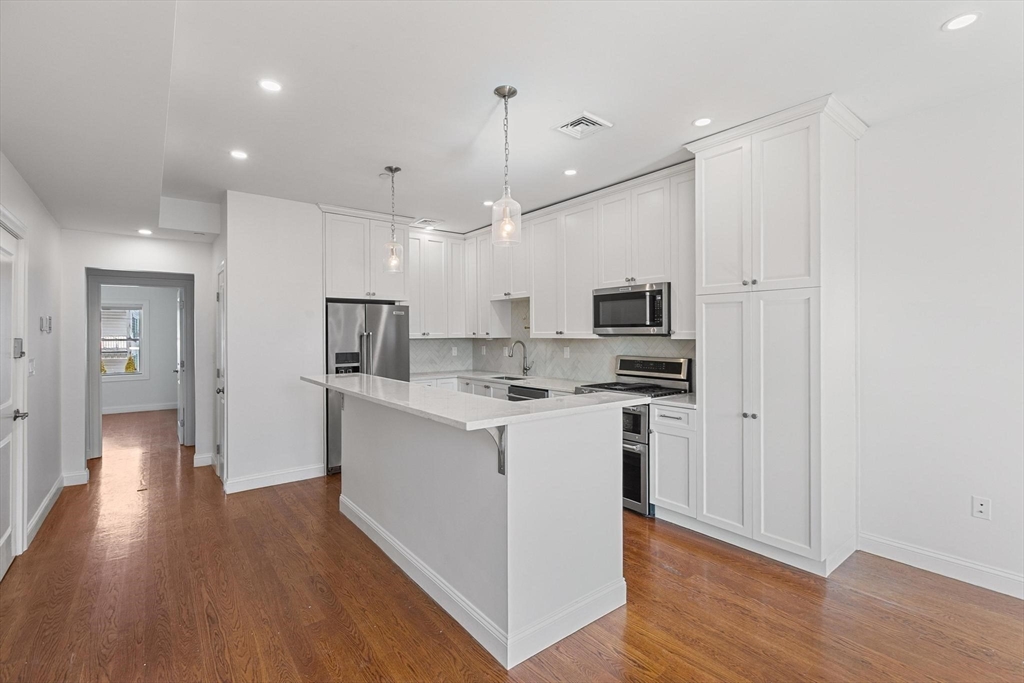 Fully reimagined in 2023, 318 Princeton St #201 offers elevated city living in East Boston. This 2BR, 1BA home plus dedicated office is anchored by a stunning entertainer’s kitchen featuring custom cabinetry, quartz countertops, stainless steel appliances, an oversized island, and striking herringbone tile backsplash. The open layout flows seamlessly into the living area, ideal for hosting and everyday enjoyment. A spacious primary bedroom offers a comfortable retreat with ample closet space. The beautifully renovated bath showcases artfully laid herringbone tilework in the shower. A private outdoor space designed for entertaining, in-unit washer/dryer, and a pet-friendly association complete this turnkey home close to transit, dining, and the waterfront.