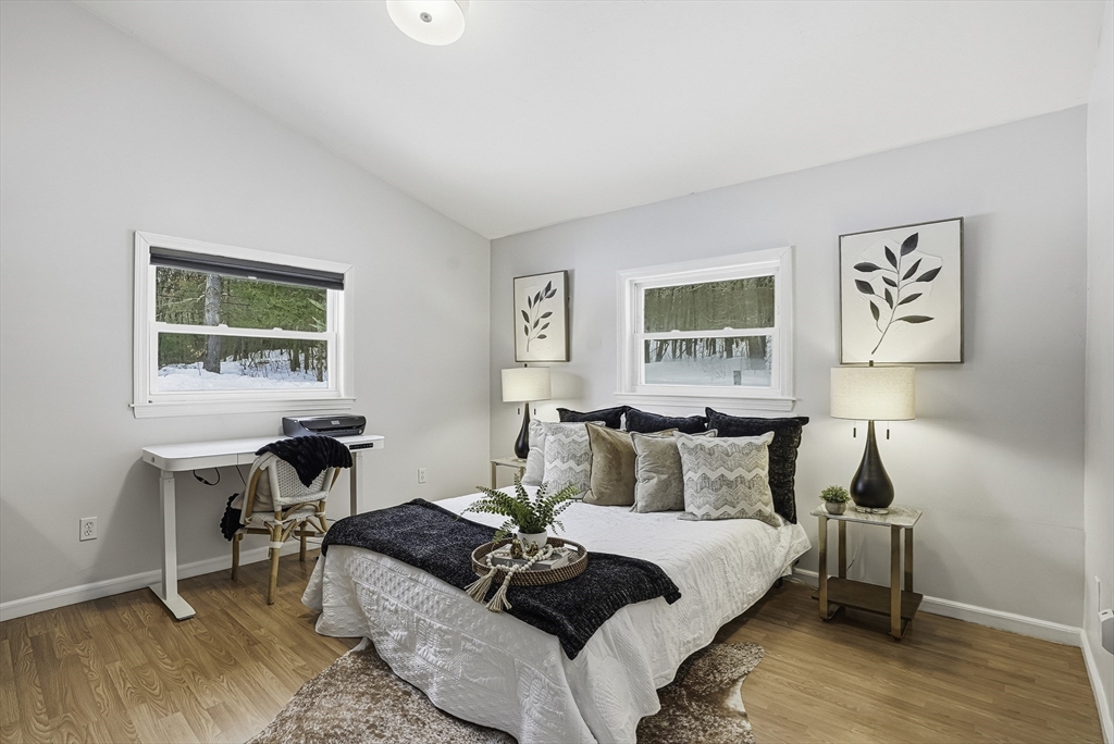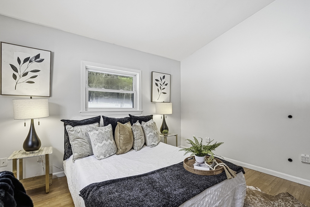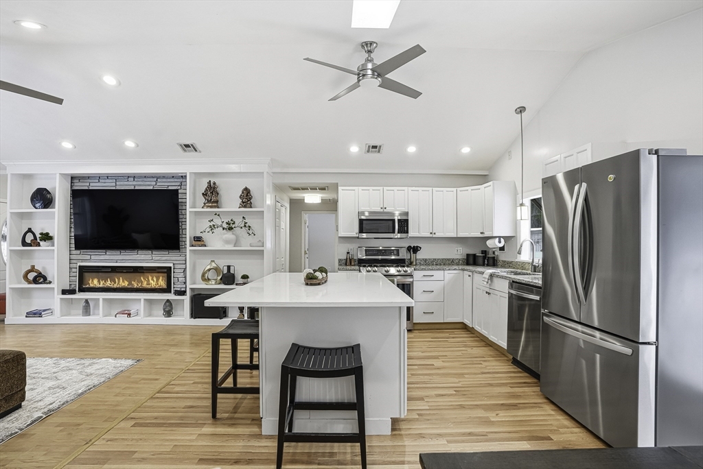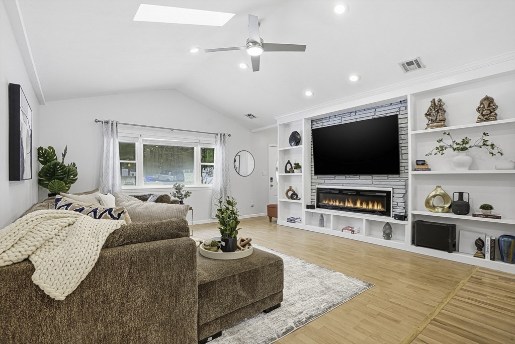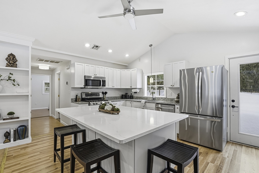 Experience single-level living in this stunning Northeast-facing ranch, gracefully set on 1.5 acres of professionally landscaped, fully fenced grounds. This exceptional property offers the perfect blend of privacy, functionality, & everyday comfort. A thoughtfully redesigned open-concept layout seamlessly connects the kitchen, dining area, & family room, where a soaring vaulted ceiling, statement fireplace, & custom built-ins create a warm yet sophisticated ambiance ideal for entertaining. The beautifully updated white kitchen serves as the heart of the home, showcasing an oversized breakfast island perfect for gatherings, casual dining, and culinary creativity. Three spacious bedrooms, each featuring walk-in closets, provide comfort & functionality. Two amazing baths, one with a dual-sink vanity & designer tiled shower and a brand-new 2nd full bath with dual vanities & tub that adds a spa-inspired touch. Easy access to Ashland commuter rail, I90/495, downtown, top-ranked schools!