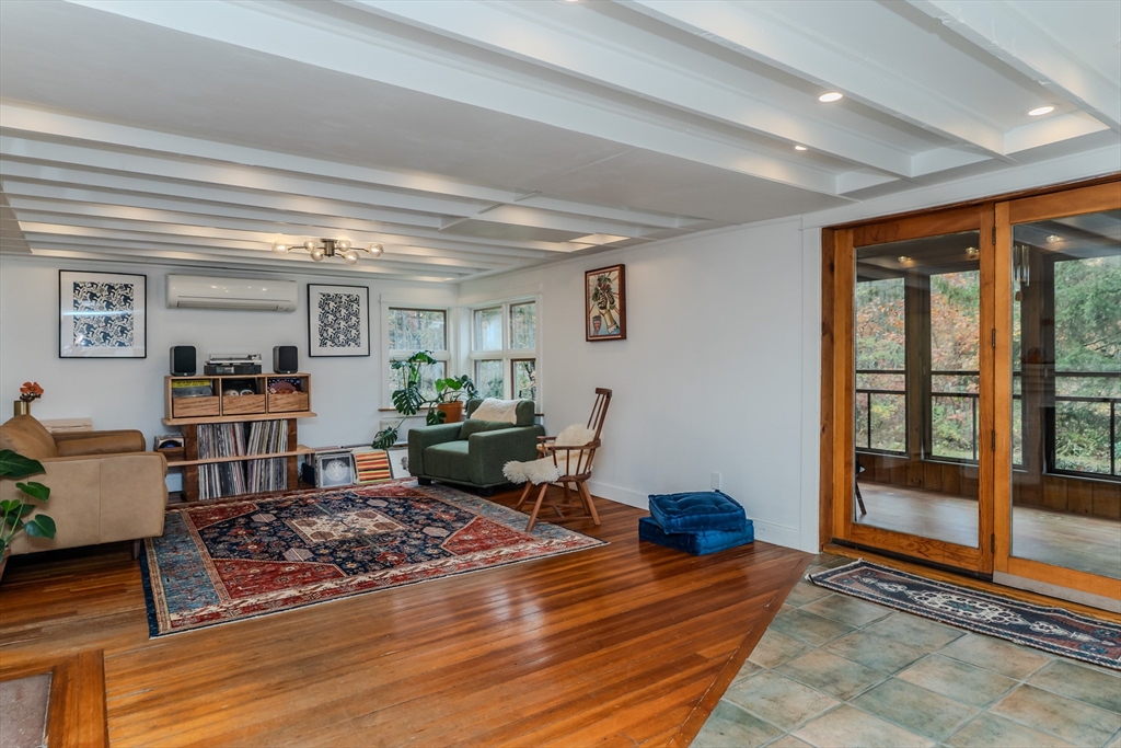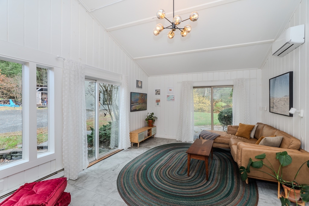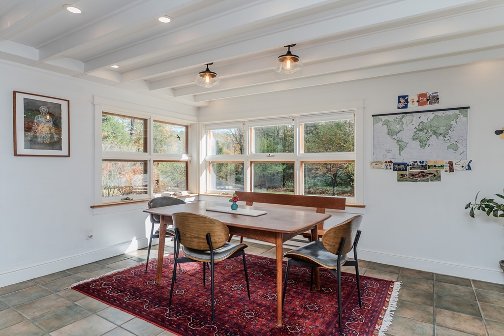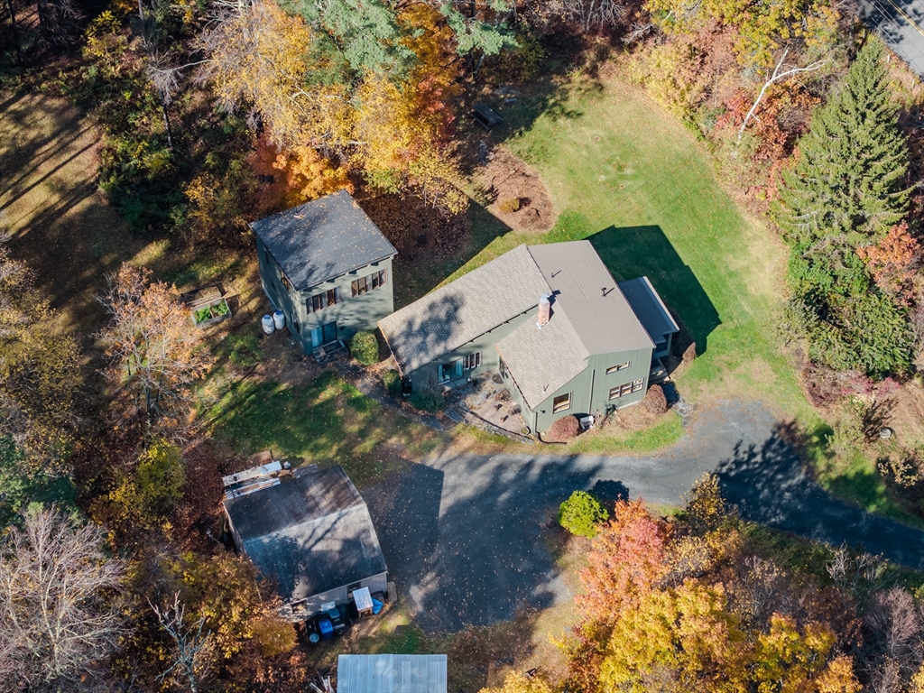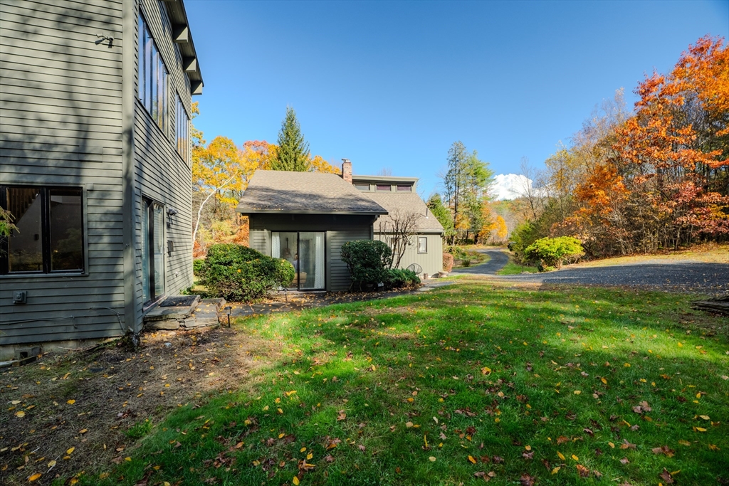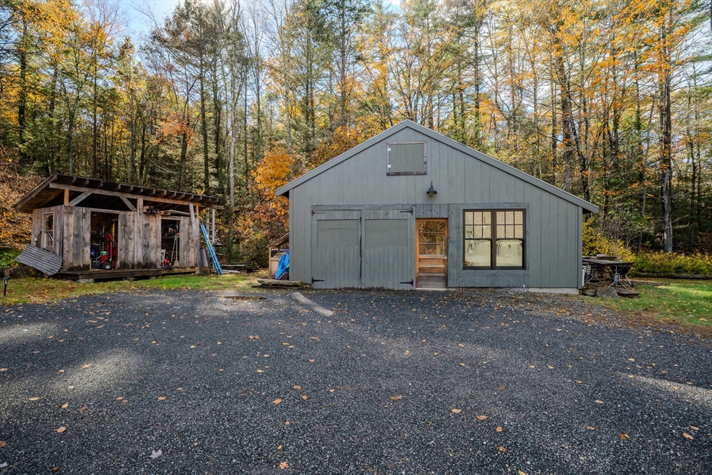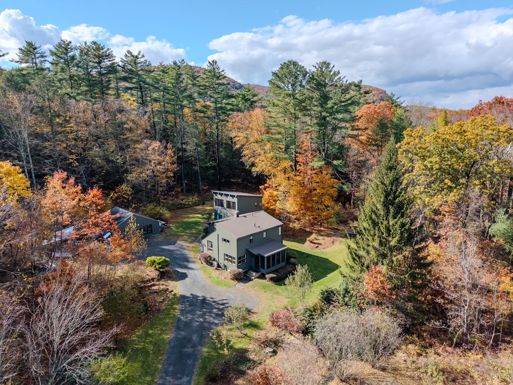 Nestled on a serene 4.9-acre lot, this contemporary home offers a private retreat with unique flexibility. Spanning 6 RMS, the main residence features 3 BRs & 1.5 baths, anchored by a cook’s kitchen with a gas cooktop and granite counters. The spacious living & dining area boasts a cozy fireplace and the den offers extra space for gathering or unwinding. Take in scenes of nature from every window, the screened porch, or the Goshen stone patio. The property also includes a charming ~800 sq ft guesthouse with an open floor plan, featuring 5 RMs, 2 BRs, & 1 bath—perfect for visitors or as a rental. Additional highlights include a heated workshop w/ office, storage shed, & 2 fenced garden areas, providing ample room for hobbies & projects. Just down the road are maintained trails, the Peace Pagoda, and Leverett Pond. Conveniently located just minutes from major routes, schools, & local venues, this home combines modern living with tranquility in a picturesque setting.