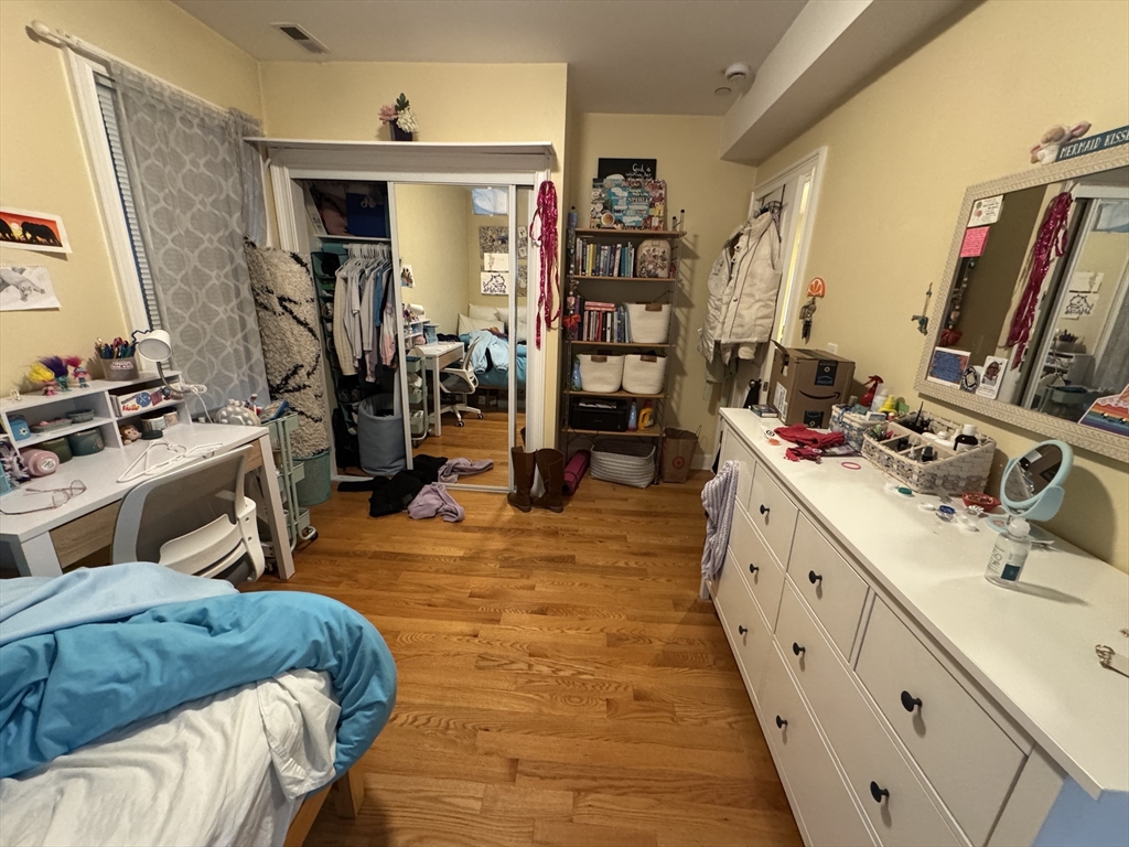 Davis Square. Closest train = Davis Square (Red Line T). 3 bed/2 bath (second floor unit). Hardwood floors throughout. Updated & modern kitchen. Updated tiled bathrooms. Central heat & A/C. In-unit laundry. Private front deck. Storage unit in basement.