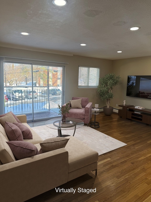 Sunny, updated two bedroom rental ready for a selective tenant. Freshly painted, recessed lighting, new dishwasher, garbage disposal and upgraded cabinets. Bathroom updated with a new shower/ tub surround and quiet fan. Hardwood floors gleaming living and dining areas and easy care laminate in kitchen and bedrooms. 2 walk in closets, 3 more closets offer great storage. HEAT, Hot Water and cooking gas is covered as part of the rent. BIG main bedroom - perfect for kingsize bed. Middle unit- one flight to Laundry in lower level. Summertime fun in lifeguarded inground swimming pool. One assigned parking spot and a second parking spot available for rent from association for $240 a year. Located a block away from YMCA, close to Market Basket shopping plaza, and downtown Andover. In district of Andover's brand NEW SCHOOL, West Elementary. Landlord requires good credit score, references, first, last and security deposit. OH Saturday 3/7 11am to 12:30 & Sund noon to 2:00pm
