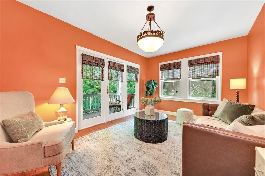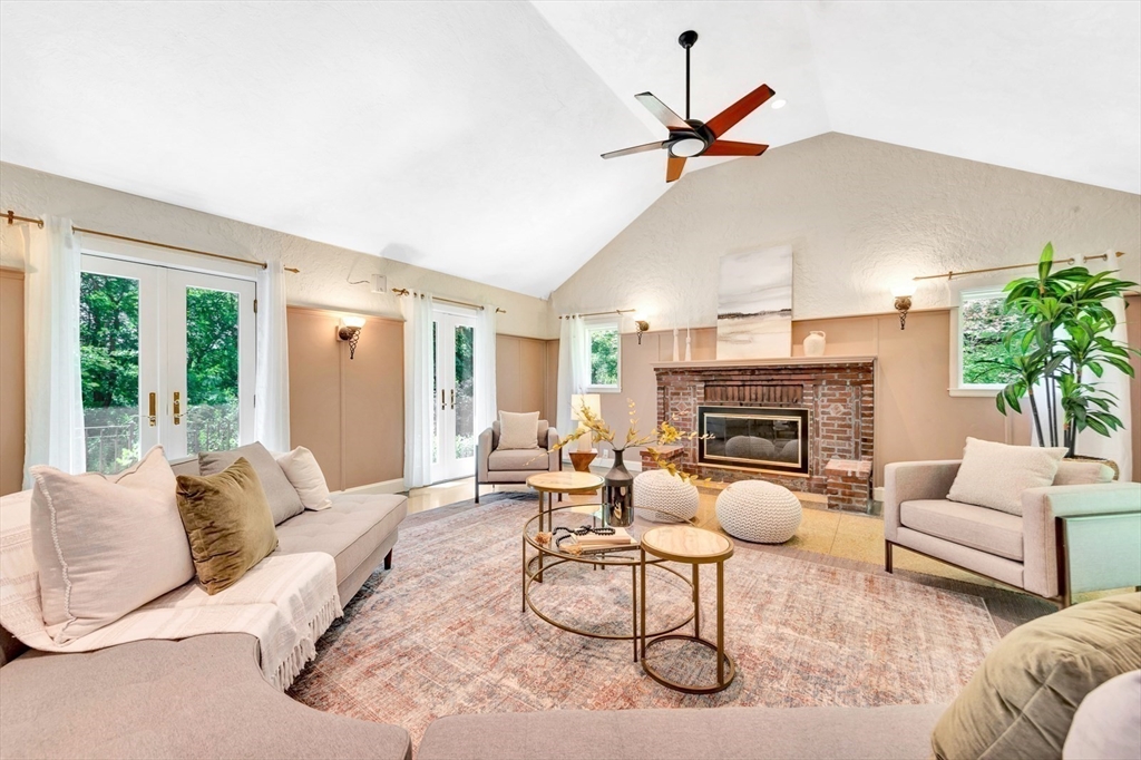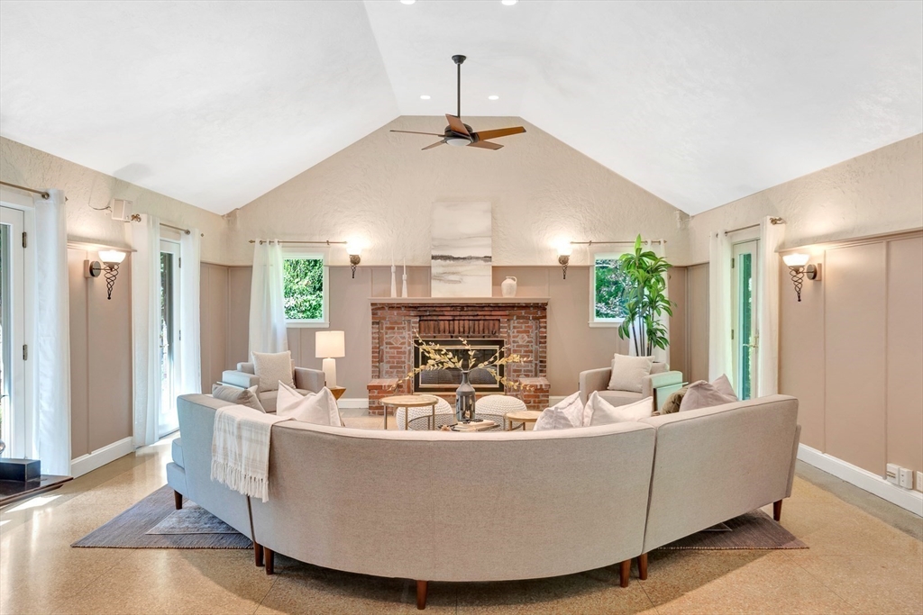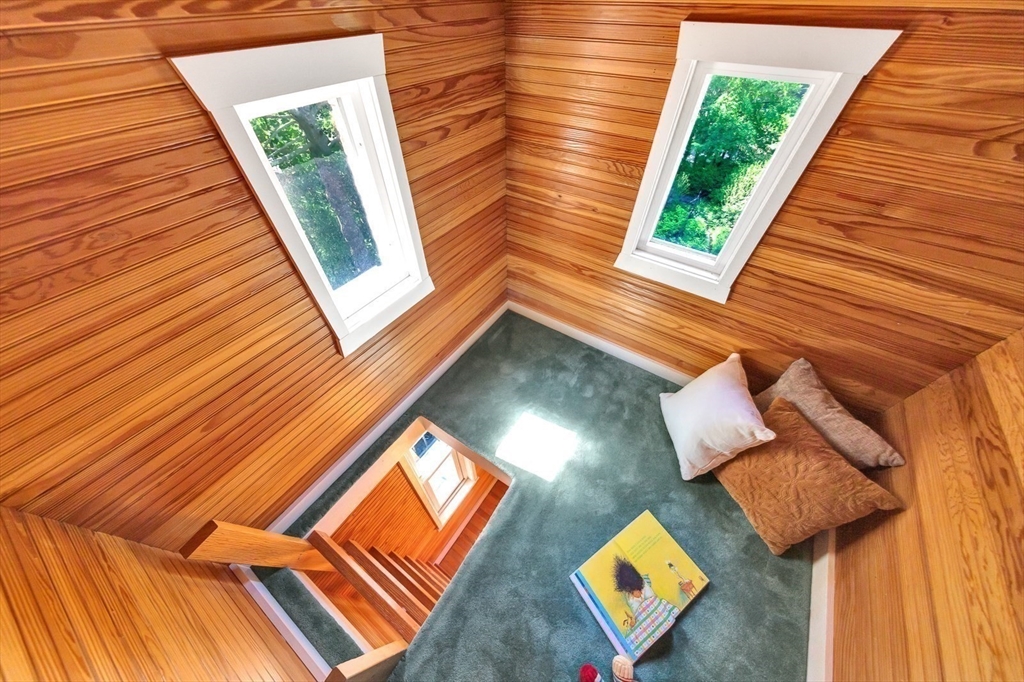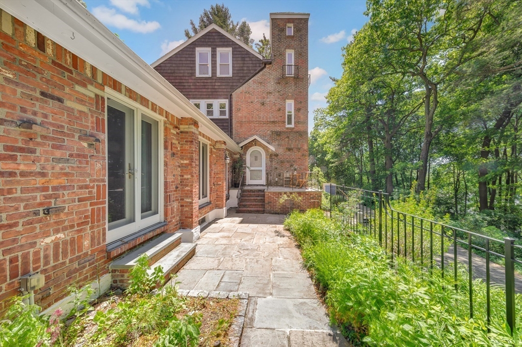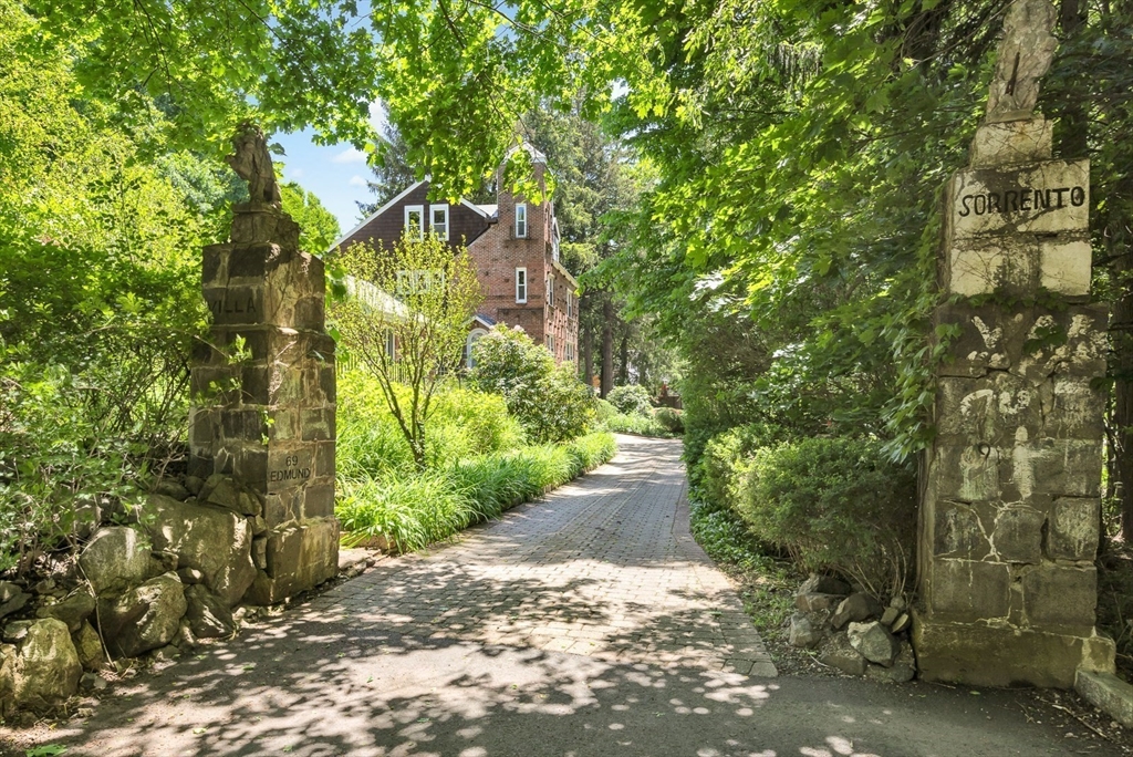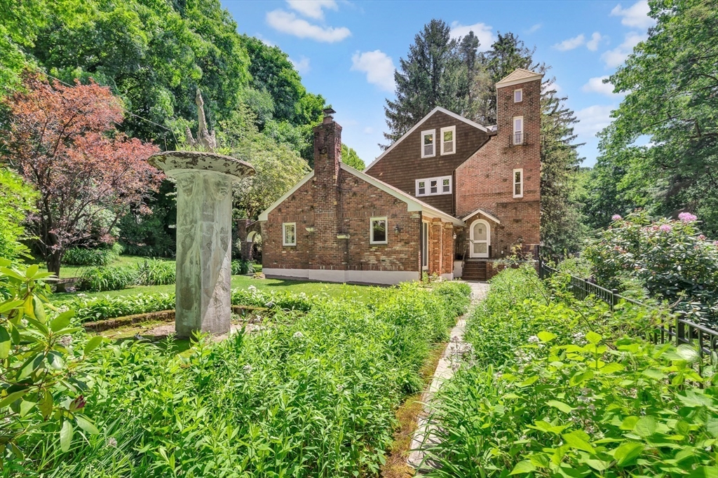 Tucked beneath a beautiful canopy of trees, you’ll find one of Arlington’s truest treasures, an enchanted, incredibly special villa framed by stone pillars, whimsical statues, & a winding cobblestone path. Echoing the spirit of 'The Secret Garden', this storybook retreat feels like a hidden castle wrapped in lush greenery, bluestone patios, & waves of perennials blooming all season long. Inside, floor-to-ceiling glass doors, soaring ceilings, a cozy wood-burning fireplace, & terrazzo floors set the tone to kick back & relax in the Great Room. Updated in the ’90s, the kitchen is fully equipped while a 1/2 bath & den/office/optional bedroom round out the main level. Upstairs are 6 spacious bedrooms, including a primary suite w/walk-in closet & bath, each w/thoughtfully placed windows or glass doors & a wrap around deck. At the top, a lookout tower invites little imaginations to run wild! This rare setting, one of the largest green spaces in town, offers ADU & future development pot'l!