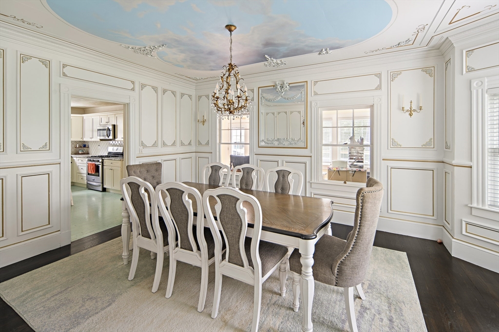 Classic charm meets modern comfort in this beautifully updated 4 bedroom Dutch Colonial. A welcoming foyer showcases the original staircase and timeless craftsmanship, leading to a truly show-stopping formal dining room with ornate moldings and a hand-painted ceiling mural that creates a truly memorable space for entertaining. The bright kitchen offers granite countertops, stainless appliances, and a casual dining island, while the adjoining sunroom provides the perfect flex space for relaxing, working from home, or creative pursuits along with French doors to the expansive deck overlooking the private yard. Upstairs you'll find spacious bedrooms filled with natural light and hardwood floors. A finished lower-level family room adds additional living space, and the walk-up attic offers incredible storage or future expansion potential. Set on a level lot and conveniently located near Middleboro Center, shops, schools, the MBTA commuter rail, and Routes 44, 495, and 24.