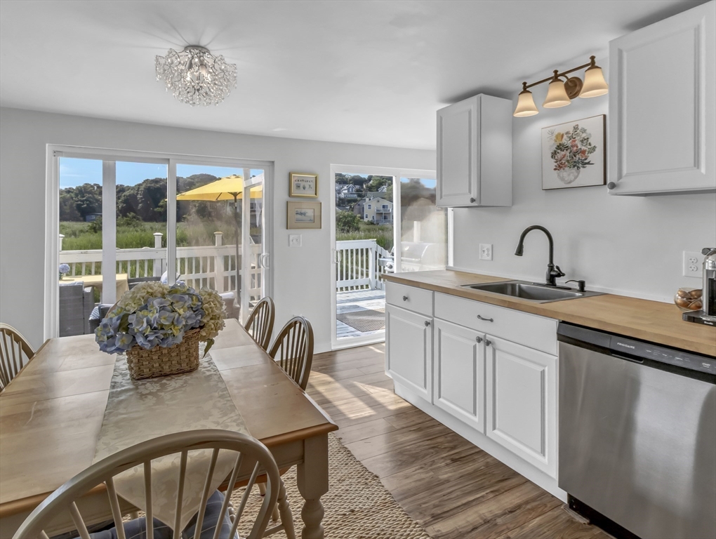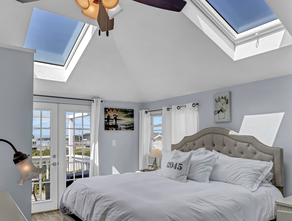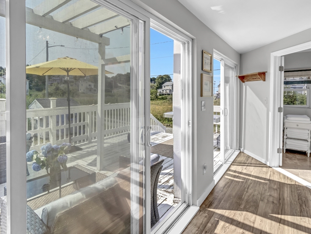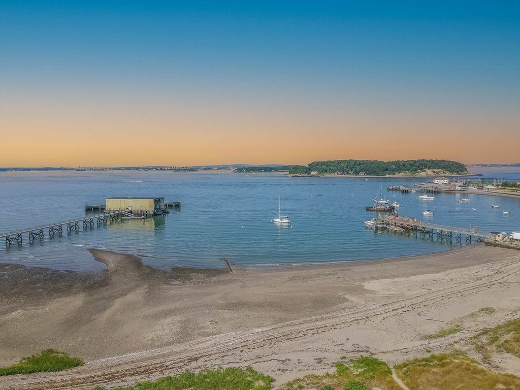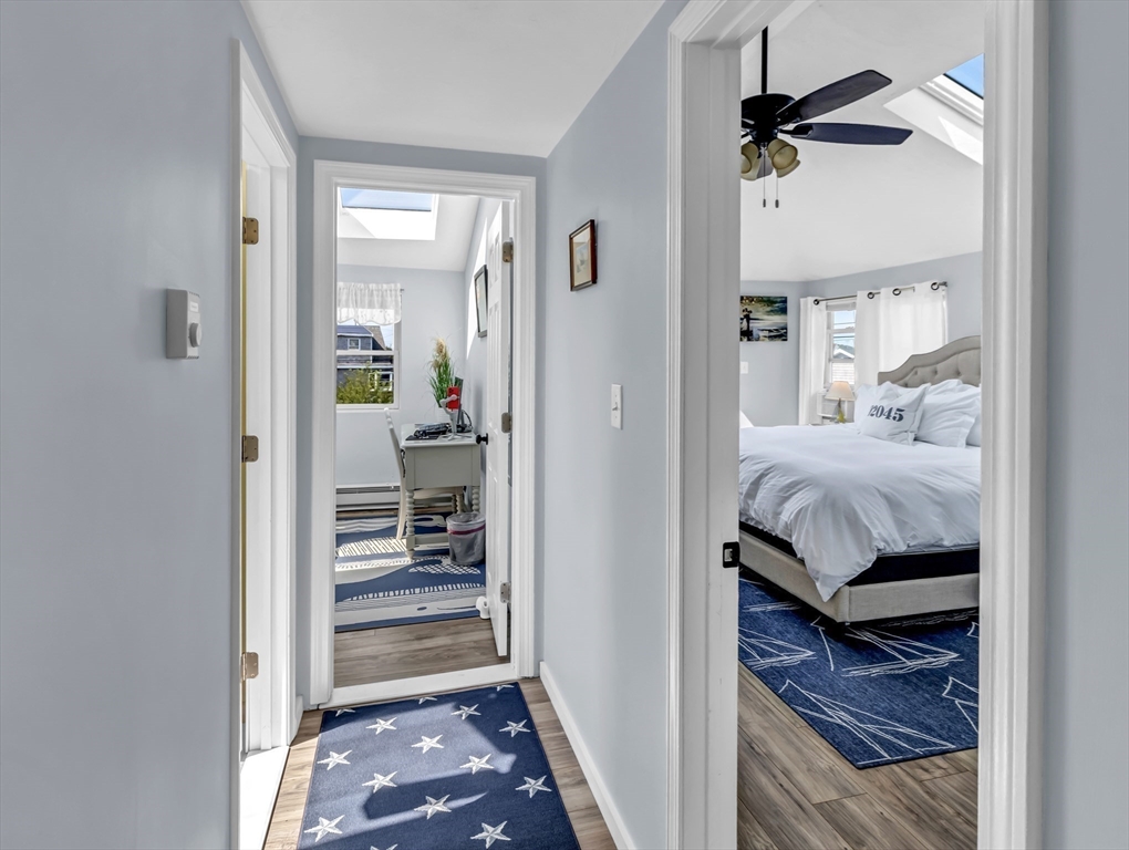 New to Market! Water View. Charming, beautifully appointed shabby-chic home located in the peaceful setting of Hull Village, just a short walk to Coast Guard Beach and Pemberton Point. The open floor plan is ideal for entertaining, featuring a living room with gas fireplace and a stylish stainless and butcher-block kitchen with two sliders leading to a spacious deck. First floor full bath includes a jacuzzi tub and stackable washer/dryer. The second floor offers a stunning primary bedroom with cathedral ceilings, skylights, ceiling fan, half bath, and a private 6x8 balcony with bay views and beautiful sunsets. Two additional bedrooms also feature cathedral ceilings, skylights, and ceiling fans. Wood laminate flooring throughout. Conveniently located just two minutes from the commuter boat with service to Boston and Logan Airport. The Yacht Club & Salt Water Club are close as well ! A wonderful coastal retreat—don’t miss this opportunity!