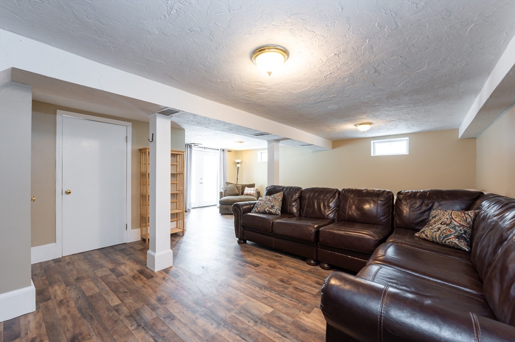 Beautifully updated Cape home in South Chelmsford featuring hardwood floors throughout. Enjoy an upgraded kitchen with granite countertops, stainless steel appliances, and modern cabinetry. The open-concept layout connects the kitchen, dining area (with slider to a spacious deck), and a cozy family room with a fireplace—perfect for entertaining. The first floor offers a front-to-back living room with abundant natural light and a large full bath. Upstairs, find three generous bedrooms (all with hardwood floors) including a primary suite with double closets, plus a full bath and an airy balcony area. The finished lower level includes a sizable family room, separate laundry, and three storage spaces. Outside, the large yard provides ample parking, an invisible fence, and a storage shed. Don’t miss this exceptional home!