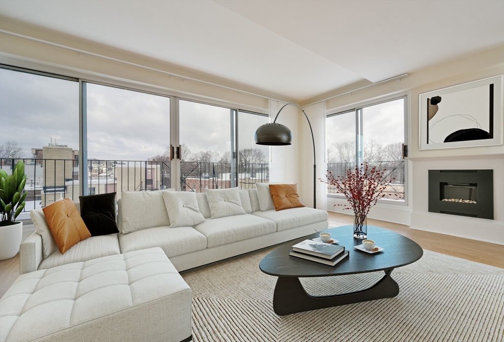 COOLIDGE CORNER/LONGWOOD MED area. Spectacular 6th floor recently gut-renovated corner 2BR/2BA PENTHOUSE with a WRAP AROUND BALCONY (approx. 410+ sq ft). Open floor plan with a HUGE living room/dining room combination. Views of treetops, sunsets, and seasonal CITY VIEWS. Washer/dryer IN-UNIT, central A/C, closets galore. Retractable Awning on western balcony. 1-car outdoor assigned PARKING space, wait list for a garage space. Common ROOF DECK. Walk to C and D T-lines. Desirable Lawrence School district. ***Rooms are virtually staged***