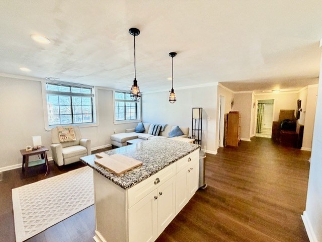 Beautiful two bedroom and one bathroom rental in East Boston's Eagle Hill neighborhood features large picture windows, recessed lighting throughout, high-grade cabinetry in the kitchen, stainless steel appliances, and a large granite center island with beautiful pendant lighting. The island seats three comfortably and offers lots of additional storage space plus there's a proper dining area for additional seating and entertaining. Create your own work/office space in the cozy nook just outside of either bedroom, perfect for a desk and some bookshelves. Both bedrooms provide lots of natural light and there's ample closet space. Common laundry is offered in the building and parking is conveniently off street and assigned. Pets are NOT allowed.