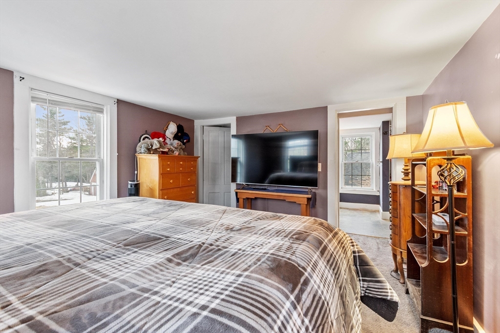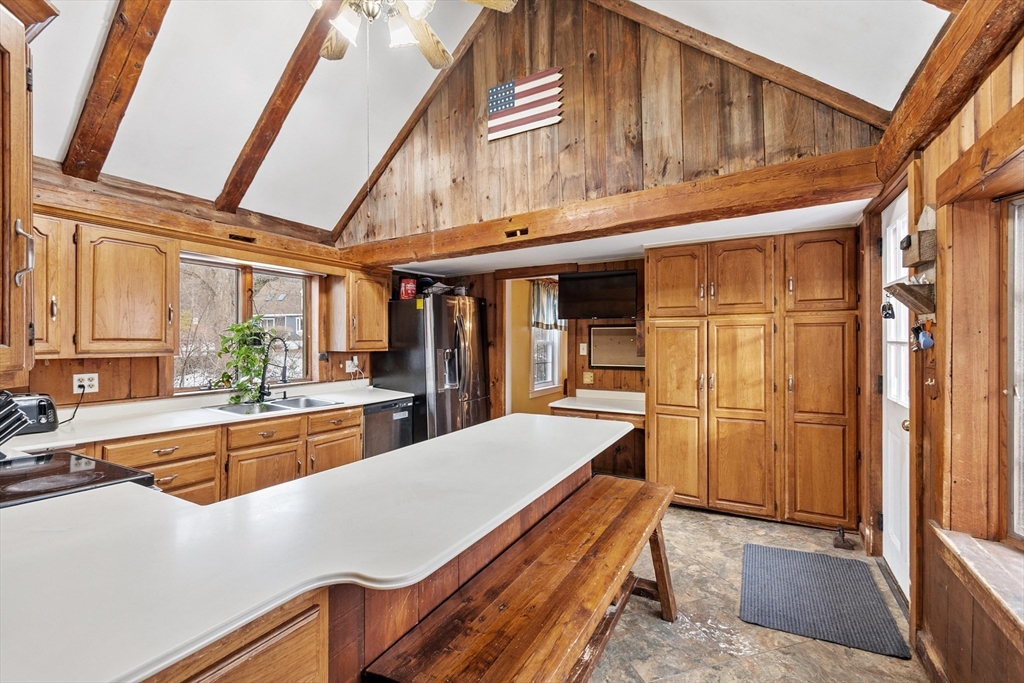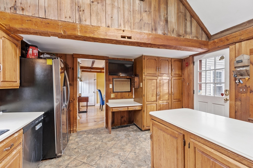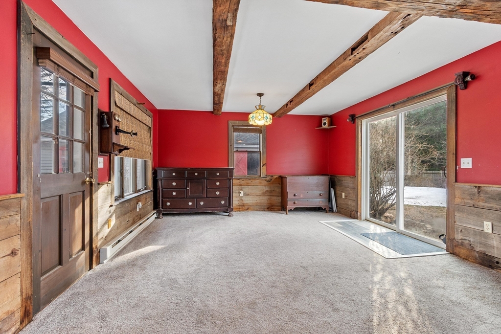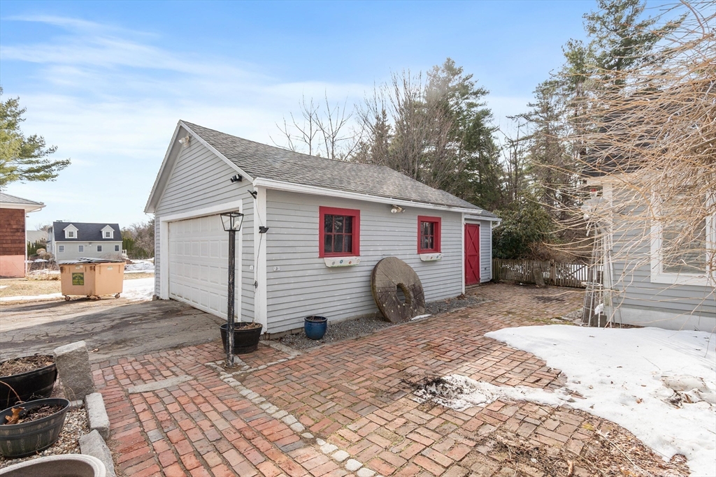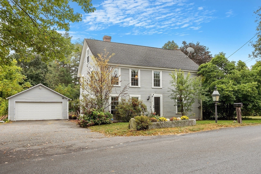 Step back in time and enjoy the charm of this circa 1880 Antique Colonial featuring beautiful post-and-beam construction, rich wood details, and timeless character throughout. A stunning great room with exposed beams, skylights, and a cozy pellet stove creates a warm and inviting gathering space filled with natural sunlight. The kitchen features a large bay window overlooking the patio and a remarkable 200-year-old trumpet vine, offering a picturesque view in every season. This versatile home offers flexible living spaces perfect for a home office, guest areas, or creative use, along with charming built-ins, nooks, and crannies that add both function and personality. Outside, enjoy a private fenced yard accented with granite millstones and stonework, creating a unique outdoor setting. A large two-car garage with workshop space provides plenty of room for hobbies, storage, or projects. Walk up attic with storage room. Conveniently located close to town center and Marshall Park.