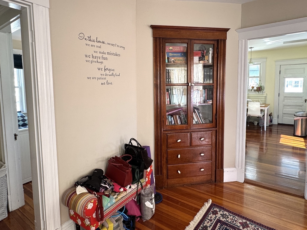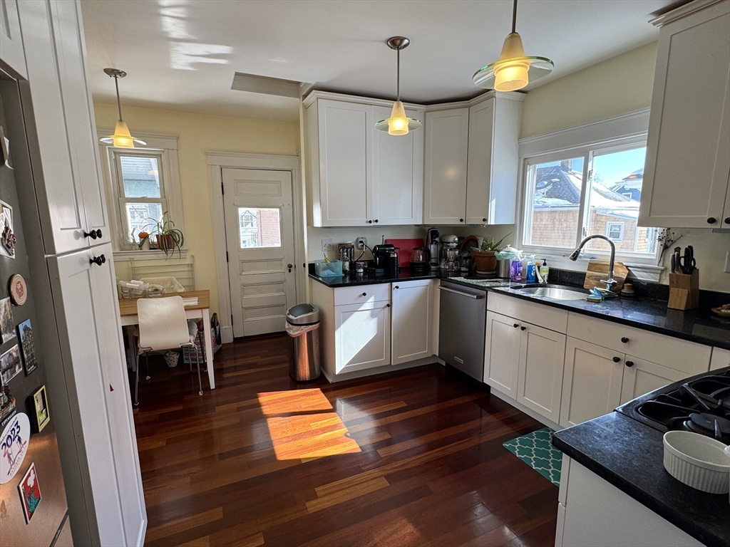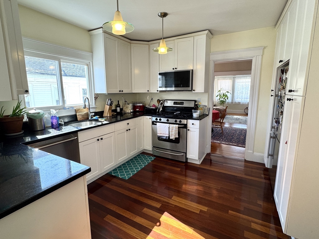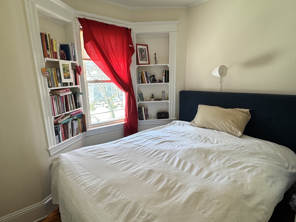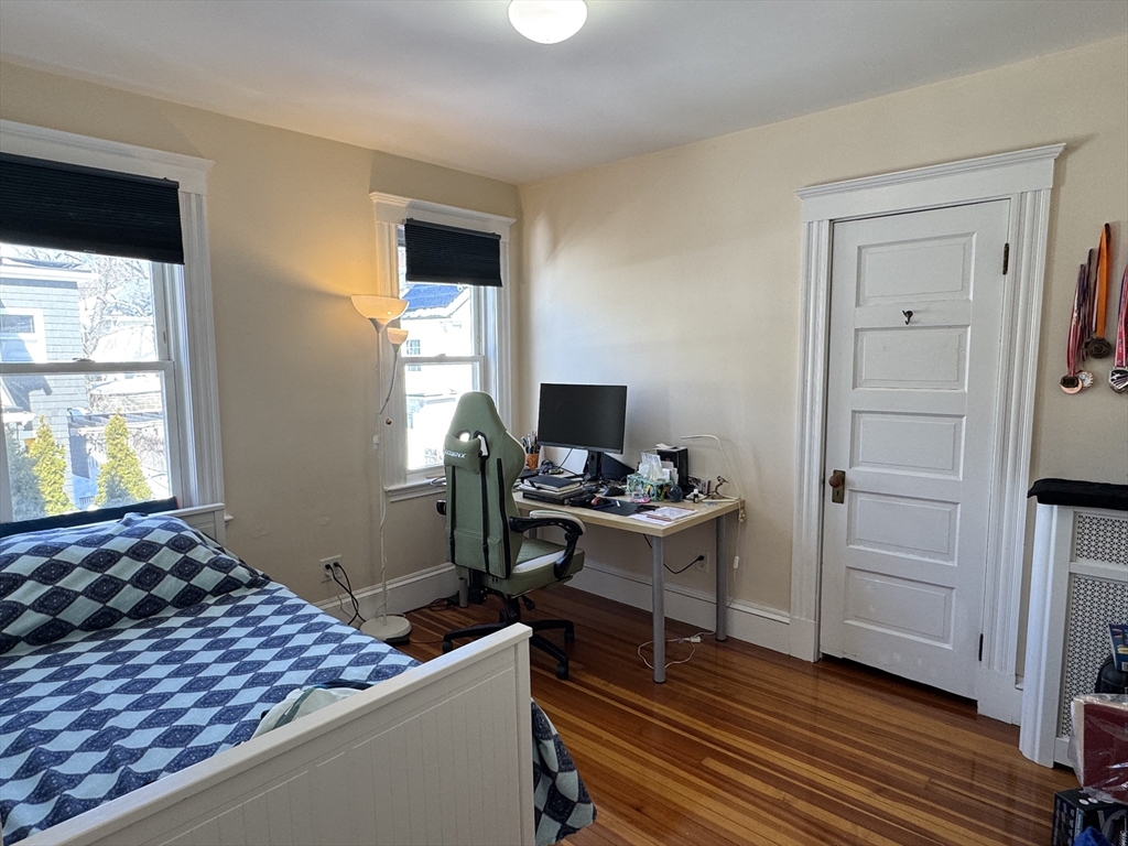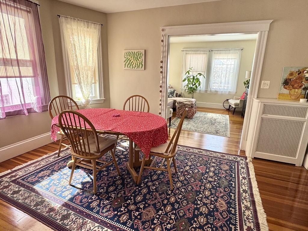 Nicely laid-out top-floor 3-bedroom, 1-bath condo in a 2-unit association, complete with a private balcony. Hardwood floors throughout, and the updated eat-in kitchen offers generous cabinet space, a gas stove, microwave, and dishwasher perfect for home-cooked meals. Enjoy a formal dining room with a built-in china hutch and a bright living room. Two good-sized bedrooms plus a bonus room ideal for a nursery/home office. Tiled bathroom with tub/shower.Designated washer/dryer and generous basement storage. Two tandem off-street parking spaces included, along with a lovely shared patio. Incredible location near Route 2, the Red Line, Arlington Center, the Capitol Theatre, Spy Pond paths, and the Minuteman Bike Path. No pets please. Video tour available upon request. Available 4/1.