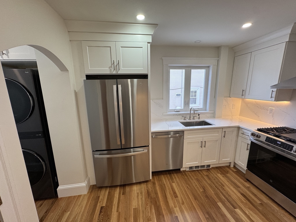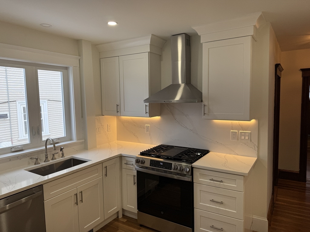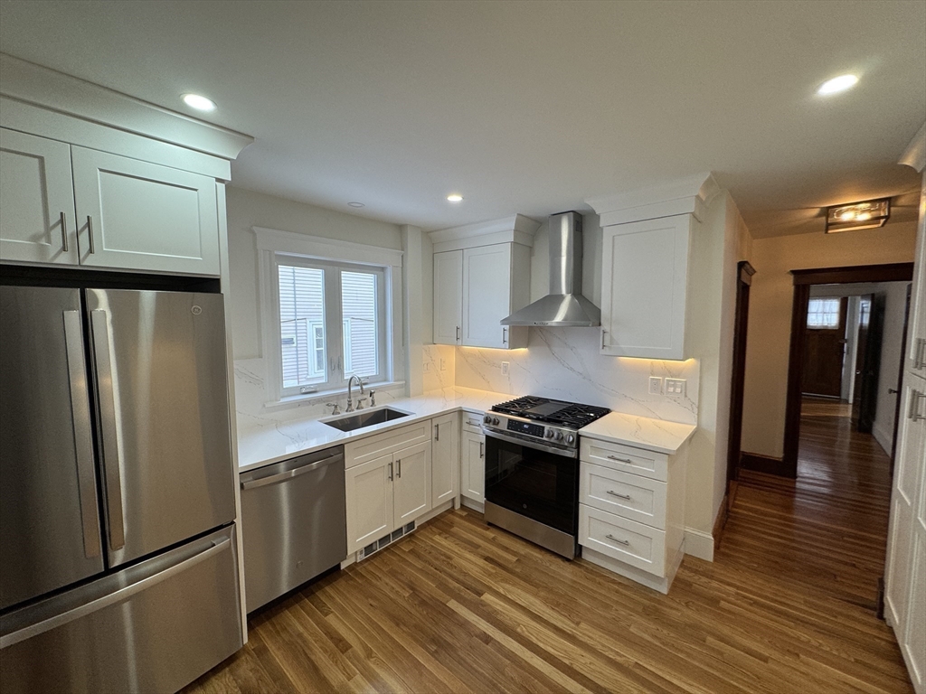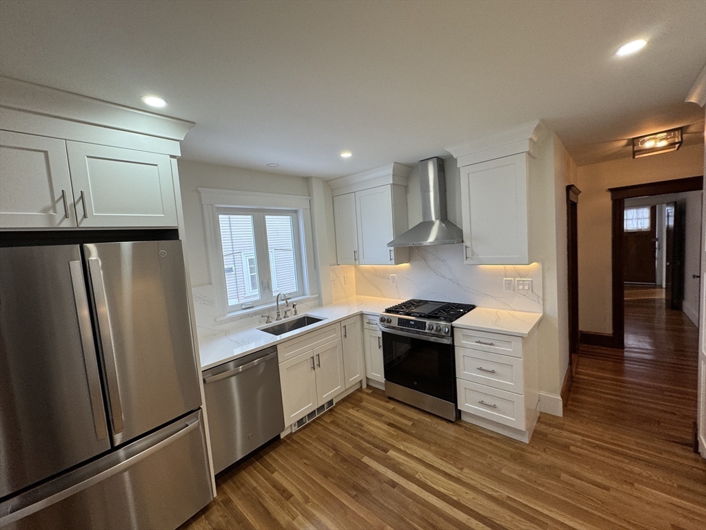 Spacious and beautifully renovated 1189 SF two-bedroom apartment filled with natural light. The home features a stunning oversized kitchen that will delight anyone who enjoys cooking, with high-end GE stainless steel appliances, elegant white quartz countertops, abundant cabinetry, and generous prep space. A large pantry with an in-unit washer and dryer adds everyday convenience. Recently finished hardwood floors and fresh paint create a crisp, modern feel throughout the home. The fully renovated bathroom offers a spa-inspired retreat, finished in bright white tile with stylish fixtures and a clean, contemporary design. Additional highlights include two off-street parking spaces, basement storage, and a fantastic location within walking distance to the Bellevue Commuter Rail, plus easy access to Legacy Place and the shops, restaurants, and pubs along Centre Street—making this a perfect blend of comfort, convenience, and neighborhood charm.