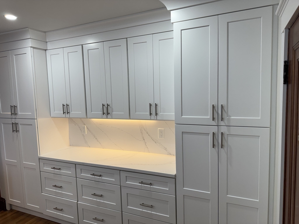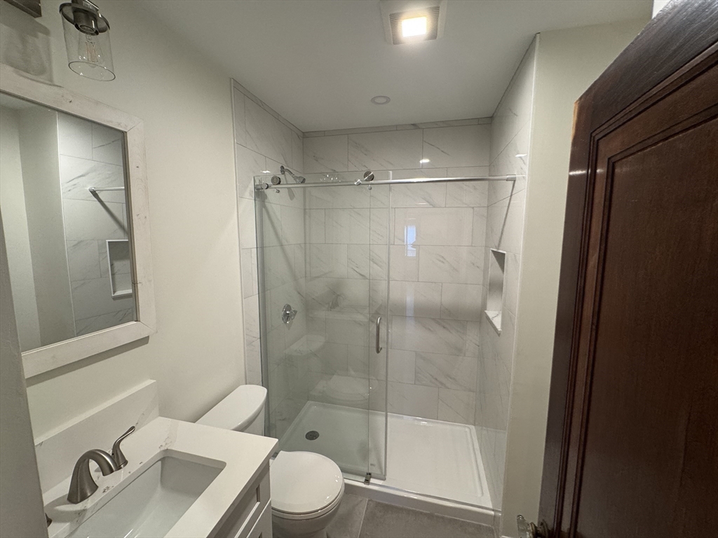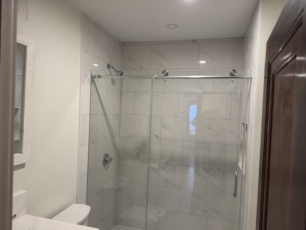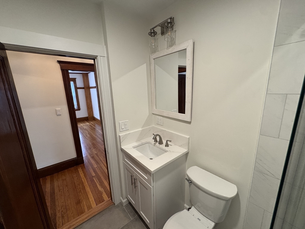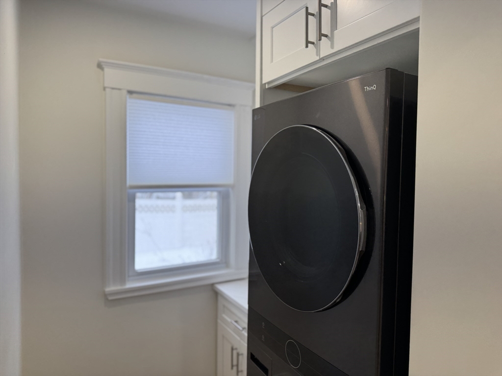 Spacious and beautifully renovated 1189 SF two-bedroom apartment filled with natural light. The home features a stunning oversized kitchen that will delight anyone who enjoys cooking, with high-end GE stainless steel appliances, elegant white quartz countertops, abundant cabinetry, and generous prep space. A large pantry with an in-unit washer and dryer adds everyday convenience. Recently finished hardwood floors and fresh paint create a crisp, modern feel throughout the home. The fully renovated bathroom offers a spa-inspired retreat, finished in bright white tile with stylish fixtures and a clean, contemporary design. Additional highlights include two off-street parking spaces, basement storage, and a fantastic location within walking distance to the Bellevue Commuter Rail, plus easy access to Legacy Place and the shops, restaurants, and pubs along Centre Street—making this a perfect blend of comfort, convenience, and neighborhood charm.