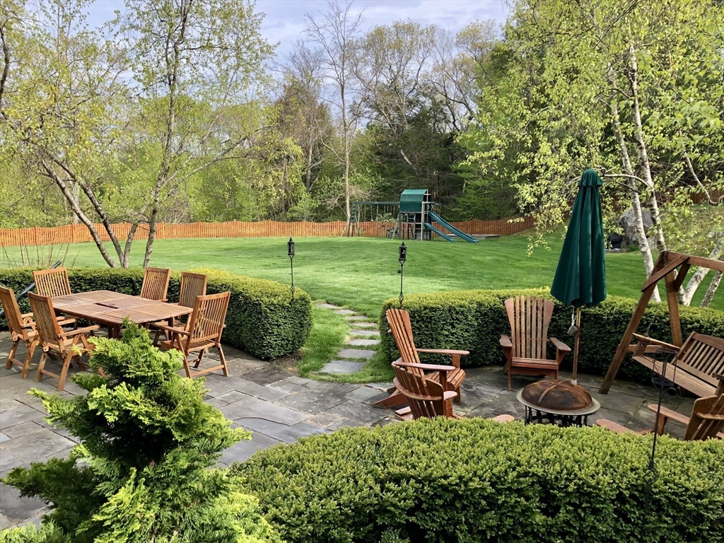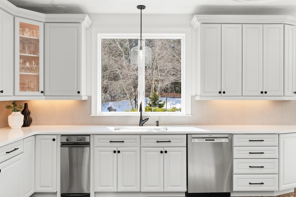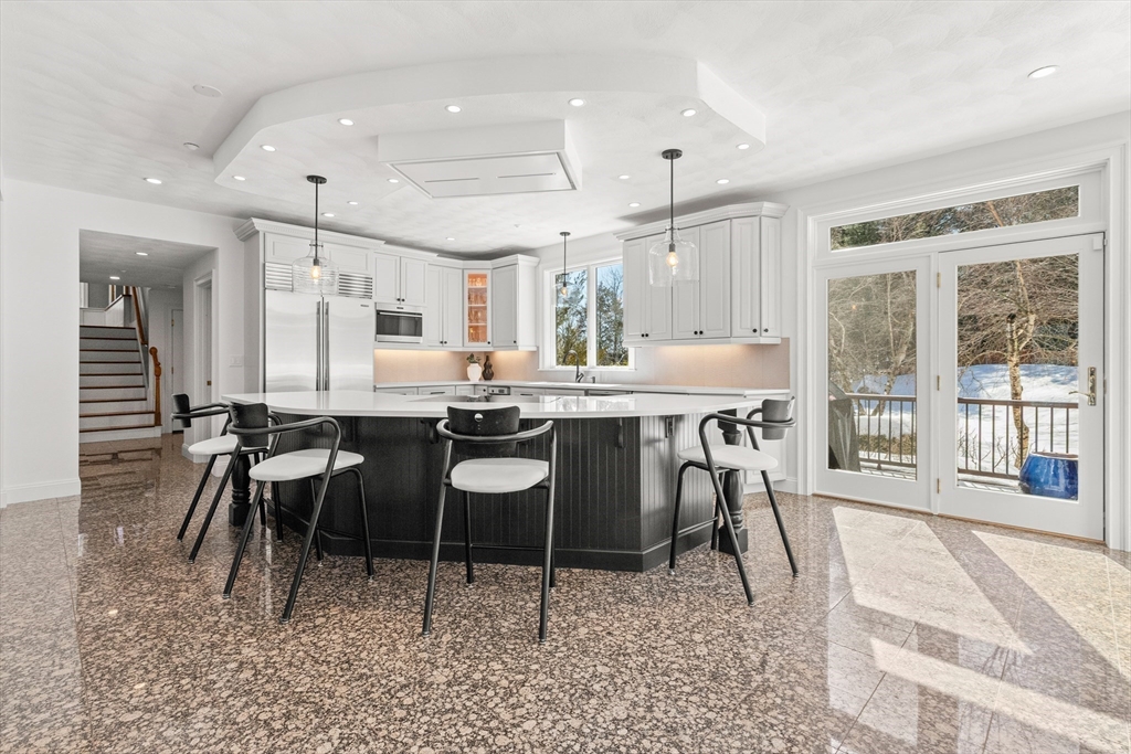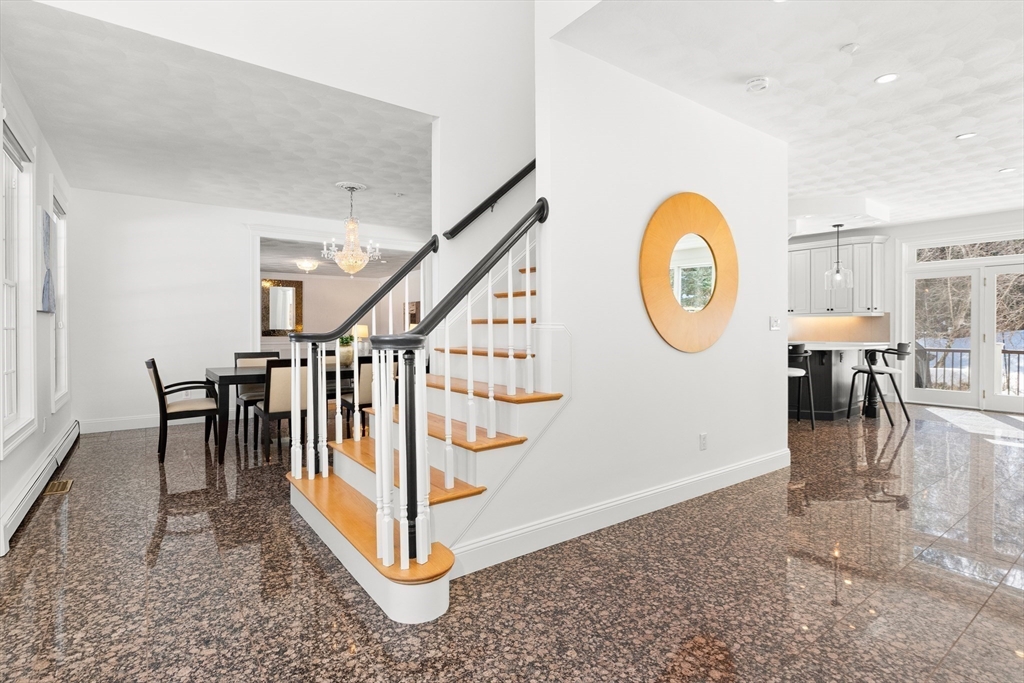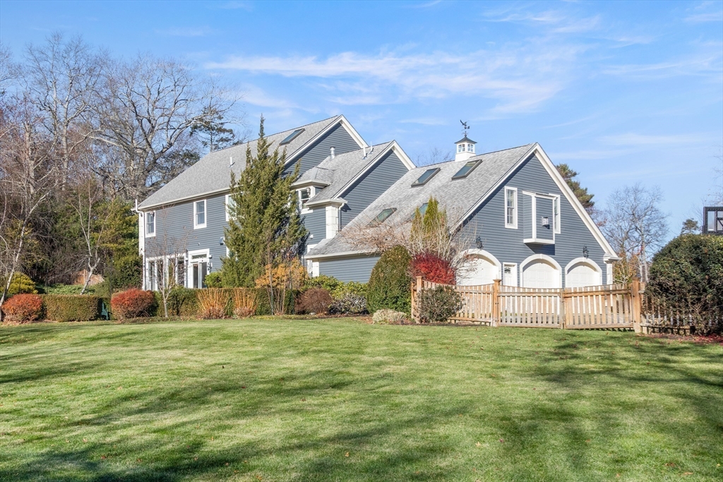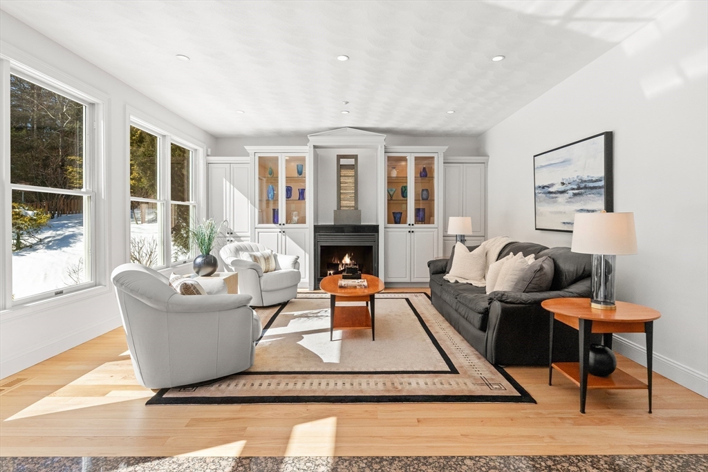 Welcome to your private oasis! This stunning, custom-built Contemporary sits at the end of a private cul-de-sac on the neighborhood's largest lot, perfectly framed by protected conservation land. Step inside to discover a freshly renovated 2024 kitchen boasting high-end appliances, seamlessly flowing into a cozy family room with a fireplace and custom built-ins. Entertain in style in the spacious media room featuring vaulted ceilings and a fireplace, or take the gathering outside to the new deck and spacious stone patio overlooking serene nature. Relax in the expansive primary suite, complete with vaulted ceilings, a gas fireplace, and a large walk-in dressing room. The finished lower level boasts a versatile in-law suite, game room, and exterior access. Enjoy modern peace of mind with new hardwood floors, fresh exterior paint, added insulation, and a heated 3 car garage. Perfectly situated near hiking trails, beaches, Route 128, MBTA, and elite schools (Brookwood, Landmark, Shore).