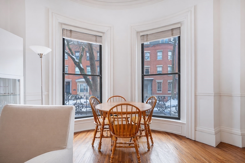 Experience quintessential South End living in this refined parlor-level residence, situated in the coveted Eight Streets neighborhood just steps from Ringgold Park. This sun-drenched floor-through home is defined by its dramatic ceiling height and oversized windows, creating a gracious sense of scale rarely found in one-bedroom layouts. The open-concept living area features a chef-inspired kitchen with updated appliances, a dedicated dining area, and a stately decorative fireplace. The king-sized bedroom serves as a private sanctuary, anchored by a second fireplace and flanked by bespoke custom built-ins. Complete with a modern bath, in-unit laundry, and the invaluable addition of conveying deck rights, this home is a rare find near the city’s premier dining and boutiques.