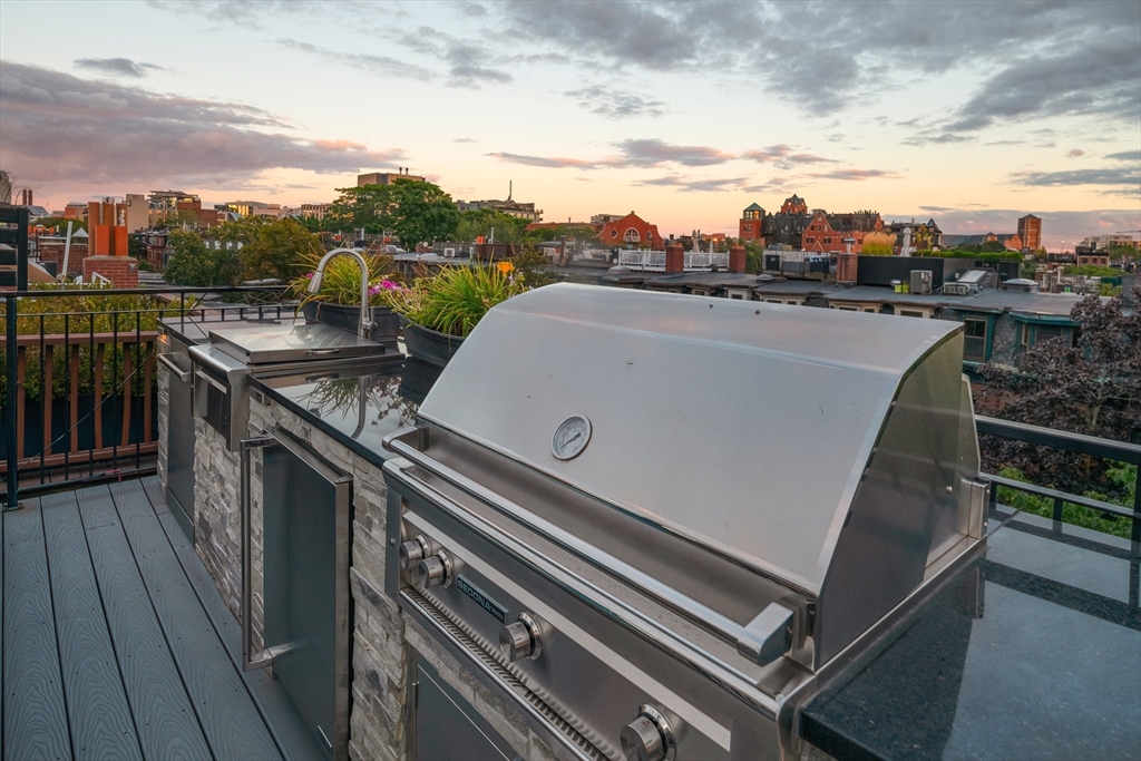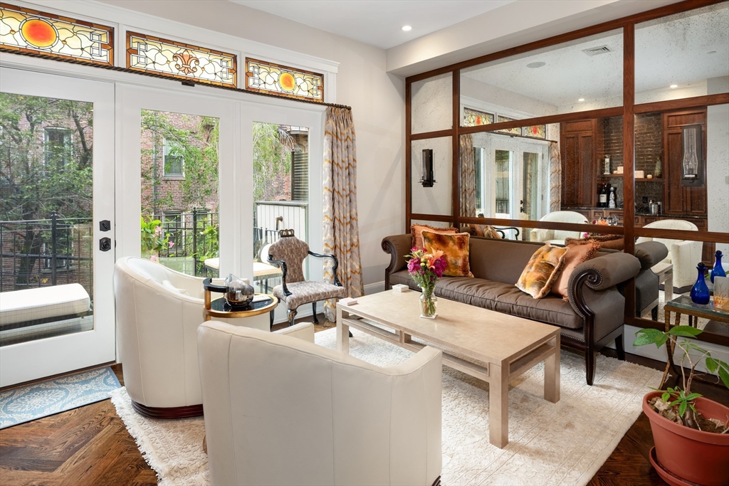 On one of the most sought after blocks in the South End's Golden Triangle, sunny side, sits this single family 5-story bowfront brick row house completed in Spring of 2016, after a 2+ year buildout alongside Daher Interior Design. Stunning open parlor w/wide living room, white oak herringbone floors, open glass metal trimmed stair railings, fireplace with custom stone mantel surround, custom wet bar in back parlor, and a deck. Street level features front facing dining space, custom built-ins + shelving from dining, through a spacious sitting area with fireplace, large kitchen, perfectly integrated wine closet, stunning powder room, and a deck. Lower level family room with wet bar and fireplace, full bath, laundry, bedroom, and access to garden. Floor above parlor is a master suite with office/baby room, fireplace, walk through closet, 5-piece bath, and a 2nd laundry closet completes this floor. Top floor has 2 bedrooms (one en-suite)and full staircase to roof deck with TV and kitchen.