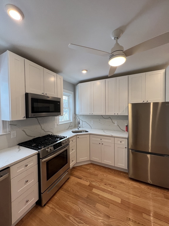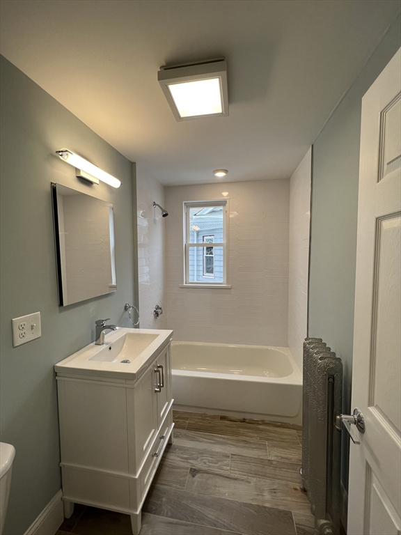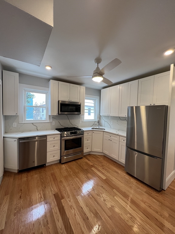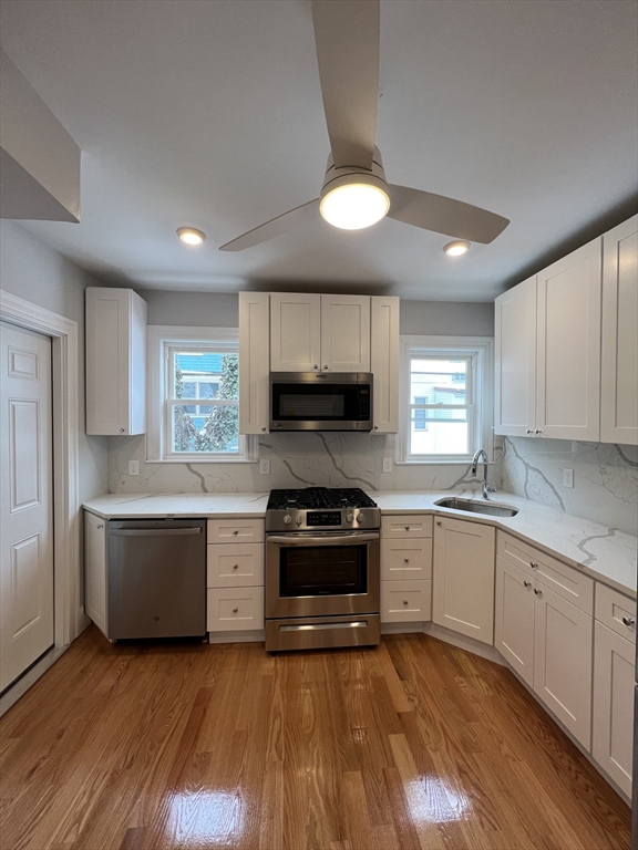 Tufts/Davis Square. Closest train = Davis Square (Red Line). 3 bed/2 bath (second floor unit). Separate living room. Updated eat-in-kitchen (granite countertops, stainless-steel appliances, modern cabinets). Hardwood floors throughout. Shared rear enclosed porch. Street parking with City permit. Yard.
