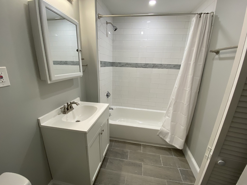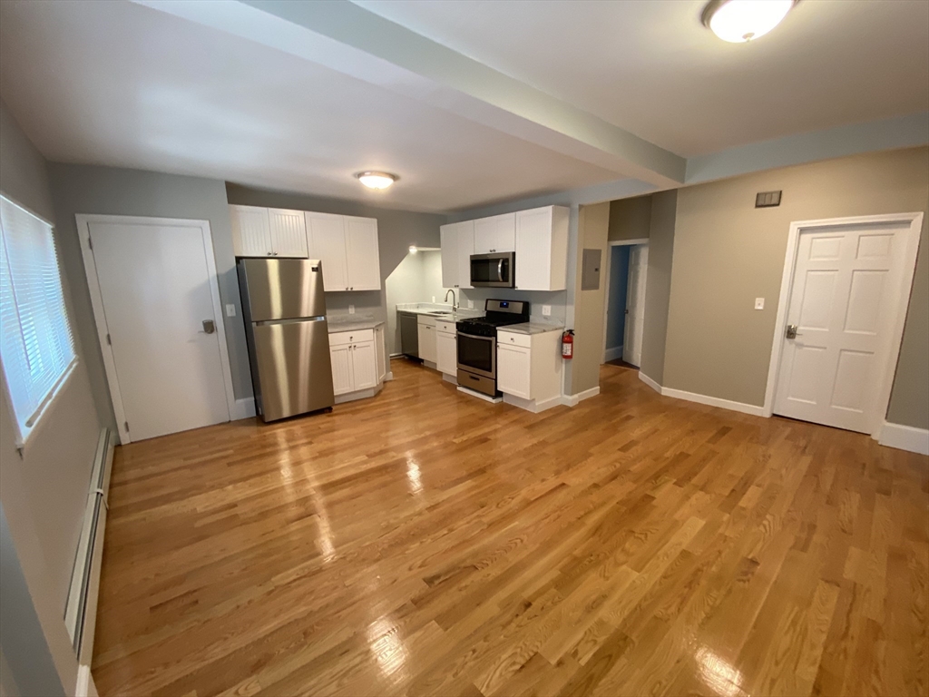 Davis Square. Closest train = Davis Square (Red Line T). 3 bed/1 bath (second floor). Modern eat-in-kitchen with new stainless-steel appliances. Modern tiled bathroom. Refinished hardwood floors throughout. Gorgeous white-granite counters. In-unit laundry. Street parking with City permit. Driveway parking available for rent.