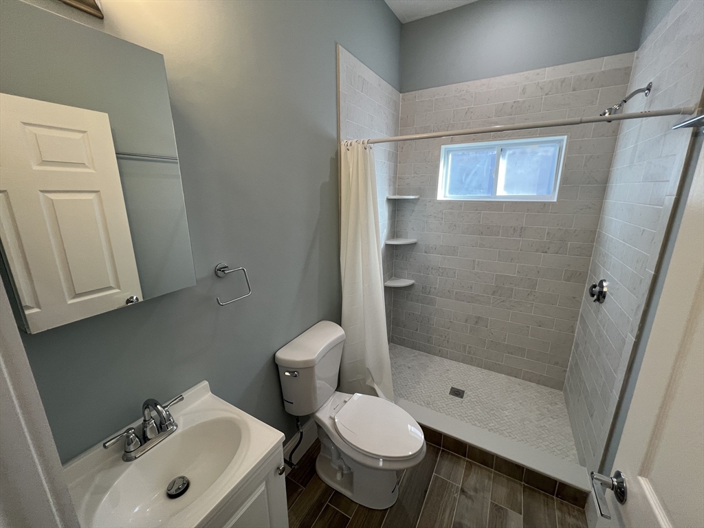 Spring Hill/Magoun Square. Closest train = Magoun Square (Green Line T). 3 bed/2 bath (first floor). Everything renovated in 2022. Modern kitchen with beautiful cabinets, stainless steel appliances, and gorgeous white-granite counters. In-unit laundry. Modern/tiled bathrooms. Hardwood floors throughout. Central heat/ac. Private rear deck. Street parking with City permit. Off-street parking for rent.