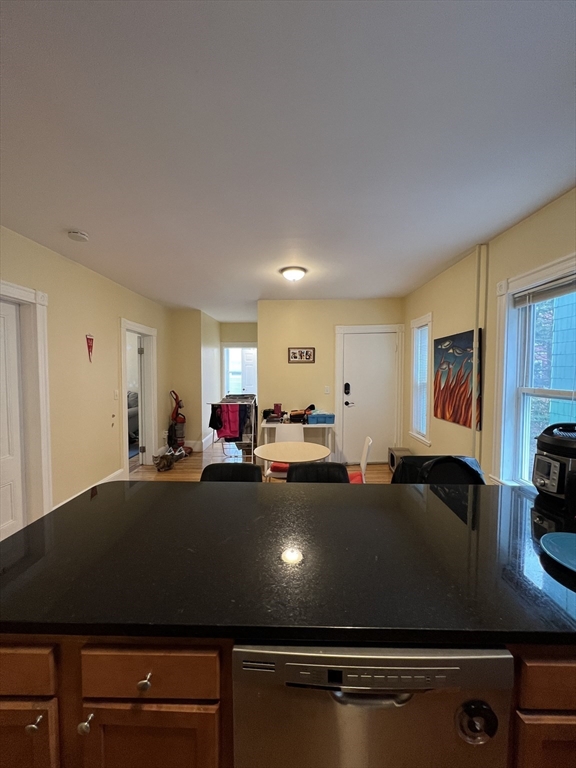Davis Square. Closest train = Davis Square (Red Line T). 4 bed/2 bath (second floor). Renovated in 2018. Open modern kitchen/living room (granite counters, stainless steel appliances, newer cabinets). Modern and updated tiled bathrooms. Laundry in-unit. Hardwood floors throughout. Extra bonus room/sunroom. Street parking with City permit.
