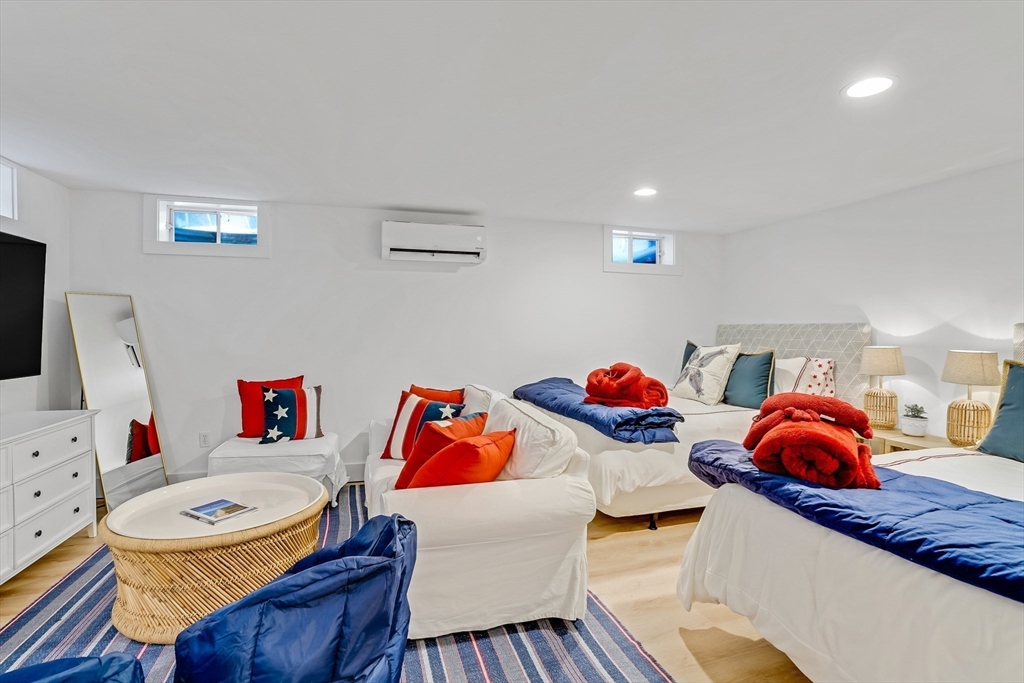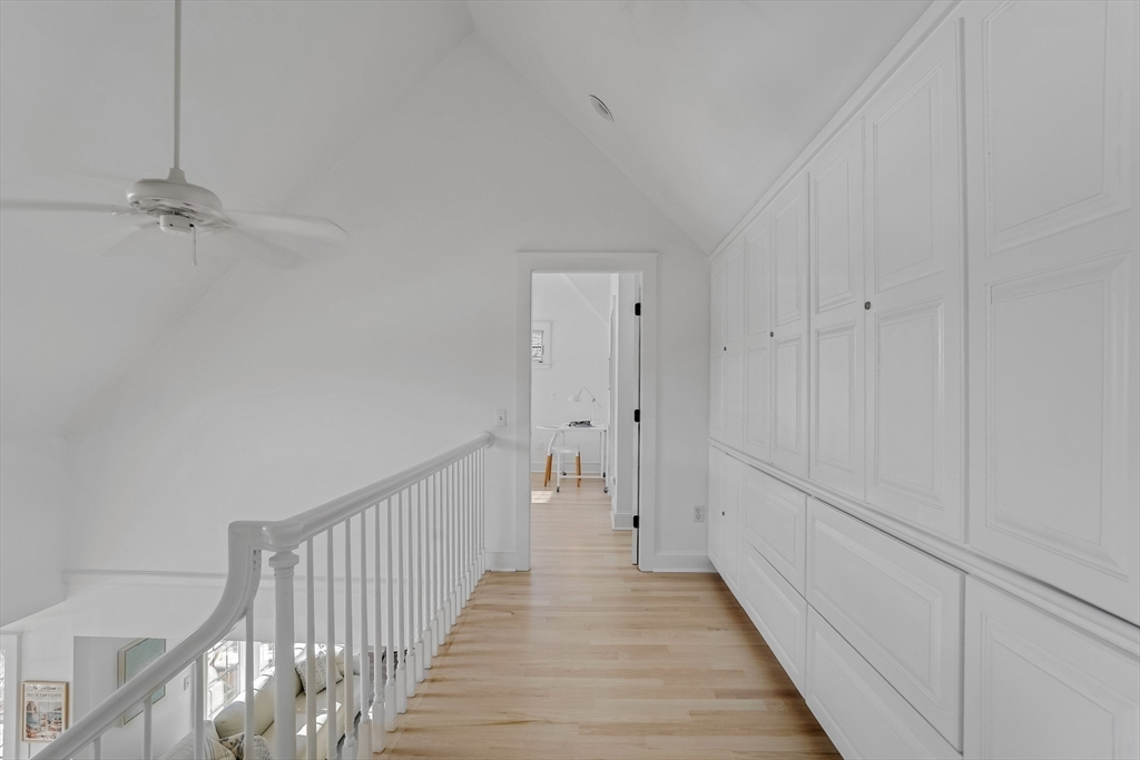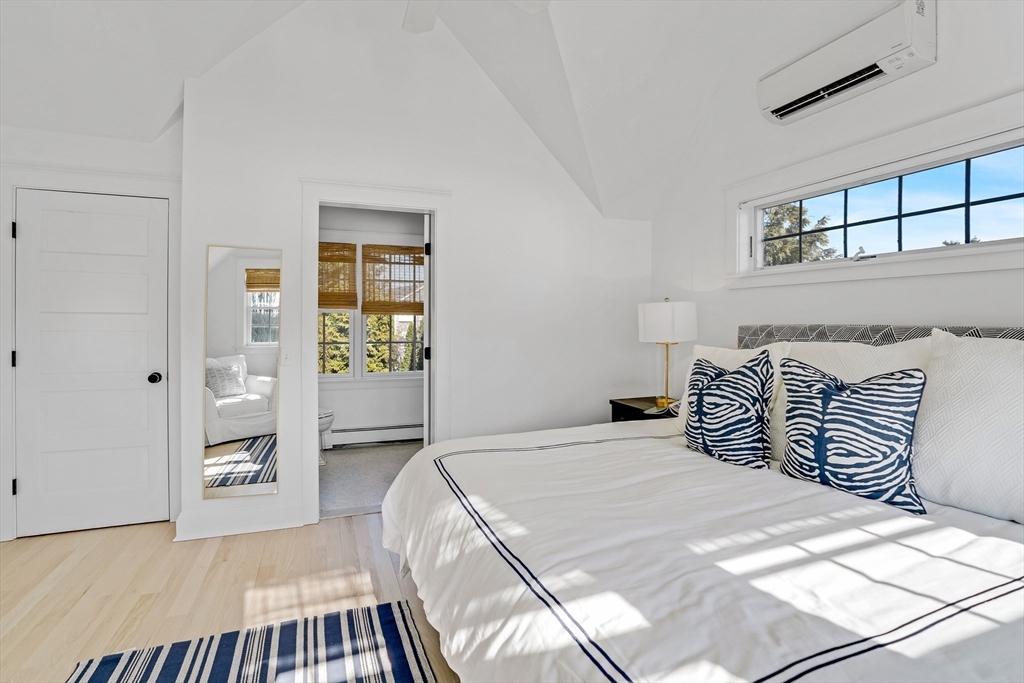 This updated classic cottage is located in the heart of Edgartown Village, less than a quarter mile from Main Street. Upon arrival, you are welcomed by a spacious front porch and elegant French door entry that lead into a dramatic foyer. The light-filled open floor plan seamlessly connects the kitchen, dining, and living areas, creating an inviting space for everyday living and entertaining. The first floor opens to a charming brick terrace and fenced backyard, an ideal setting for outdoor gatherings.The swimming pool serves as the centerpiece of this private outdoor retreat. This delightful cottage features four bedrooms, each with its own full bath, including a convenient first-floor primary bedroom suite. An elegant staircase leads upstairs to two spacious bedrooms with private baths. A charming balcony separates the bedrooms and is lined with a wall of ample storage closets, blending style with exceptional functionality.The partially finished lower level adds over 500 s.f.