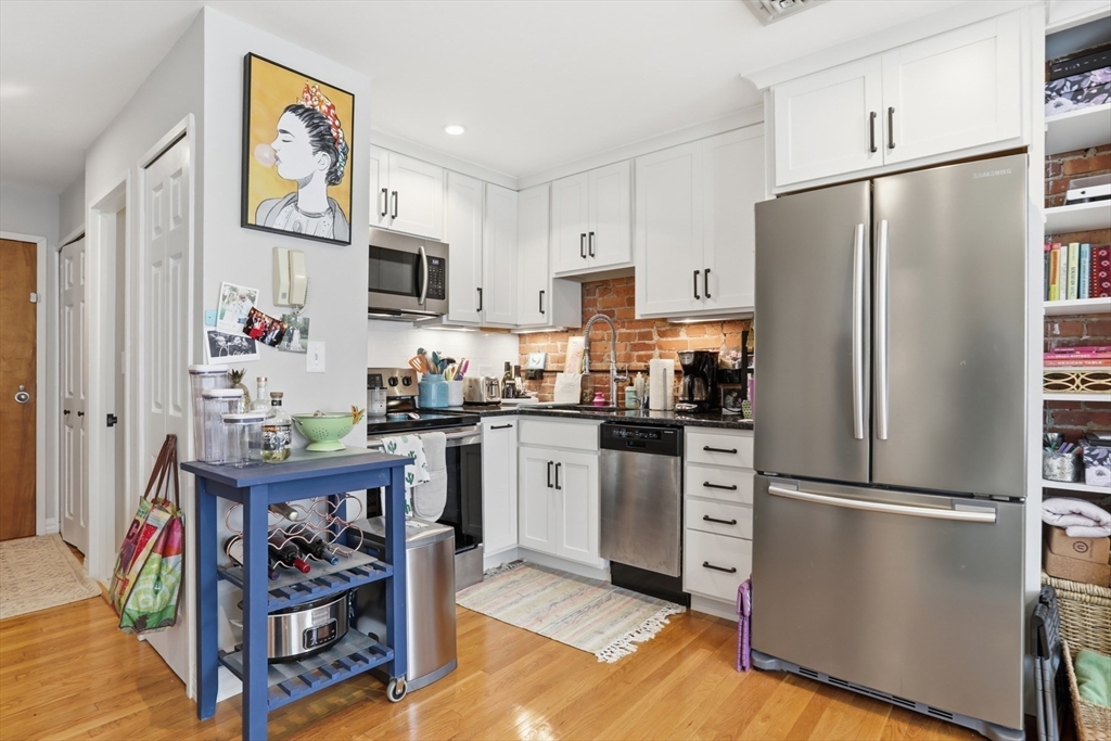 Sunny-side, front-facing third-floor unit in elevator building on Gainsborough Street available for May 1st lease start date. Beautifully renovated, this home features an open-concept layout, hardwood floors, and recessed lighting throughout. The kitchen is set against an exposed brick wall and outfitted with all-white American Woodmark cabinetry, steel gray granite countertops, and stainless steel appliances. Relax by the fireplace or enjoy views of the tree-lined street through one of two oversized bay windows in the living area. The tiled bathroom offers a glass-enclosed shower with dual shower heads, and the generously sized bedroom features floor-to-ceiling exposed brick and custom built-in closets. Additional highlights include central air and in-unit laundry. Ideally located just off Storrow Drive at the crossroads of Northeastern, Fenway, and Back Bay, it truly is a commuter’s dream. This unit checks all the boxes and is not to be missed!