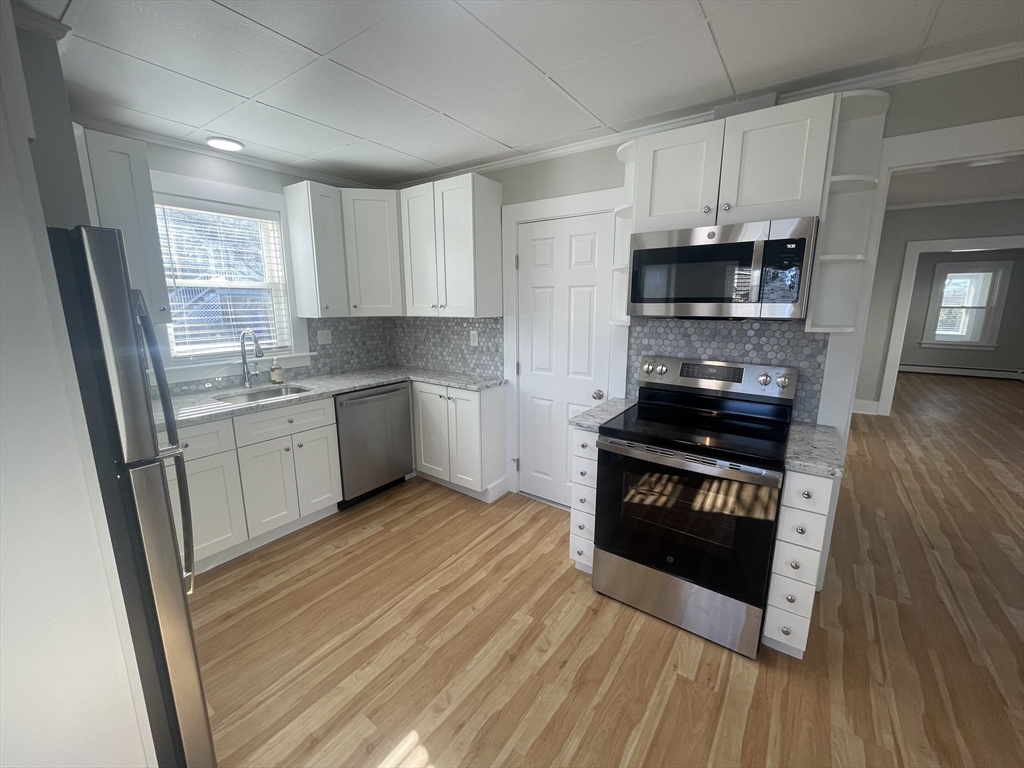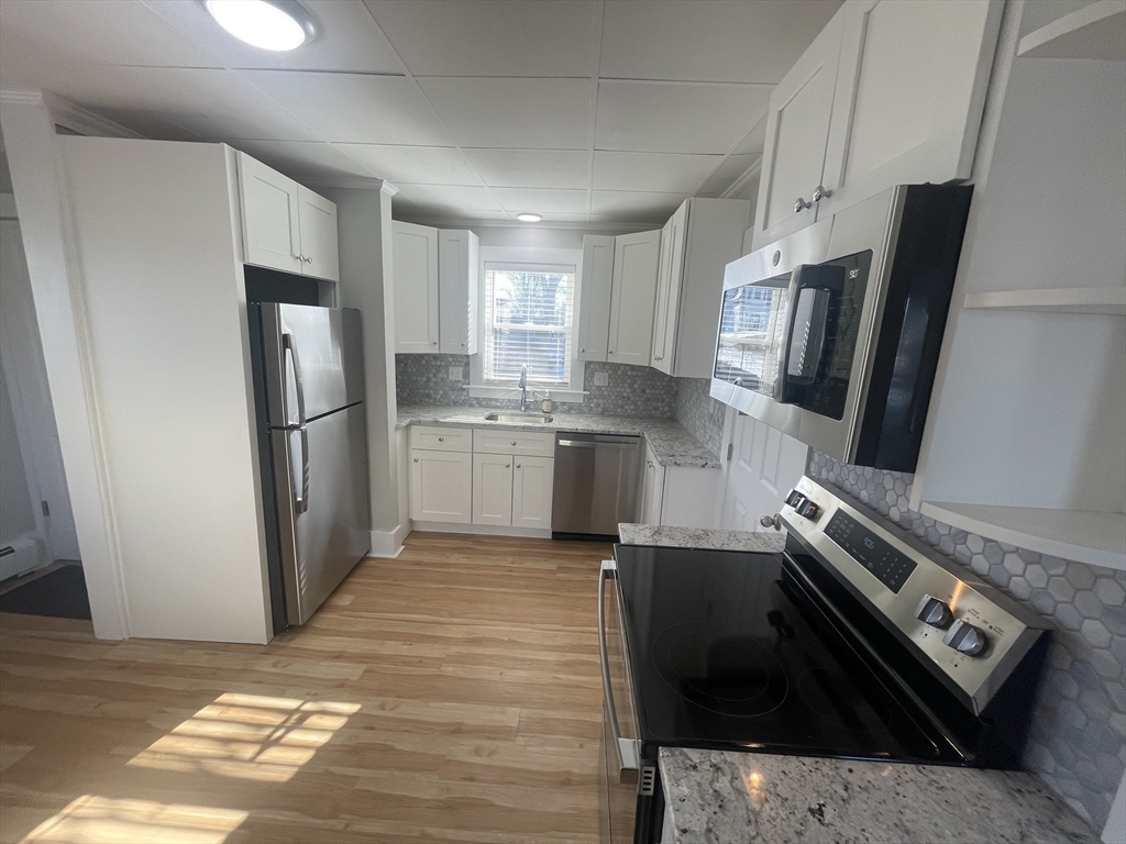 SHOWINGS BEGIN AT OPEN HOUSE SUNDAY MARCH 15th 11am to 12pm~WELCOME HOME to this REMODELED LIKE NEW SINGLE FAMILY HOME~NOTHING TO DO BUT BUY, PACK, AND MOVE-IN~Greeted by the Front Entry w/NEW Granite & Brick Steps~7 ROOM/4 Bedrooms/2 Bathrooms~Approx. 1,500' of living space~Kitchen w/NEW White slow closure dove tailed cabinets, Granite Counters, Tile Backsplash, SS Appliances, NEW Stackable electric Washer & Dryer~NEW 200amp electric service~Forced Hot water heat & Hot water tank by natural gas~Insulated, New piping for water~NEW Tile Flrs, LVT, & Hardwood Flrs~HEATED ENCLOSED FRONT PORCH just the right place for morning coffee~Property is Fenced in perfect for gatherings~NEW Roof, NEW Windows, & NEW Exterior Doors, NEW Driveway~Landscaping~NEW Blinds throughout~TOWN WATER/TOWN SEWER/NATURAL GAS~CLOSE to everything~Schools, Shopping, Restaurants, Rt 495....Don't wait be in for Spring!!!!