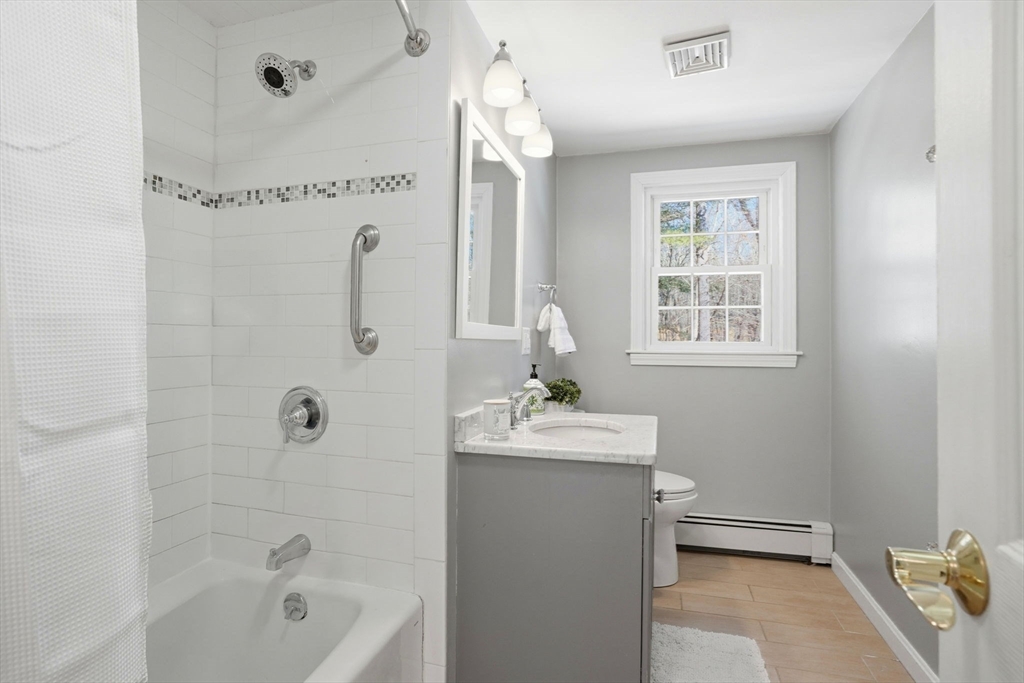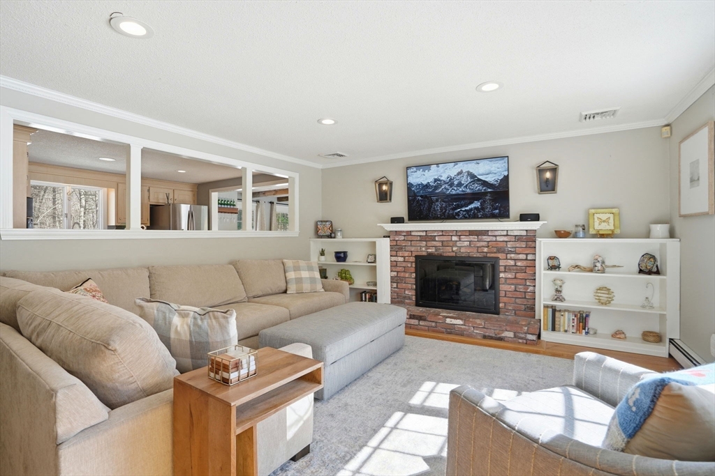 In the heart of Duxbury and abutting conservation land trails, this move-in ready home offers easy one-level living with convenient access to schools, beaches, shops, restaurants and commuter routes. The main level features three bedrooms, one and a half baths, laundry room and a family room with gas fireplace and built-in shelving. The kitchen has a center island and granite counters and opens to the dining room with beamed ceiling, bay window and deck access. The four-season sunroom overlooks the backyard with built-in fire pit and Cape Cod-style outdoor shower. Need more space? The finished walk-out basement adds flexible living space with playroom, office and storage. Looking for even more potential? A walk-up attic offers expansion possibilities. Central air and natural gas heat provide year-round comfort. Improvements include a new septic system (2023) and hot water heater. A wonderful, tranquil setting for easy living and close to all that Duxbury has to offer
