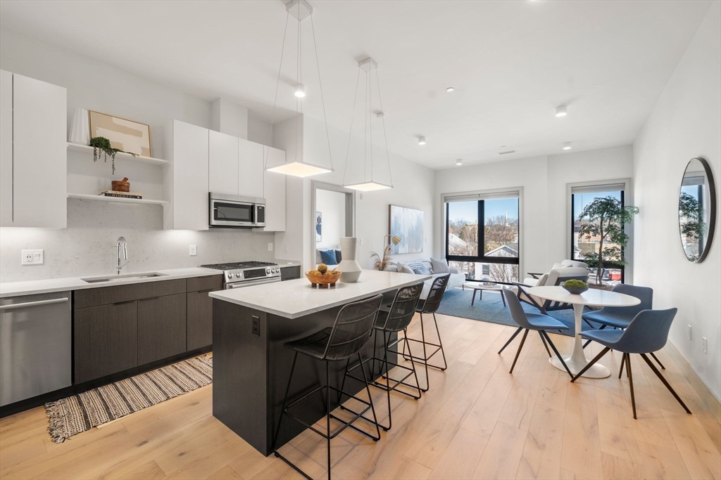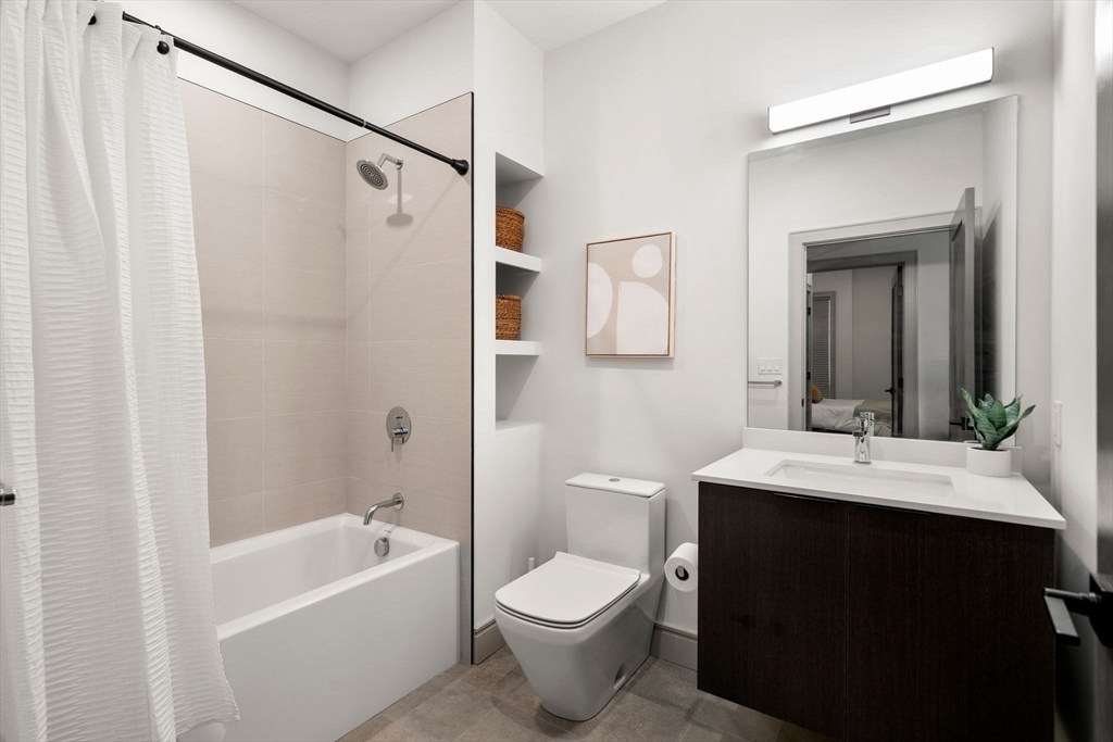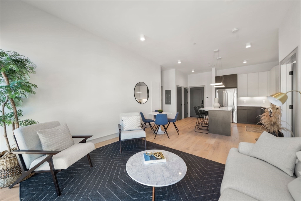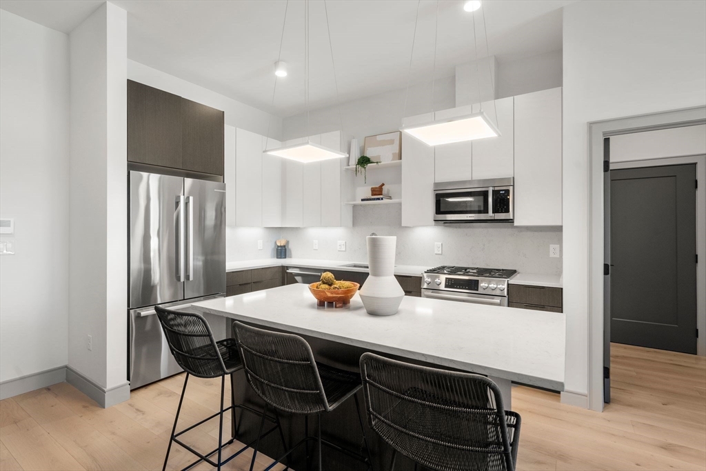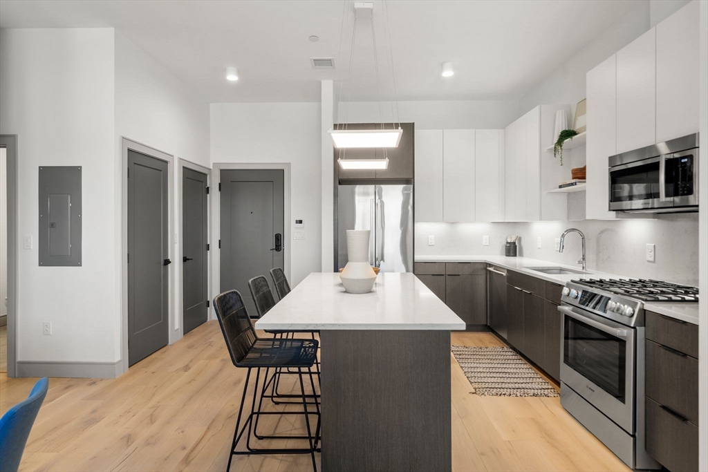 Welcome to this penthouse residence at The Beacon. Thoughtfully laid out for both comfort and functionality, the home features an open-concept kitchen, dining, and living area that flows seamlessly together. Expansive windows flood the space with natural light, creating an airy and inviting atmosphere. The two bedrooms are generously sized and positioned on opposite sides of the condo for added privacy. The primary suite offers a spa-like en-suite bath complete with a walk-in glass shower and double vanity. The second bedroom easily accommodates a queen-sized bed and includes a spacious closet. A full guest bathroom is conveniently located off the hallway. To top off this home, one parking space is included and two guest parking spaces. Residents of The Beacon enjoy an impressive lineup of amenities, including a common rooftop deck, a fitness center, touchless entry, a stylish lounge, and dedicated WFH spaces.
