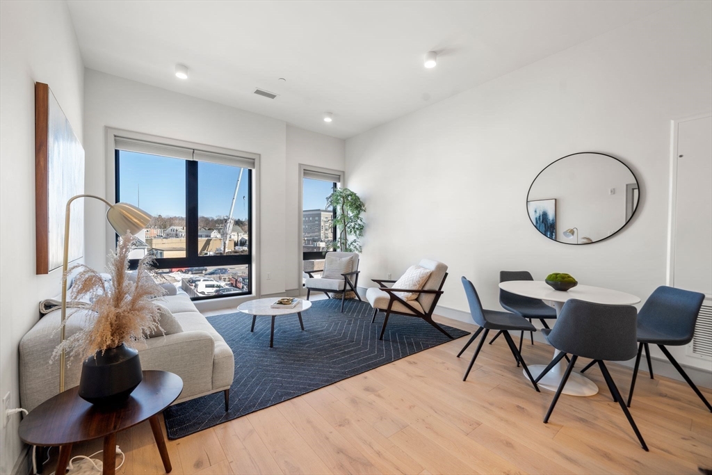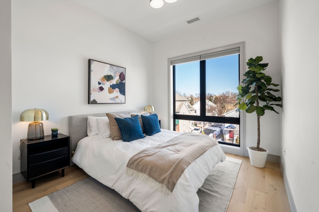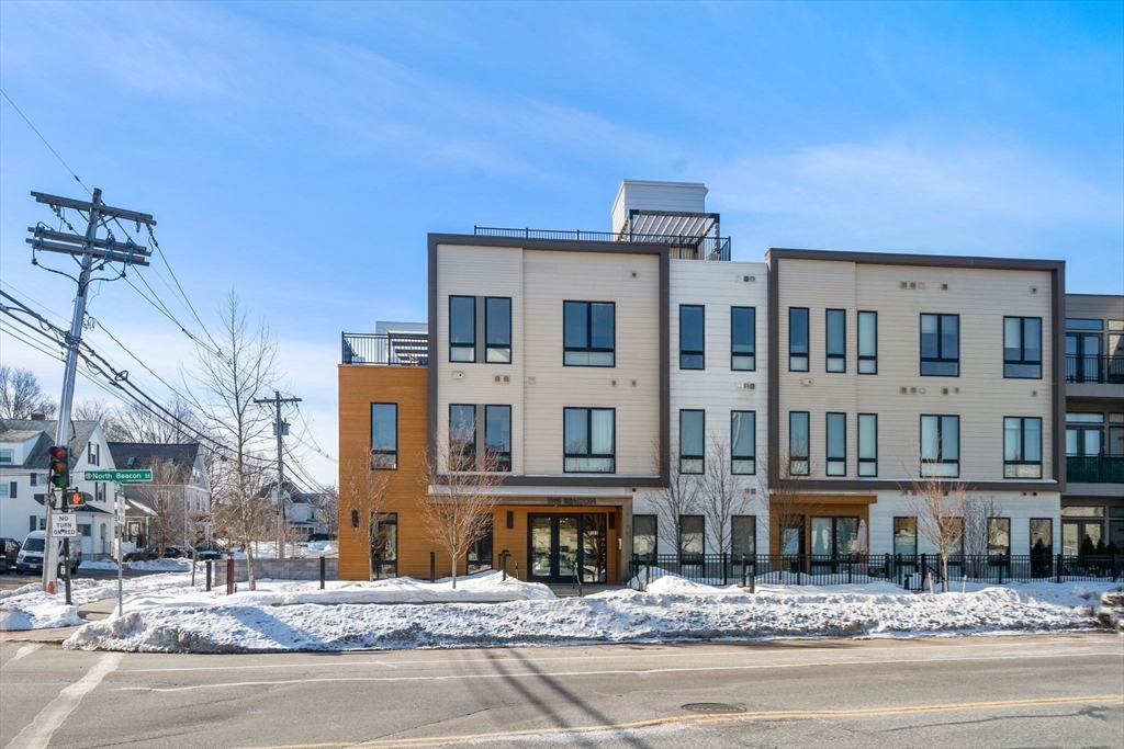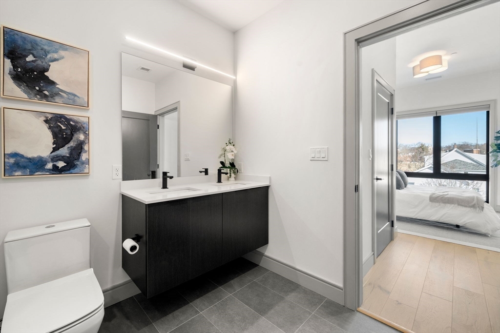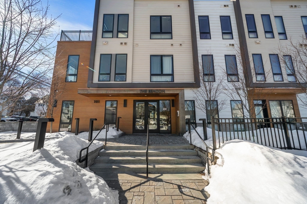 Welcome to this penthouse residence at The Beacon. Thoughtfully laid out for both comfort and functionality, the home features an open-concept kitchen, dining, and living area that flows seamlessly together. Expansive windows flood the space with natural light, creating an airy and inviting atmosphere. The two bedrooms are generously sized and positioned on opposite sides of the condo for added privacy. The primary suite offers a spa-like en-suite bath complete with a walk-in glass shower and double vanity. The second bedroom easily accommodates a queen-sized bed and includes a spacious closet. A full guest bathroom is conveniently located off the hallway. To top off this home, one parking space is included and two guest parking spaces. Residents of The Beacon enjoy an impressive lineup of amenities, including a common rooftop deck, a fitness center, touchless entry, a stylish lounge, and dedicated WFH spaces.