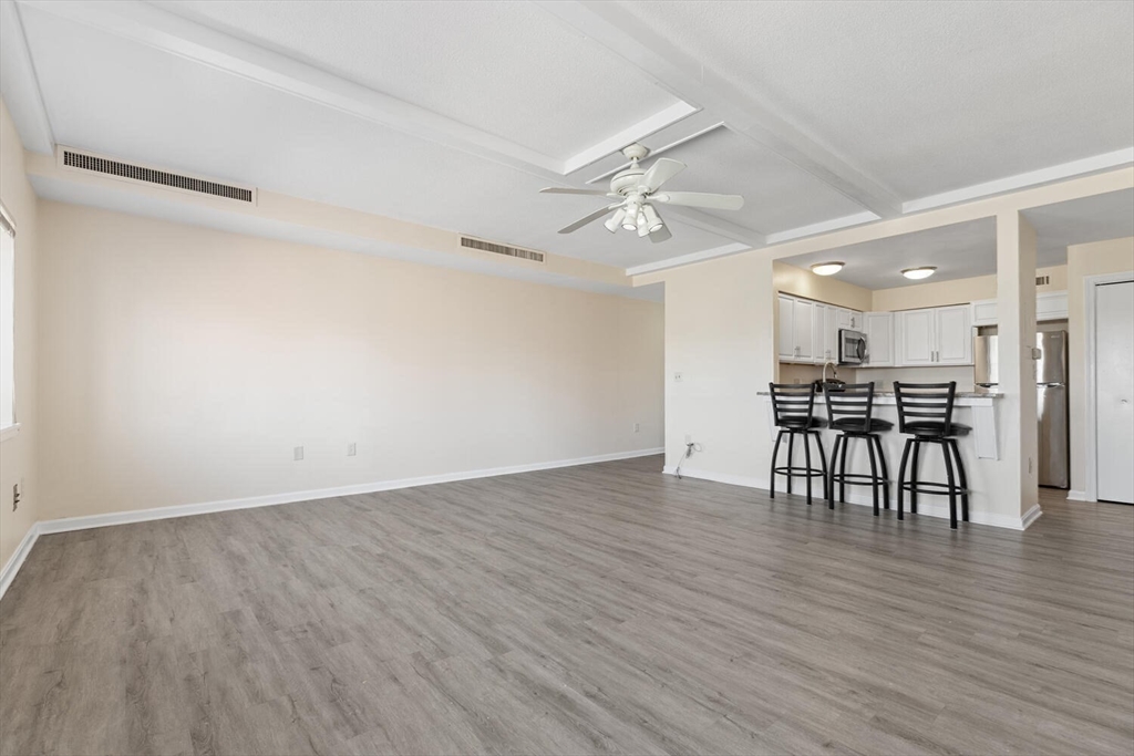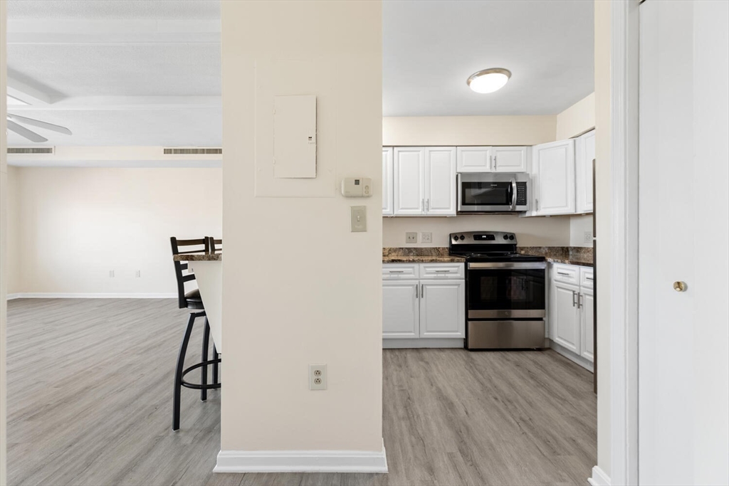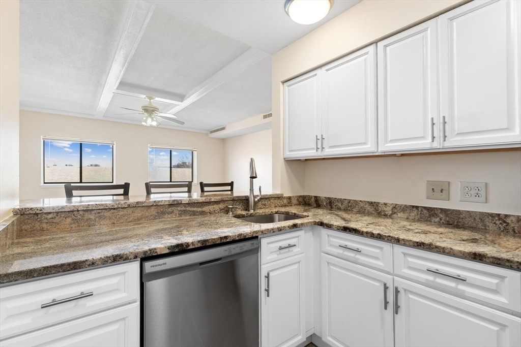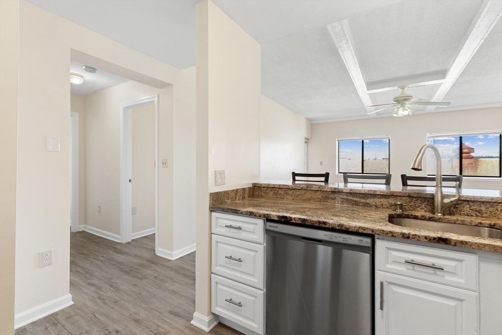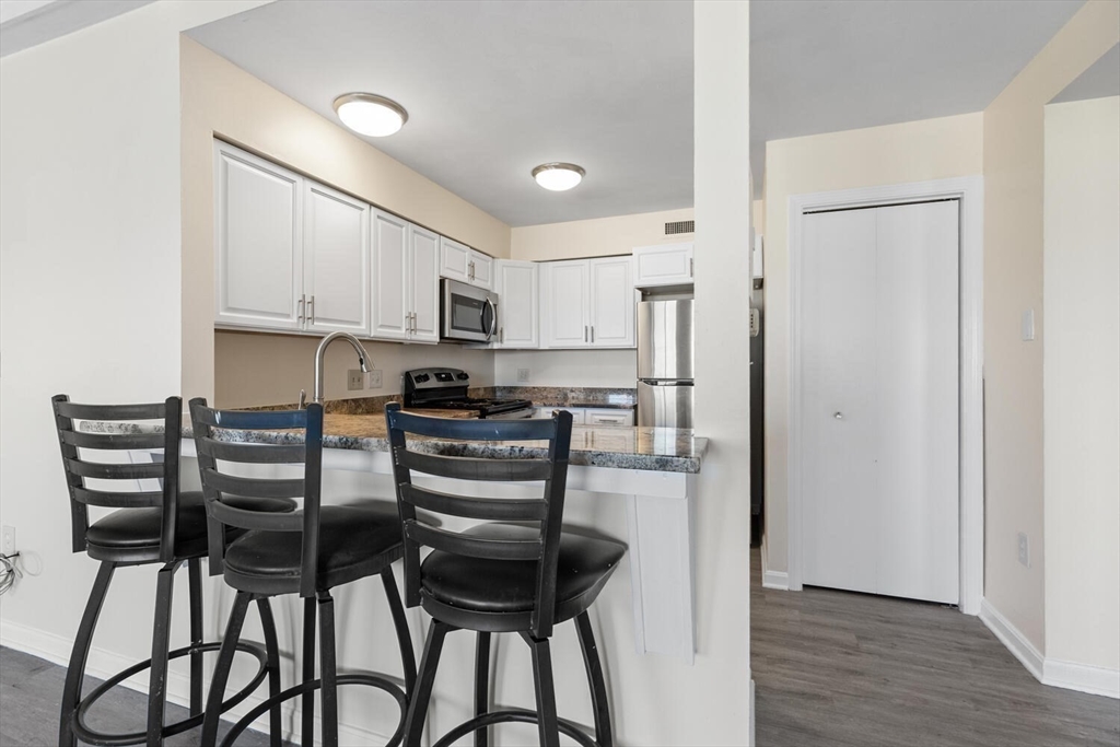 The residence at 50 South Common St in Lynn, presents an exceptional opportunity for refined condominium living. Within its 1075 square feet of thoughtfully designed living space, this condominium features two well-proportioned bedrooms, & two baths. Master bedroom is en-suite with private bathroom, walk in closet, & sliders out to the balcony. Updated Kitchen with granite counters, Breakfast Bar & stainless-steel appliances. Open concept to the dining & living room with freshly painted walls & new vinyl flooring throughout. In unit laundry hook up for stackable washer, & dryer. One deeded parking space in underground garage parking space number 106. Coin operated laundry in basement laundry room. Storage unit in basement as well. Storage space in basement. This is a Penthouse unit is on the fifth floor of a five-story residence. This condominium offers a carefree living experience. Close to all amenities, shopping, restaurants, beaches, ferry, train station, airport, and Boston.