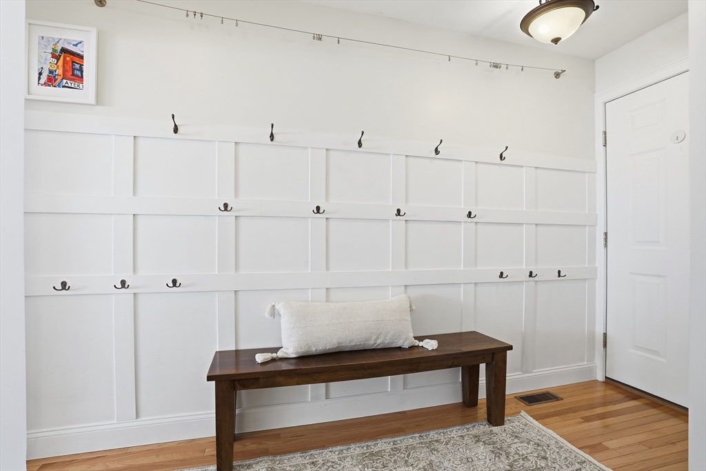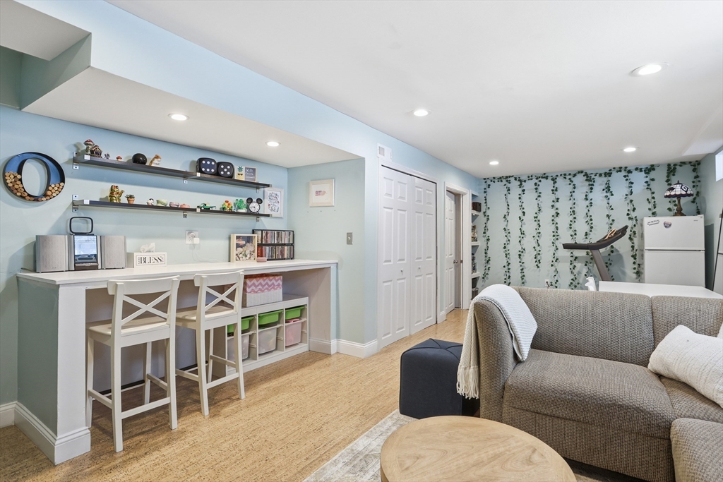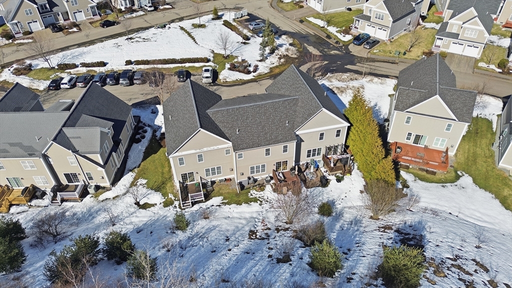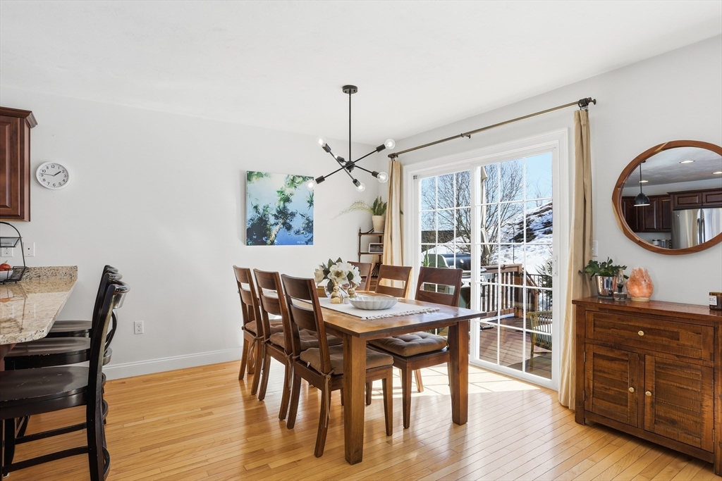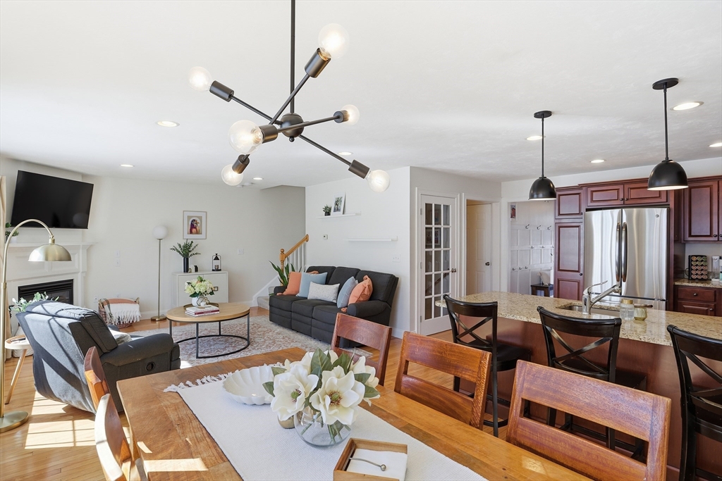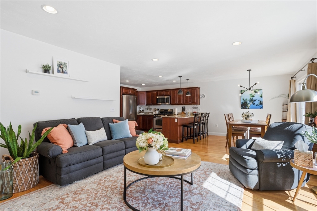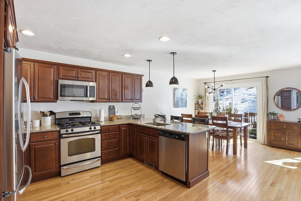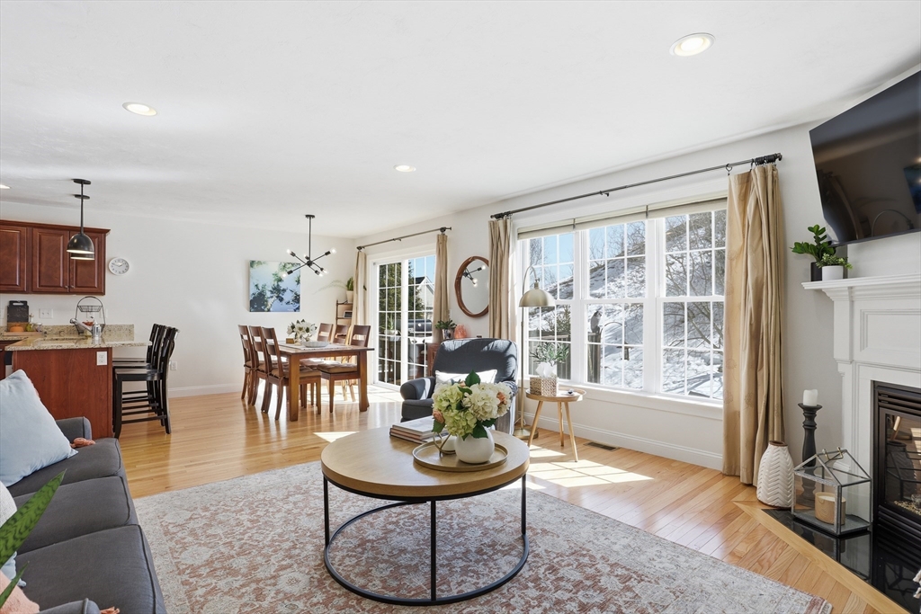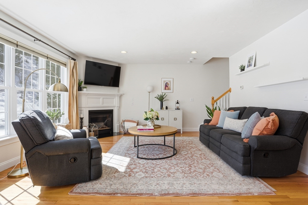Welcome to The Willows! This freshly painted, stunning 3-bed, 2.5-bath home features nearly 2,100 sq ft of thoughtfully designed living space. The open-concept main level showcases a gorgeous kitchen with granite countertops, stainless steel appliances, a walk-in pantry, and a breakfast bar. The sun-filled living room and dining area feature a cozy gas fireplace and hardwood flooring throughout. A dedicated home office completes the main level. The sliding door leads to your private deck, perfect for summer grilling and entertaining. Upstairs, the spacious main suite offers a walk-in closet and a full bath. Two additional generously sized bedrooms, a second full bath, and a separate laundry room complete the second level. The partially finished basement serves as a flexible family/game room. Conveniently located minutes from I-495, Rt 2, commuter rail, shopping, and dining.