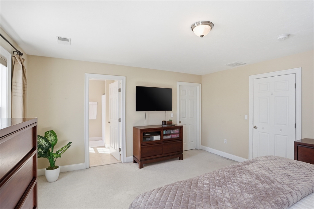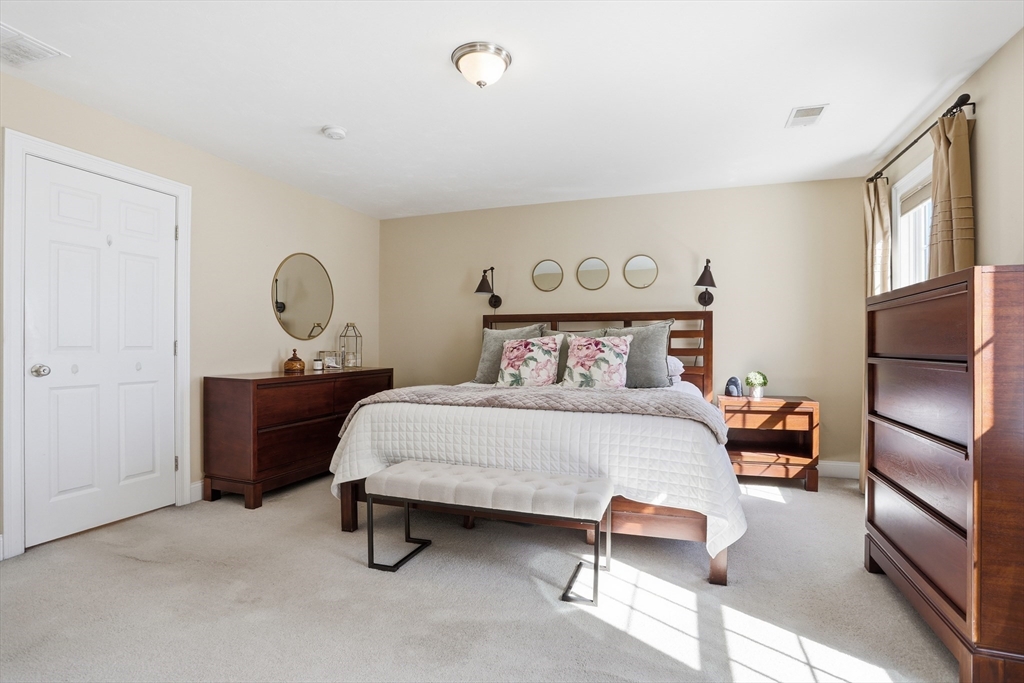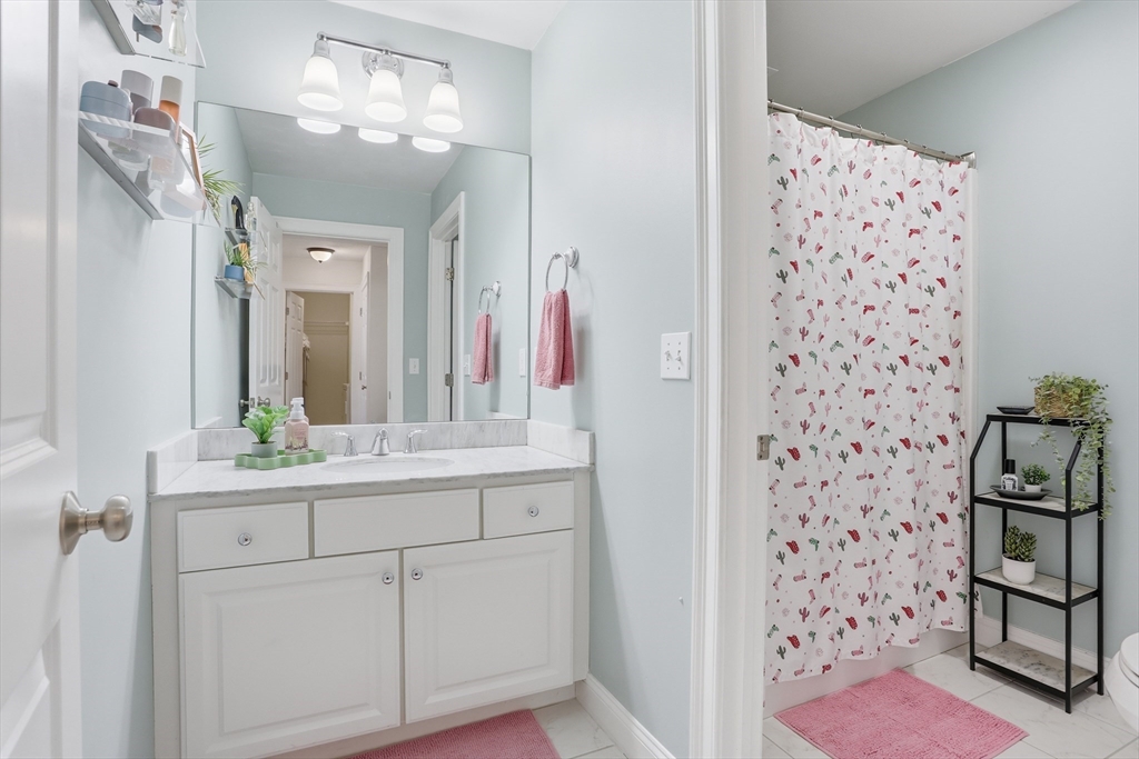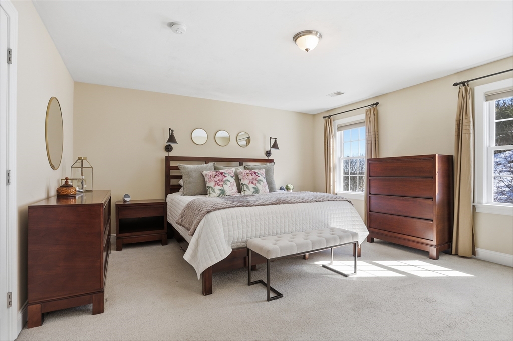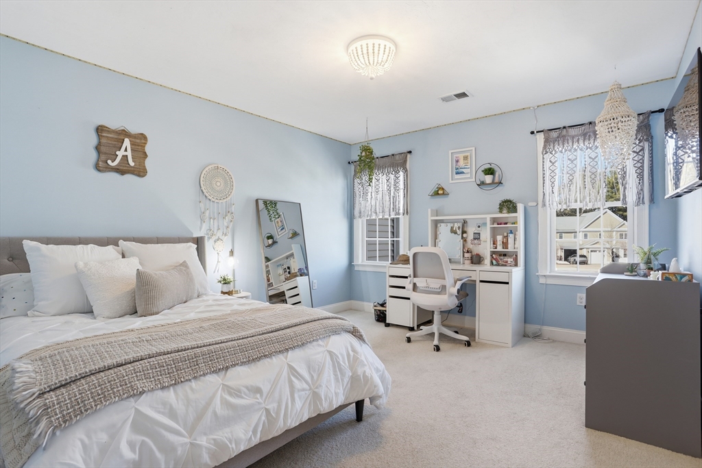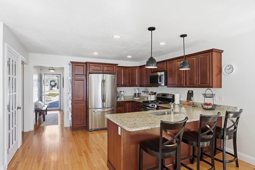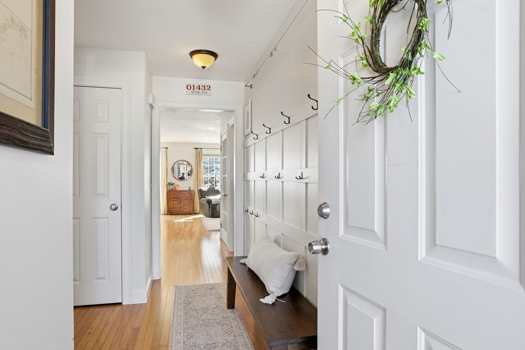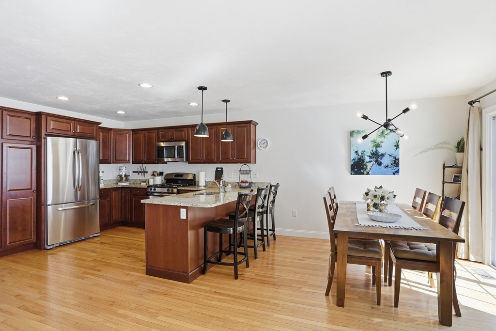 Welcome to The Willows! This freshly painted, stunning 3-bed, 2.5-bath home features nearly 2,100 sq ft of thoughtfully designed living space. The open-concept main level showcases a gorgeous kitchen with granite countertops, stainless steel appliances, a walk-in pantry, and a breakfast bar. The sun-filled living room and dining area feature a cozy gas fireplace and hardwood flooring throughout. A dedicated home office completes the main level. The sliding door leads to your private deck, perfect for summer grilling and entertaining. Upstairs, the spacious main suite offers a walk-in closet and a full bath. Two additional generously sized bedrooms, a second full bath, and a separate laundry room complete the second level. The partially finished basement serves as a flexible family/game room. Conveniently located minutes from I-495, Rt 2, commuter rail, shopping, and dining.