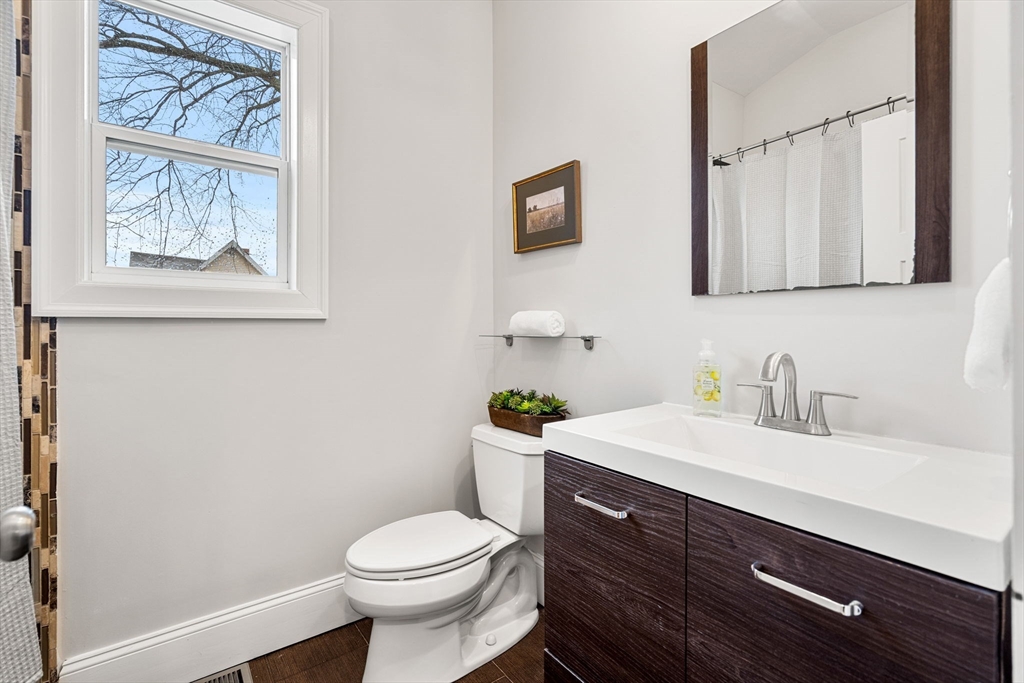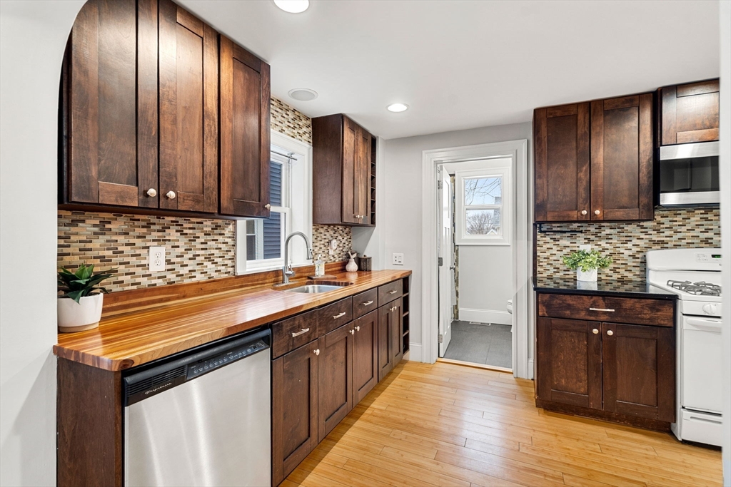 This well maintained and freshly painted two-level condo offers 5 rooms, 2 bedrooms, and 2 full baths, all thoughtfully designed for comfort and flow. The main level features a bright living room with lg windows off an open foyer, which connects to the primary bedroom and full bath. The spacious eat-in kitchen is a true highlight, outfitted with stainless steel appliances, quartz and butcher block countertops, and a generous dining area—perfect for everyday cooking or hosting. An airy office nook sits by the french doors, creating a great spot for work or creative projects. From here, step right out to the private deck and shared yard for effortless outdoor dining and relaxation. A staircase off the kitchen leads to the finished lower-level, complete with a second bedroom, 3/4 bath w/laundry, and access to storage and utilities. This level also includes a full-size door to the yard for added convenience. A 5 minute walk to the Green Line. One off street parking spot.