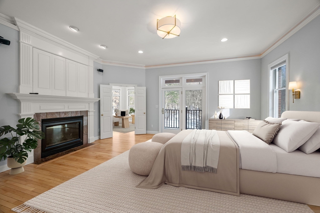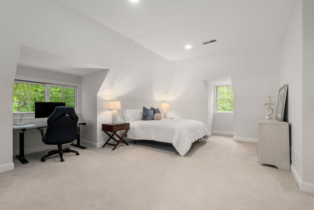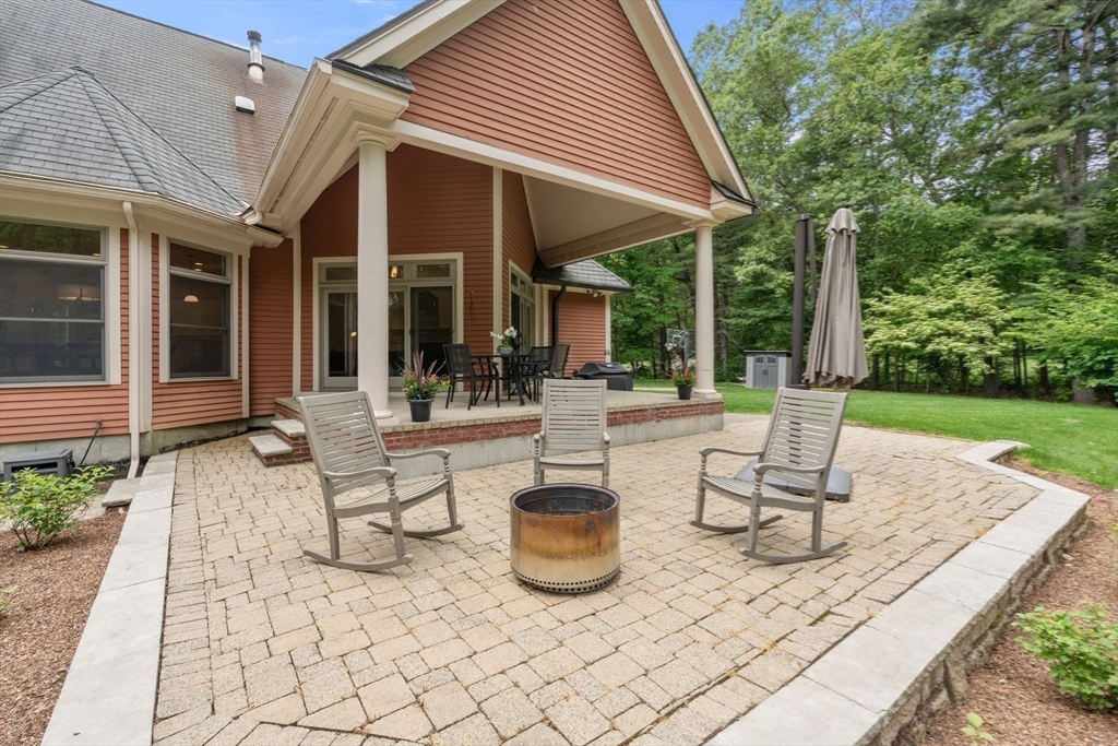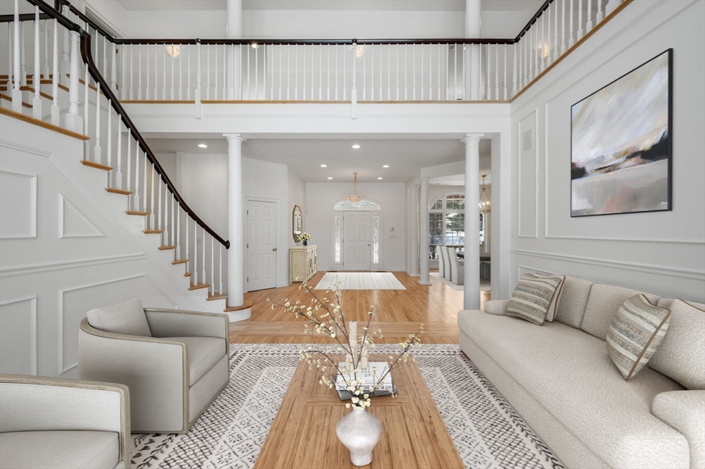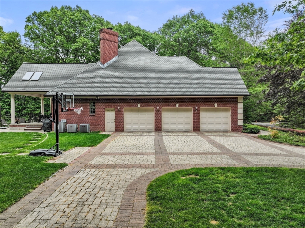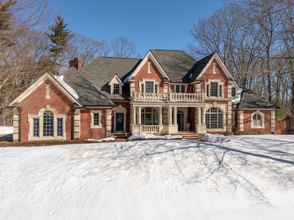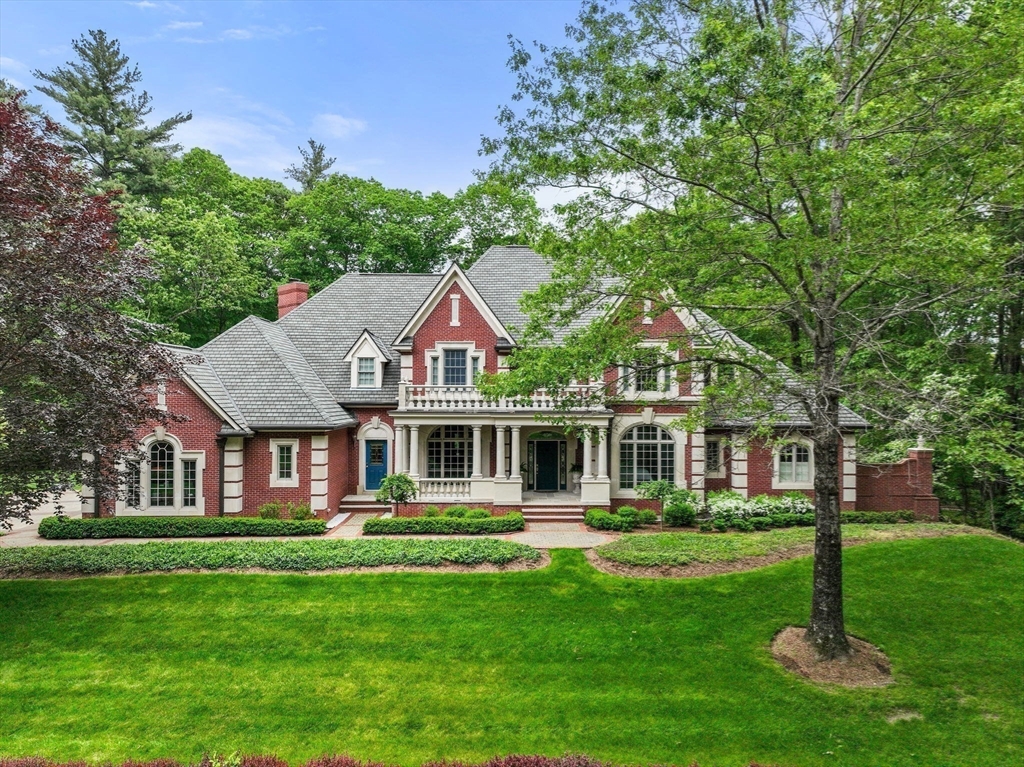 Rare offering in Monument Farm: custom brick Colonial with first-floor primary on 2 private acres. Privately set in one of Concord’s most sought-after neighborhoods, this home offers elegant architecture and a flexible layout for modern living. The main level features a dramatic two-story living room, updated kitchen with quartz counters + sunlit breakfast area, and a vaulted family room opening to a covered stone patio for seamless indoor-outdoor entertaining. A coveted first-floor primary suite with adjoining study, along with a guest suite, provides exceptional flexibility. Upstairs are three additional bedrooms, two full baths, and a versatile loft. The finished lower level includes media, exercise, and recreation spaces. Located on a quiet cul-de-sac with direct access to Estabrook Woods trails, this well-maintained home offers privacy, comfort, and timeless appeal.