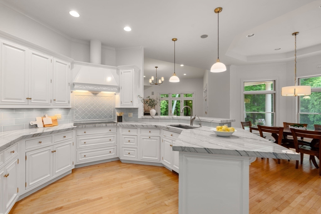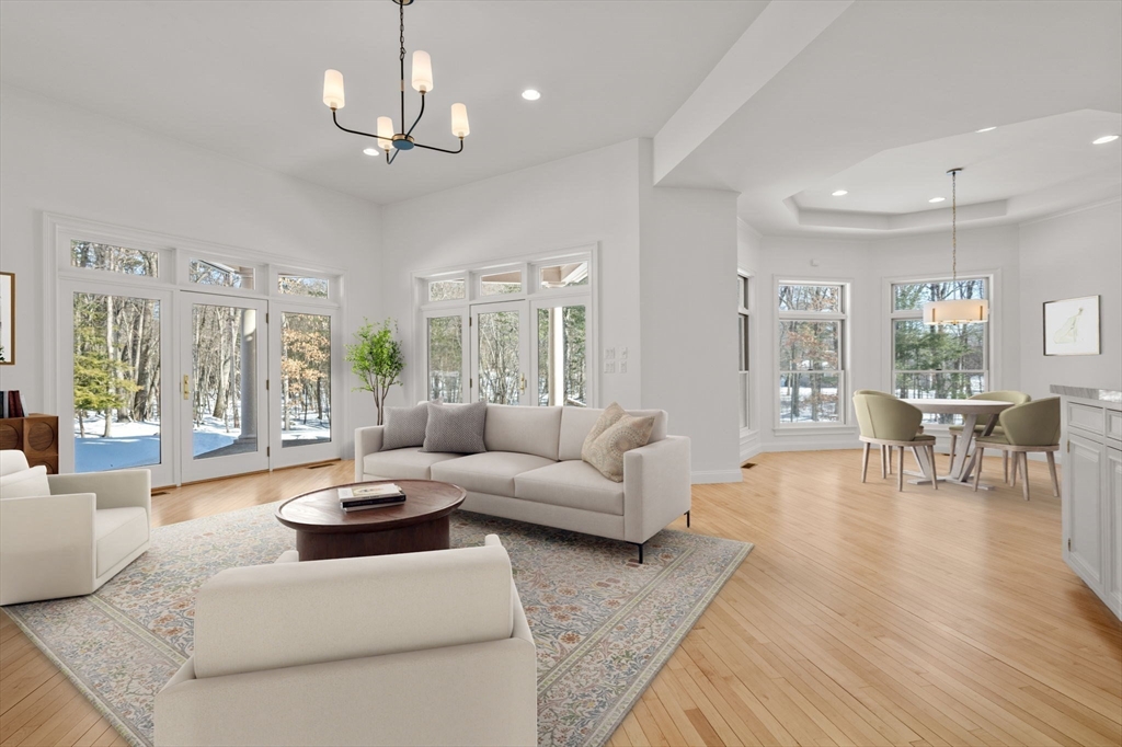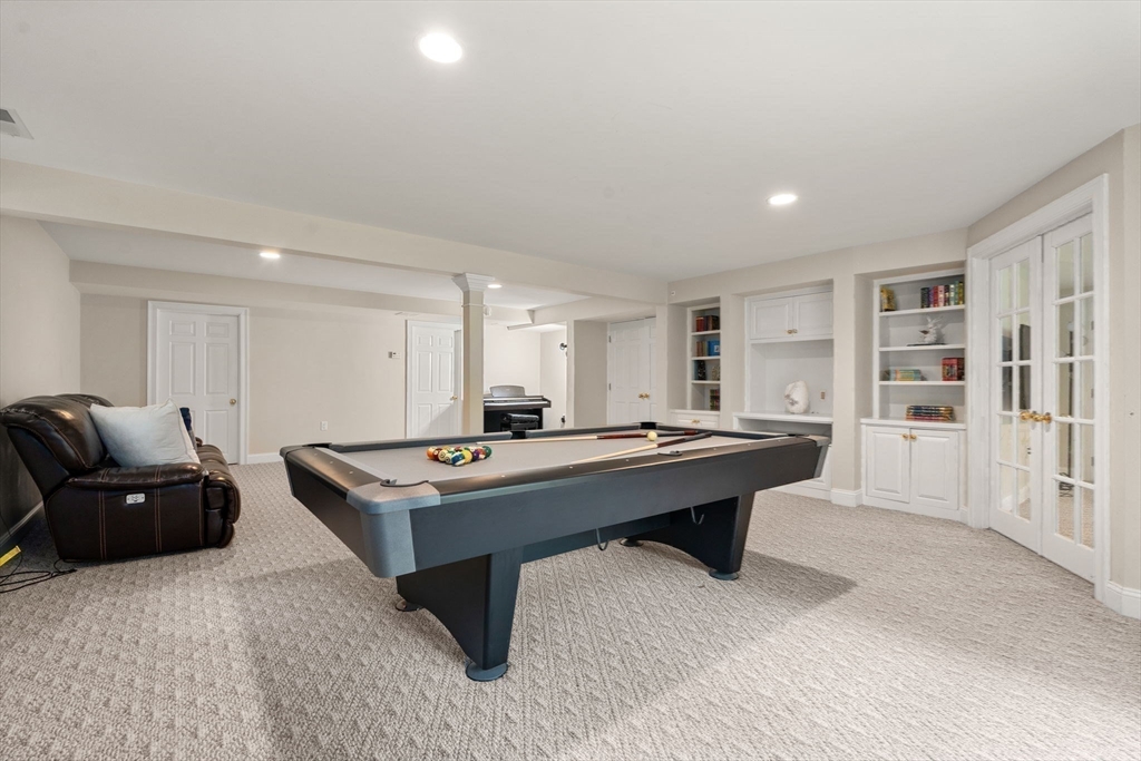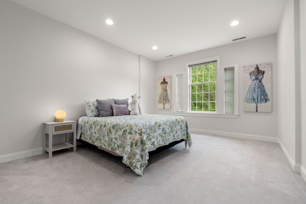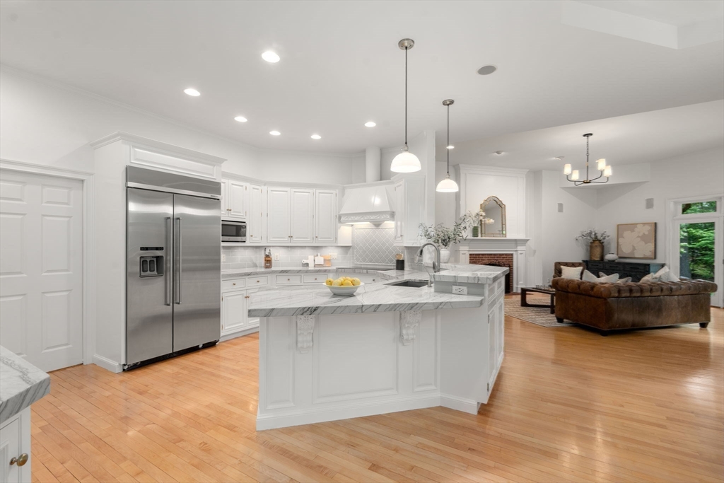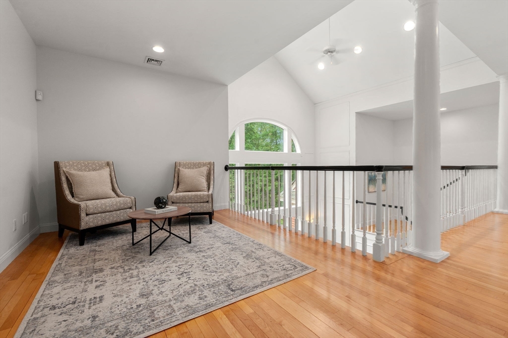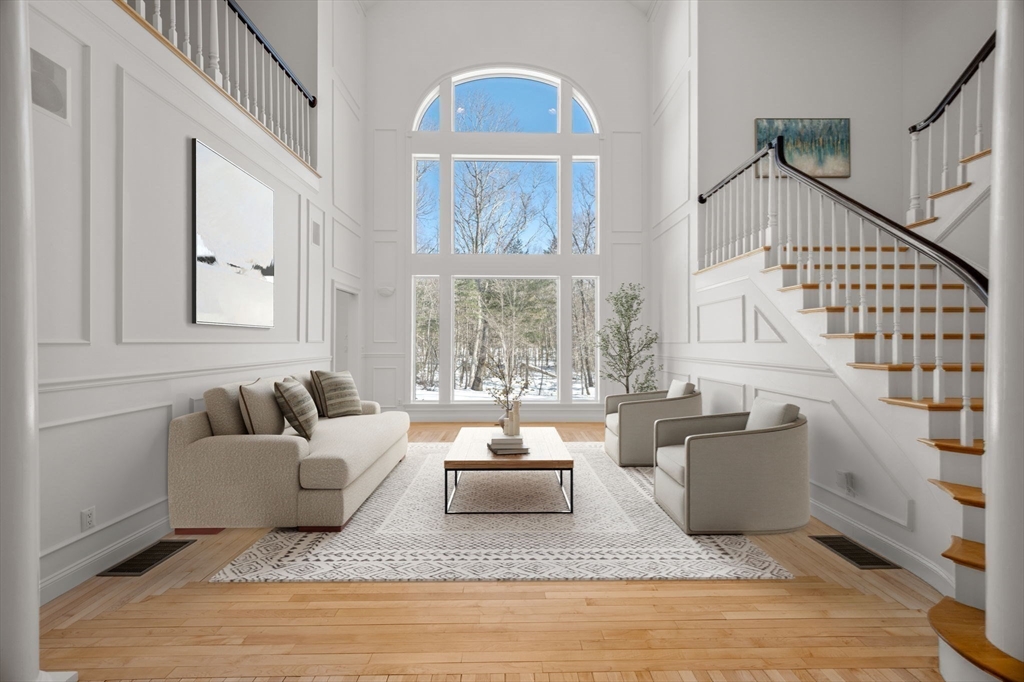 Rare offering in Monument Farm: custom brick Colonial with first-floor primary on 2 private acres. Privately set in one of Concord’s most sought-after neighborhoods, this home offers elegant architecture and a flexible layout for modern living. The main level features a dramatic two-story living room, updated kitchen with quartz counters + sunlit breakfast area, and a vaulted family room opening to a covered stone patio for seamless indoor-outdoor entertaining. A coveted first-floor primary suite with adjoining study, along with a guest suite, provides exceptional flexibility. Upstairs are three additional bedrooms, two full baths, and a versatile loft. The finished lower level includes media, exercise, and recreation spaces. Located on a quiet cul-de-sac with direct access to Estabrook Woods trails, this well-maintained home offers privacy, comfort, and timeless appeal.