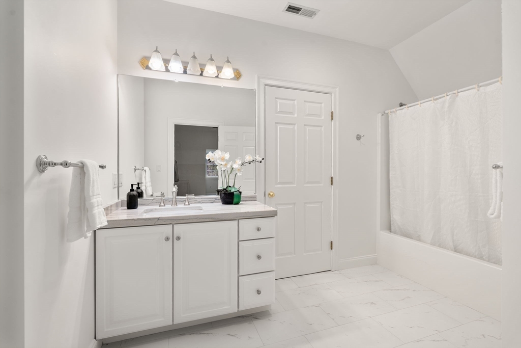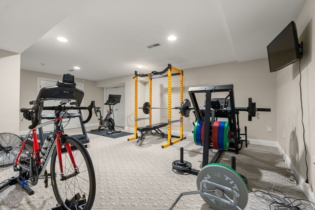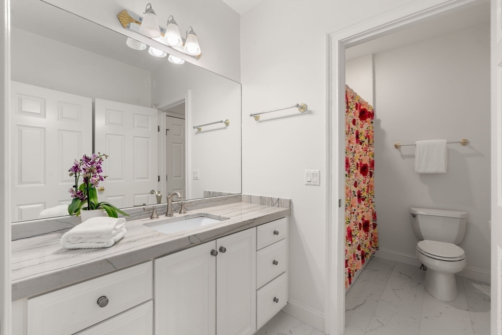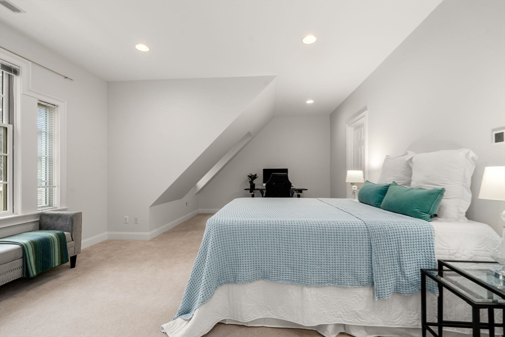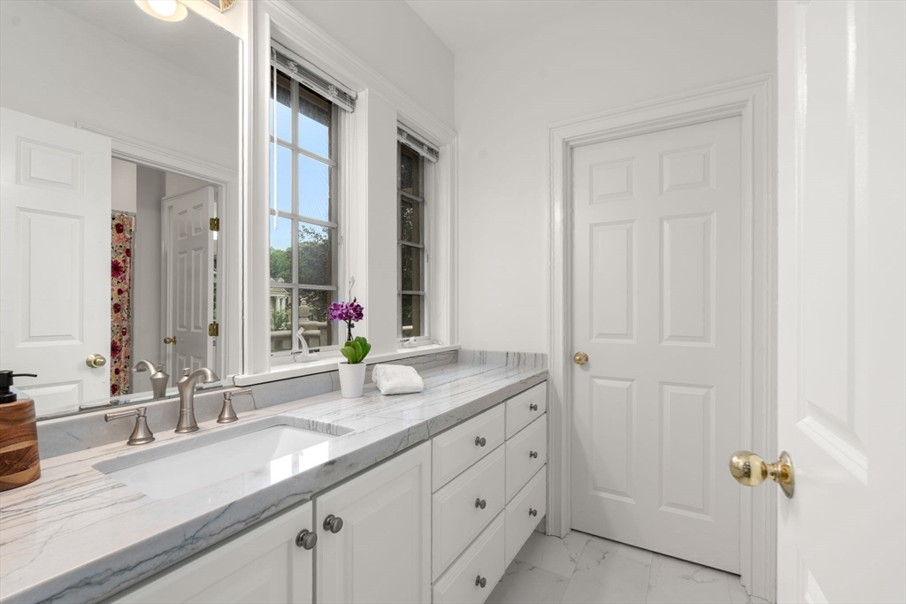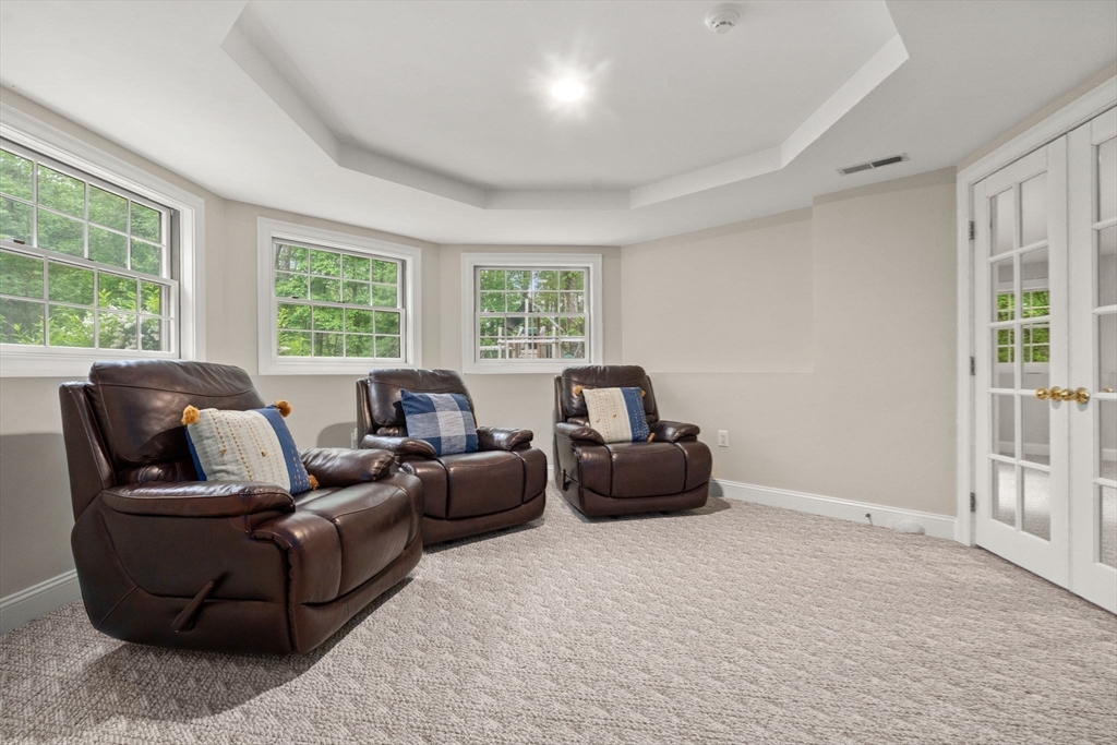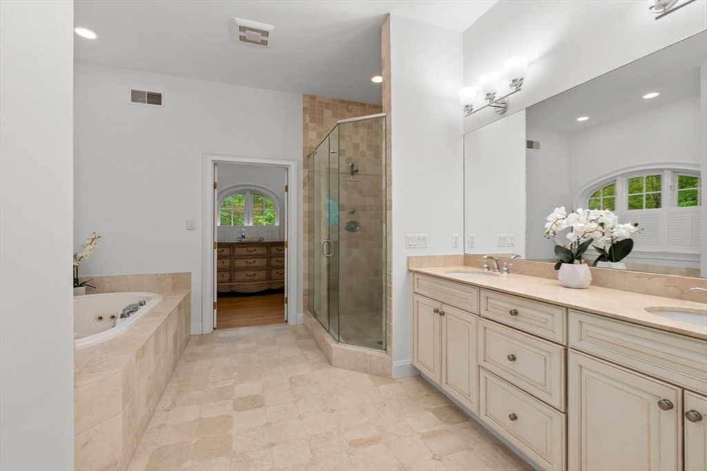 Rare offering in Monument Farm: custom brick Colonial with first-floor primary on 2 private acres. Privately set in one of Concord’s most sought-after neighborhoods, this home offers elegant architecture and a flexible layout for modern living. The main level features a dramatic two-story living room, updated kitchen with quartz counters + sunlit breakfast area, and a vaulted family room opening to a covered stone patio for seamless indoor-outdoor entertaining. A coveted first-floor primary suite with adjoining study, along with a guest suite, provides exceptional flexibility. Upstairs are three additional bedrooms, two full baths, and a versatile loft. The finished lower level includes media, exercise, and recreation spaces. Located on a quiet cul-de-sac with direct access to Estabrook Woods trails, this well-maintained home offers privacy, comfort, and timeless appeal.