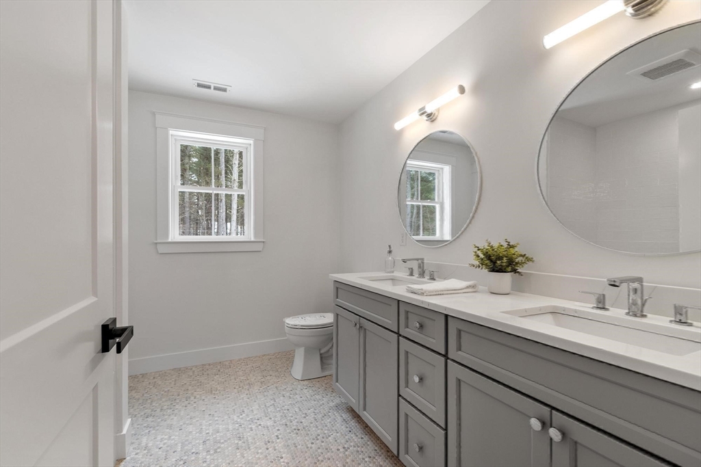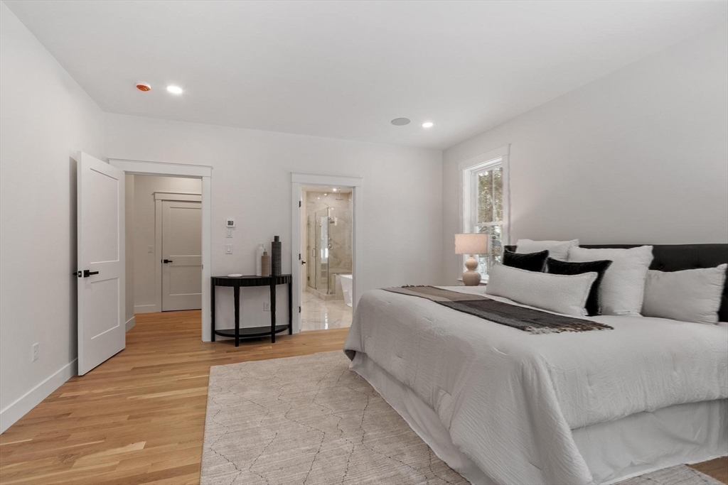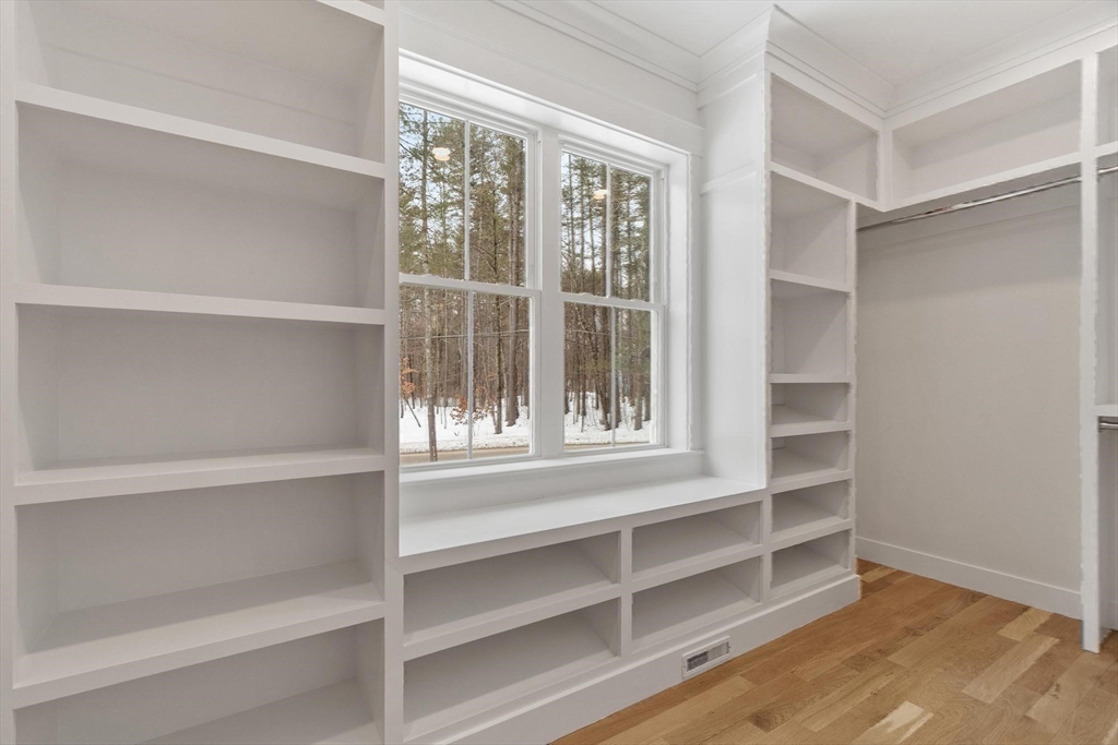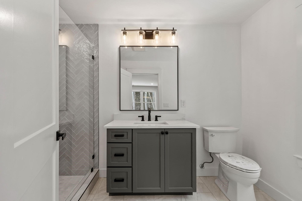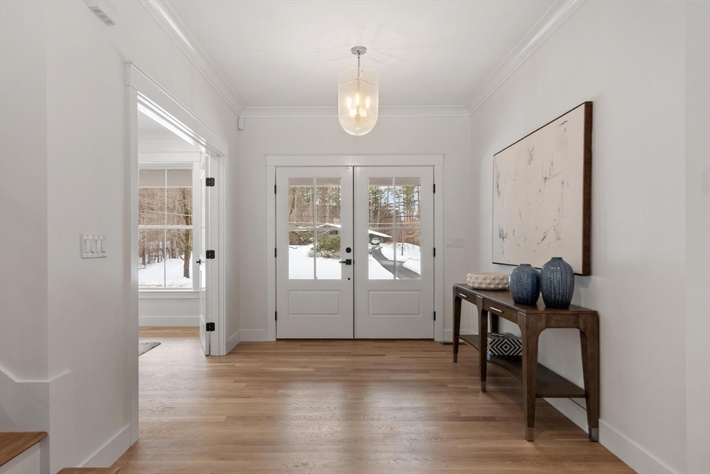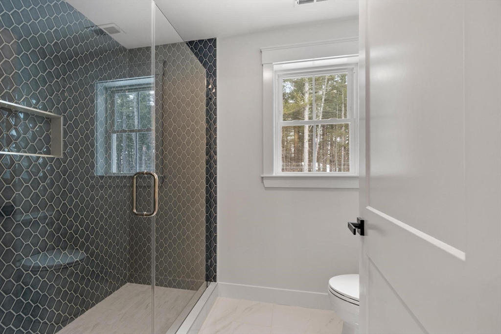 New 5-bedroom, 4.5-bath modern farmhouse, built for todays lifestyle by established local builder known for quality craftsmanship and thoughtful design. The open-concept kitchen features a large island, pantry, and eat-in area seamlessly connected to the great room with fireplace, creating the perfect gathering space. A formal dining room, private study, and first-floor primary suite with walk-in closet and spa-like bath with radiant heat floor complete the main level. Upstairs, four bedrooms each offer their own en-suite bath, with potential for a second primary suite. A loft and bonus room provide flexible spaces for reading, study, or play. The lower level, with high ceilings, invites future expansion. Outdoor living is enhanced by a spacious deck overlooking private woodland views. A three-car garage with mudroom adds convenience. Set within an enclave of new homes, this peaceful setting is only ten minutes from Whole Foods, Starbucks, the commuter rail and Routes 3, 95 and 495.