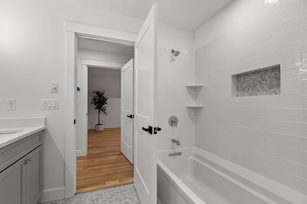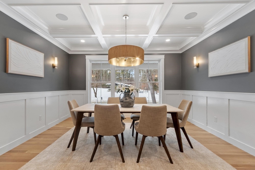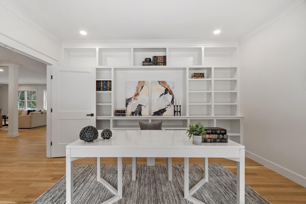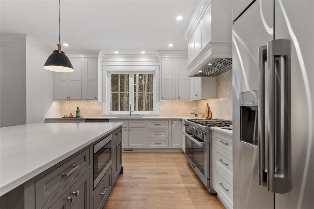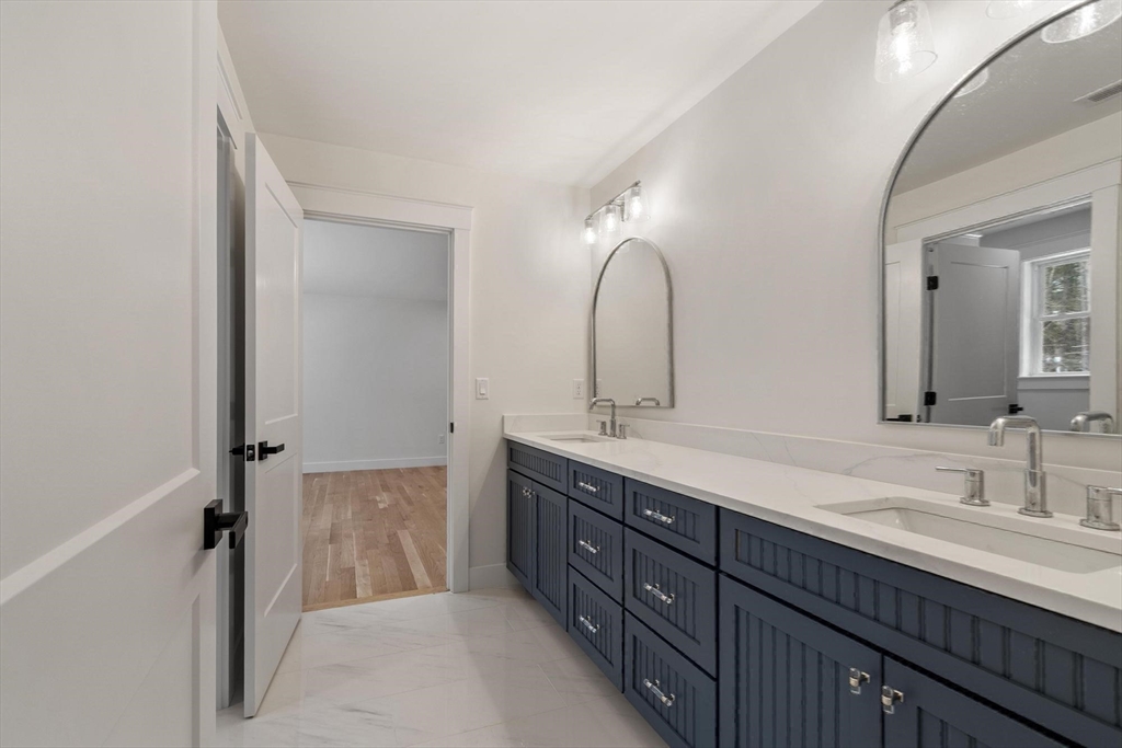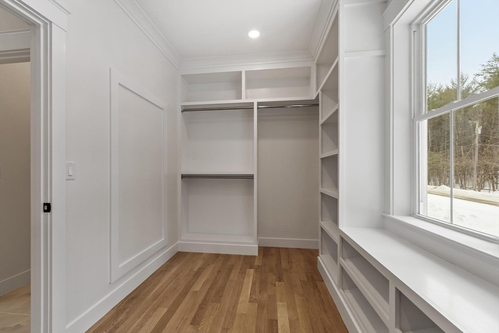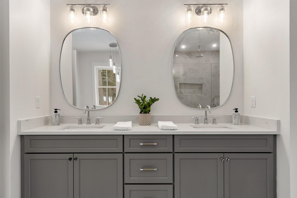 New 5-bedroom, 4.5-bath modern farmhouse, built for todays lifestyle by established local builder known for quality craftsmanship and thoughtful design. The open-concept kitchen features a large island, pantry, and eat-in area seamlessly connected to the great room with fireplace, creating the perfect gathering space. A formal dining room, private study, and first-floor primary suite with walk-in closet and spa-like bath with radiant heat floor complete the main level. Upstairs, four bedrooms each offer their own en-suite bath, with potential for a second primary suite. A loft and bonus room provide flexible spaces for reading, study, or play. The lower level, with high ceilings, invites future expansion. Outdoor living is enhanced by a spacious deck overlooking private woodland views. A three-car garage with mudroom adds convenience. Set within an enclave of new homes, this peaceful setting is only ten minutes from Whole Foods, Starbucks, the commuter rail and Routes 3, 95 and 495.