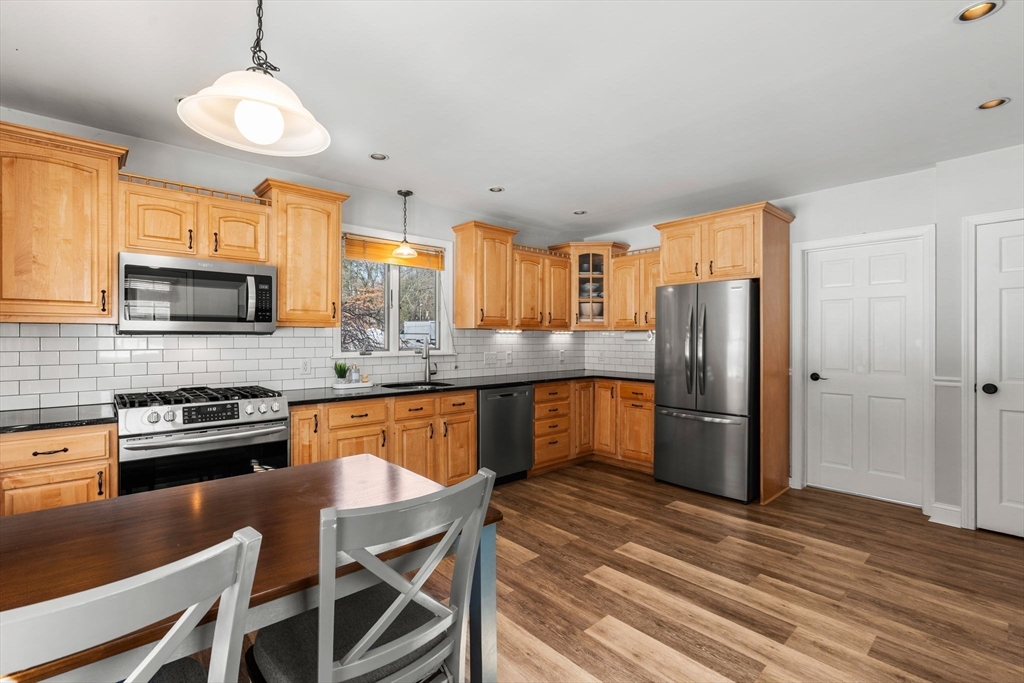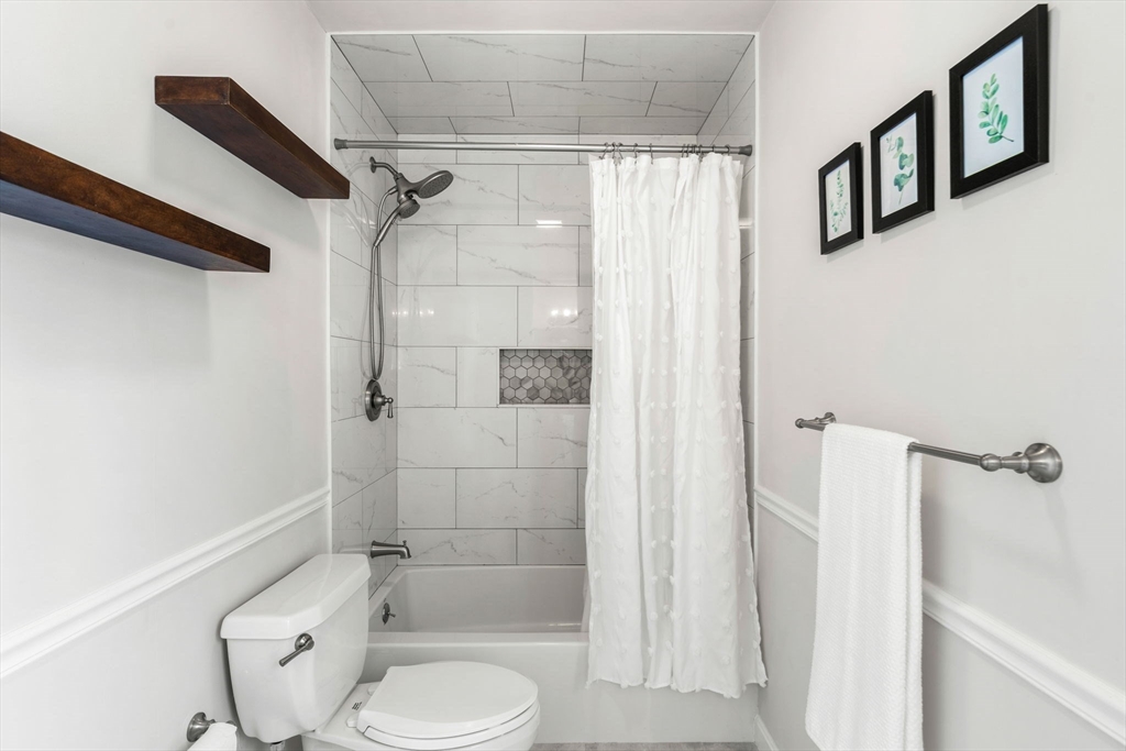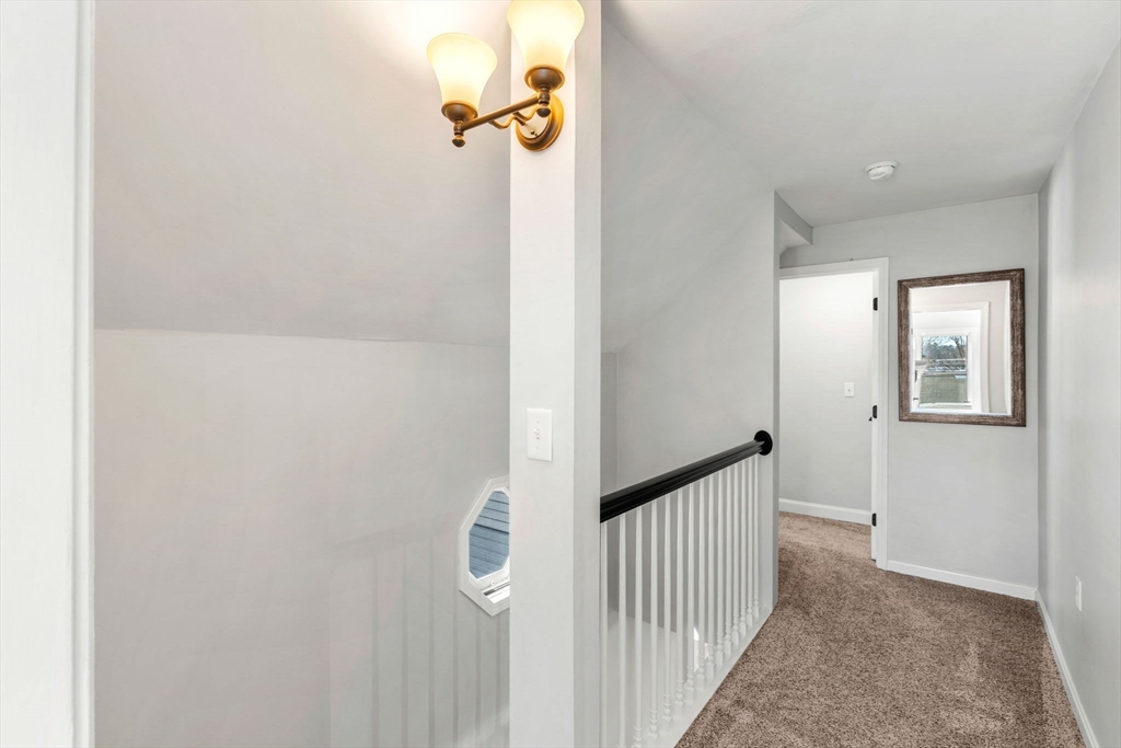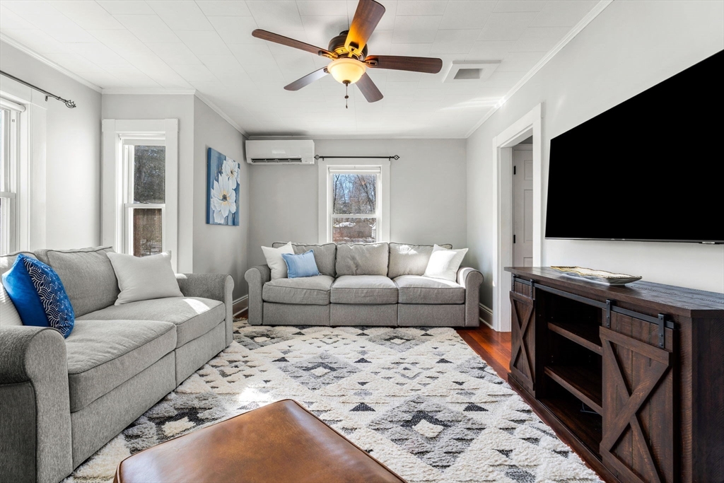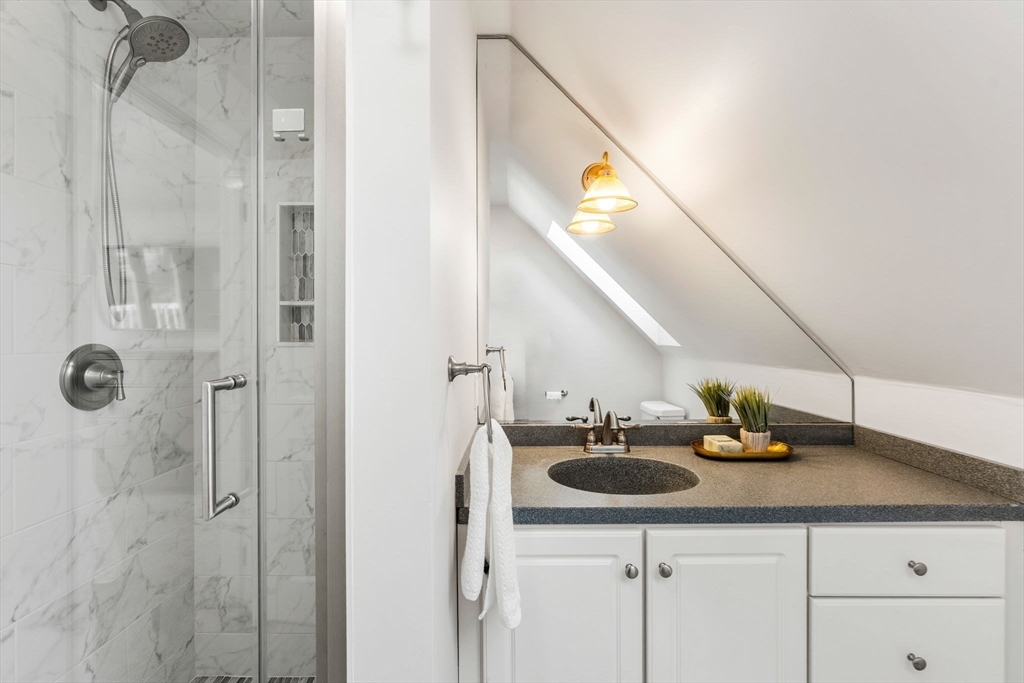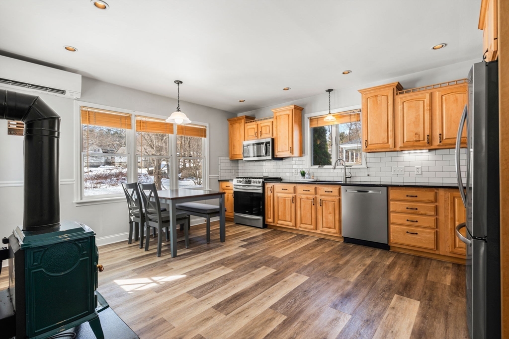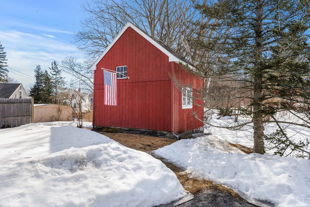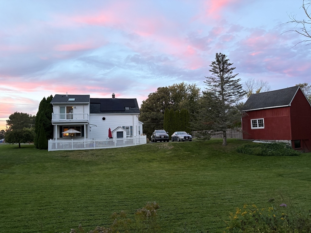 Turn-key and very well maintained 3-bedroom, 2-full-bath home that does not reflect its year built. This thoughtfully renovated property blends character with modern comfort. The spacious kitchen offers maple cabinetry, granite counters, gas cooking, and stainless appliances, opening to a dining room with a decorative tin ceiling. A generous living room and light-filled sunroom add warmth and flexibility. A fully updated first floor full bath adds convenience. The primary suite features a private balcony deck and an updated bath with beautiful tile, glass shower, and skylight. Two additional bedrooms offer great space. Public water, public sewer, and natural gas the trifecta! Leased solar panels and five heat pumps add efficiency. A full basement and restored barn-style shed provide excellent storage. Set on a lovely private lot with beautiful views, green space, and patio. Central location close to the beach, major commuting routes, restaurants, and conservation areas.
