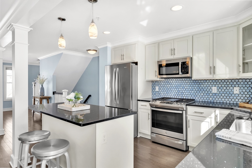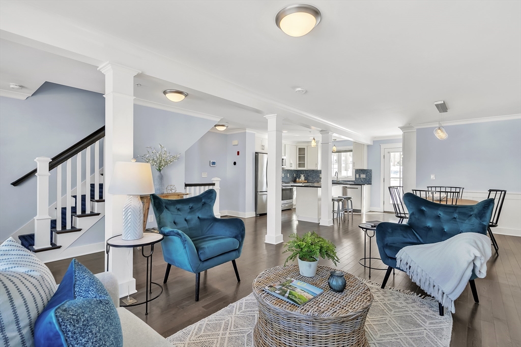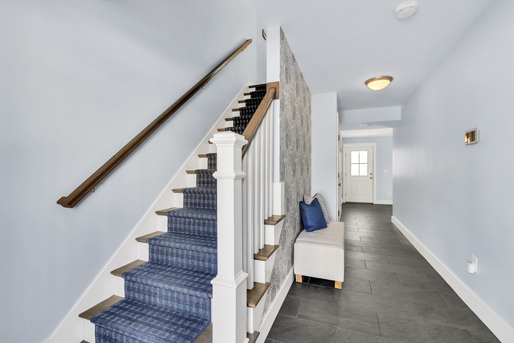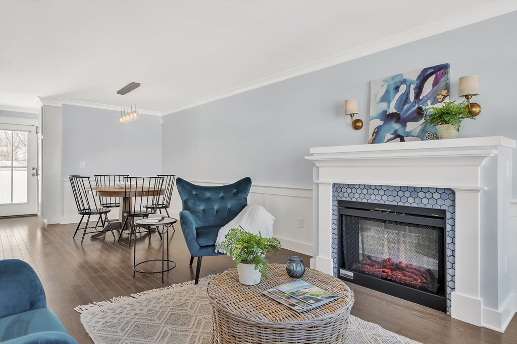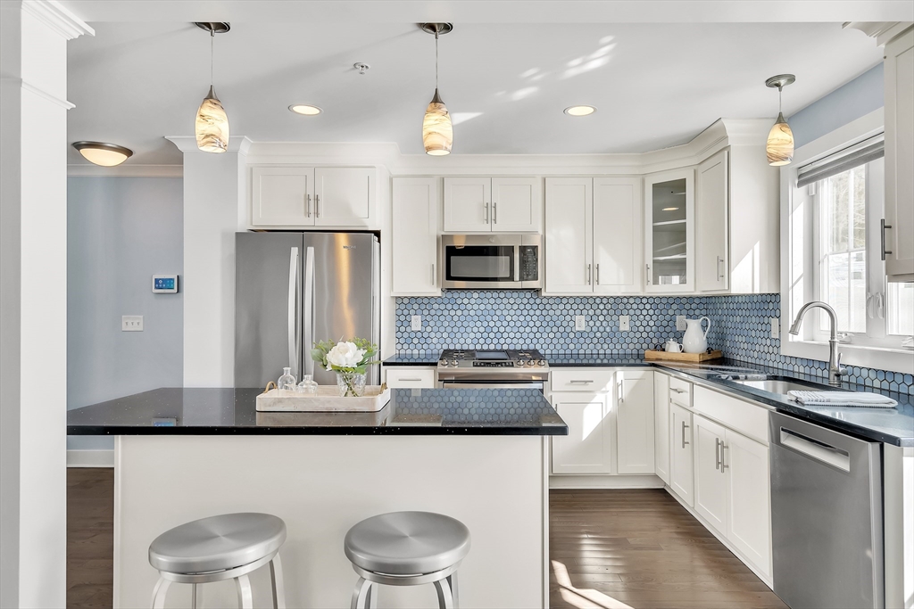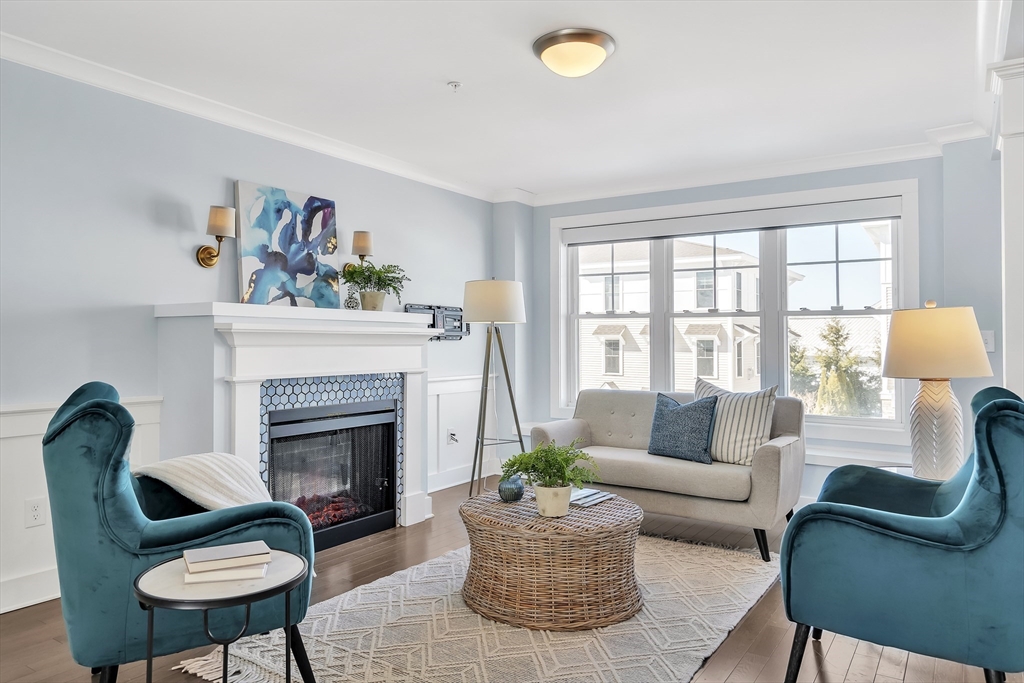 Modern style meets effortless living in this beautiful townhome built in 2020. This sun-filled coastal oasis has hardwood floors, dramatic tile, and stylish wallpaper accents that add personality throughout. The stunning kitchen features granite countertops and a striking blue tile backsplash, opening to the living and dining area with a cozy electric fireplace. Two en suite bedrooms are located on the third floor, including a serene primary suite with a luxurious bath and two closets. Laundry is conveniently located with the bedrooms. The first floor family room / office offers the potential to create a third bedroom with a full bathroom. The home includes garage parking, AC, electric shades, Nest thermostats, and an ADT security system at all points of entry. Enjoy outdoor living on your private deck and patio. Located in a pet-friendly community just 0.6 miles from the commuter rail and 3 miles from 95, this home provides easy access to downtown Newburyport, the beaches, and beyond.