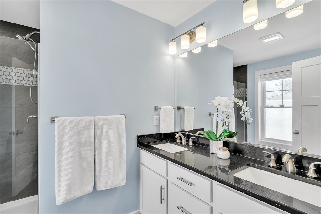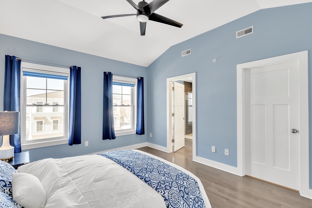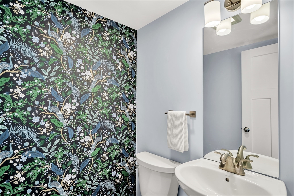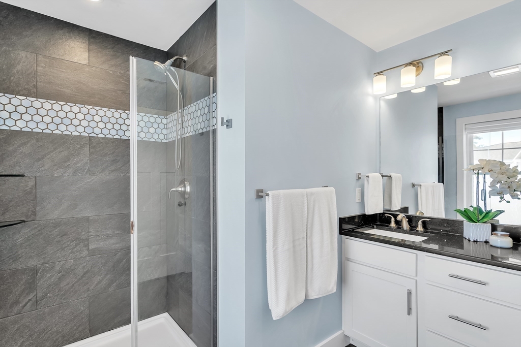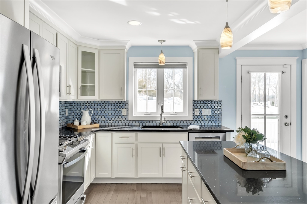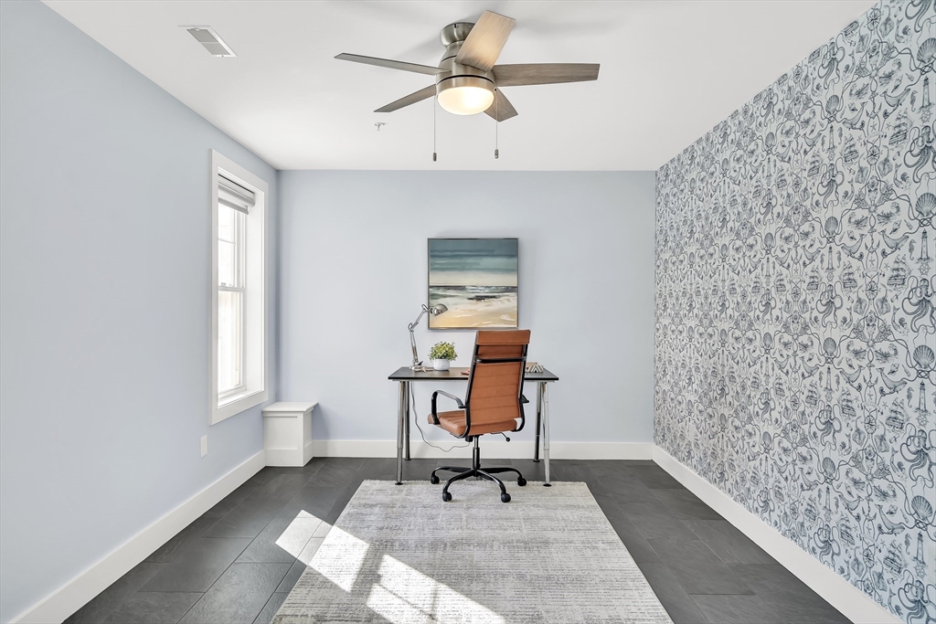 Modern style meets effortless living in this beautiful townhome built in 2020. This sun-filled coastal oasis has hardwood floors, dramatic tile, and stylish wallpaper accents that add personality throughout. The stunning kitchen features granite countertops and a striking blue tile backsplash, opening to the living and dining area with a cozy electric fireplace. Two en suite bedrooms are located on the third floor, including a serene primary suite with a luxurious bath and two closets. Laundry is conveniently located with the bedrooms. The first floor family room / office offers the potential to create a third bedroom with a full bathroom. The home includes garage parking, AC, electric shades, Nest thermostats, and an ADT security system at all points of entry. Enjoy outdoor living on your private deck and patio. Located in a pet-friendly community just 0.6 miles from the commuter rail and 3 miles from 95, this home provides easy access to downtown Newburyport, the beaches, and beyond.