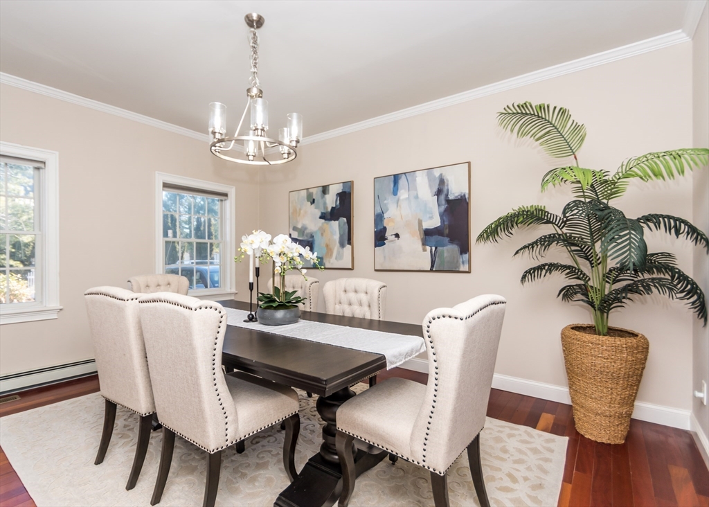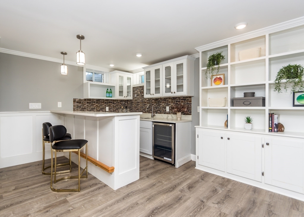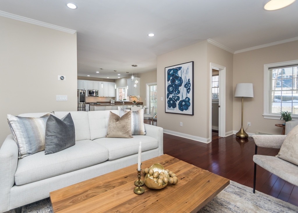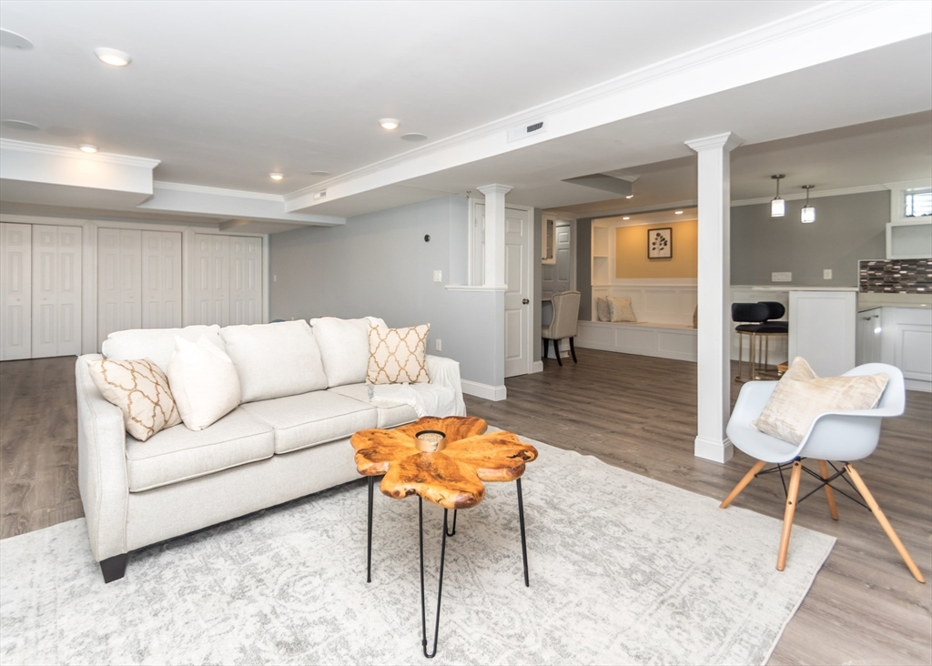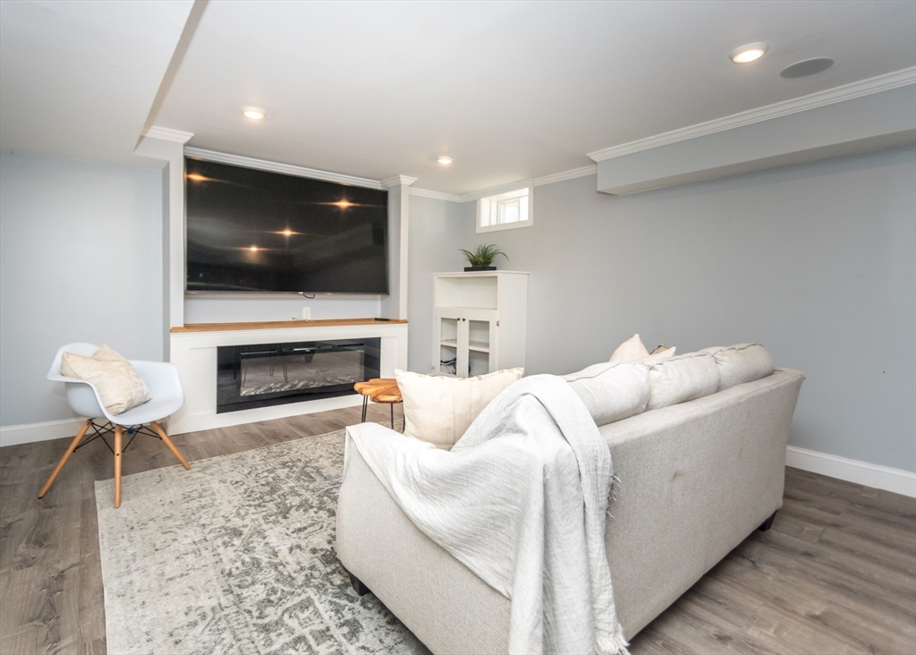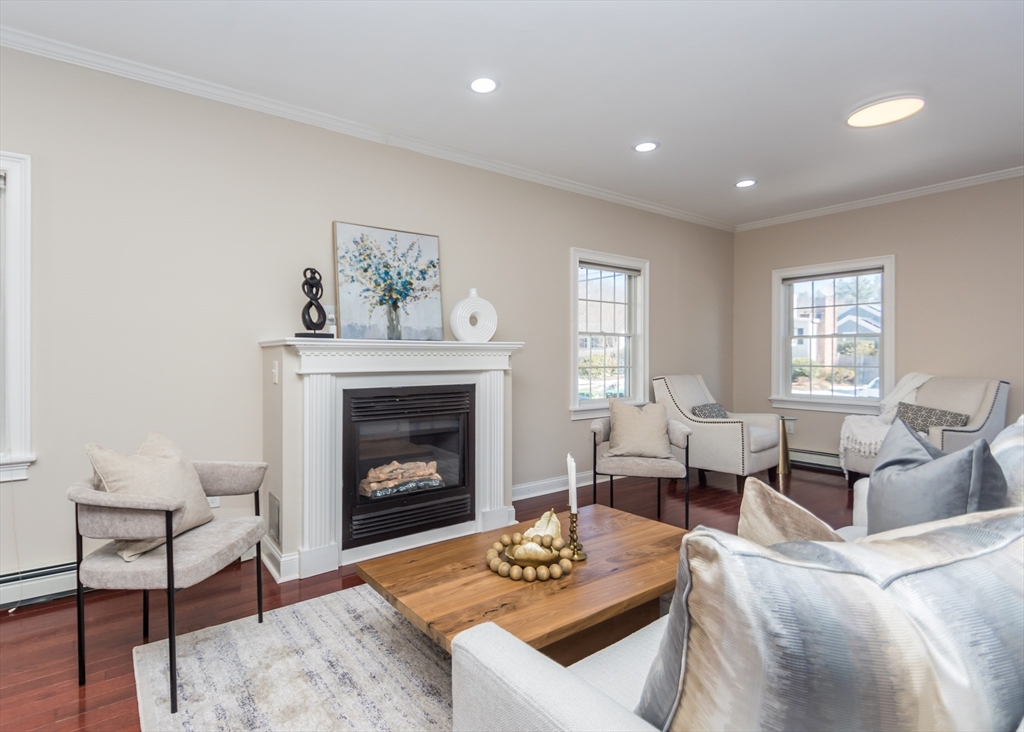 Beautiful 9-room Colonial located on a quiet cul-de-sac! This spacious home offers an open and inviting layout perfect for everyday living and entertaining. The large family room with gas fireplace flows seamlessly into the kitchen featuring stainless steel appliances, granite countertops, breakfast bar and a dining area with slider leading to a private patio and backyard. A formal dining room and powder room complete the first floor. The second level includes a generous primary suite with walk-in closet and spa-like bath, plus two additional bedrooms and a full family bath. The third floor offers two more bedrooms, full bath and convenient laundry. The finished lower level is ideal for entertaining with a wet bar and flexible space for a media room, second family room or gym space. Enjoy high ceilings, gas cooking, gas heat and a gas fireplace. Level fenced yard. Conveniently located near the Eliot School, Needham Heights shops, restaurants & commuter rail and easy highway access.