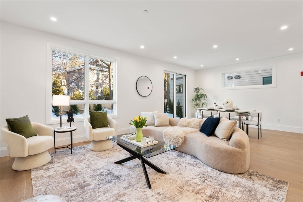Welcome to The Residences at Four Corners, a collection of seven spacious townhomes in the Four Corners neighborhood of Newton Highlands. Crystal Lake, Whole Foods, village shops, Cold Spring Park, and Newton Centre are all nearby, and both the Newton Centre and Newton Highlands Green Line stops are an easy walk. Each home sits above a private heated parking level with direct access to an individual two car garage, also heated. Floor plans feature an open first floor and a first-floor bedroom suite, with four-to-five-bedroom layouts and three and a half or more baths. Kitchens are finished with custom cabinets, Thermador appliances and quartz counters. Two homes include private elevators with direct service from the lower level to the second-floor primary suite. Best of all these homes have gas heat, hot water, cooking and outdoor BBQ hook-ups and every residence offers a fenced private yard with a patio. Ask agent about "Exclusive Use area" in front of unit 6 garage door.
