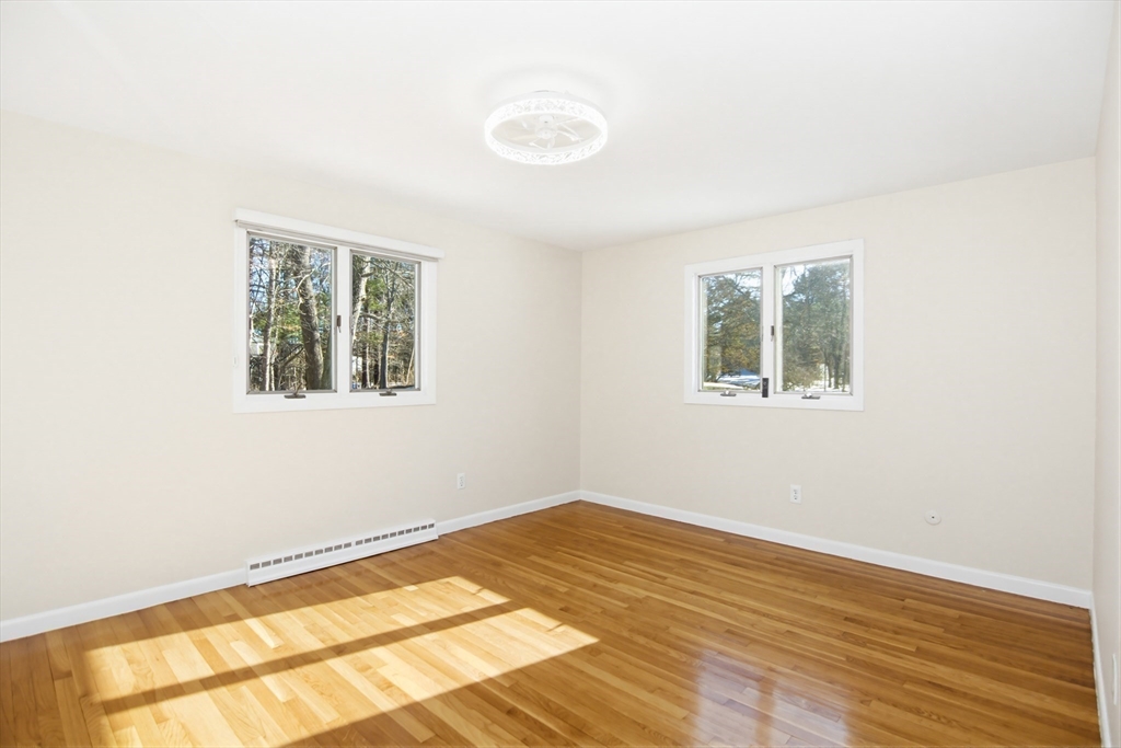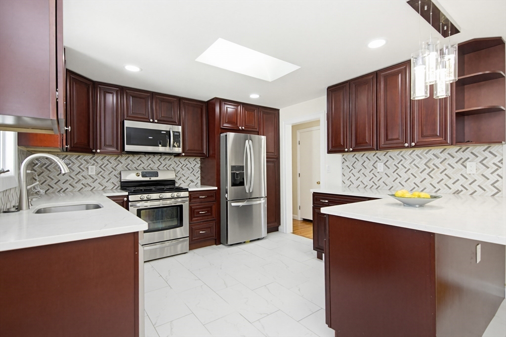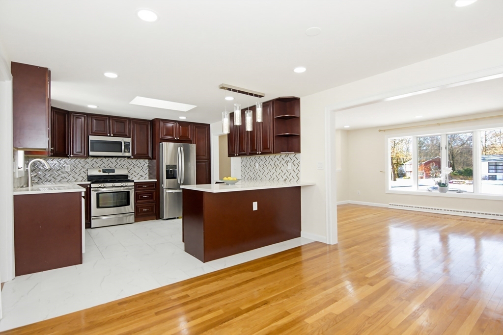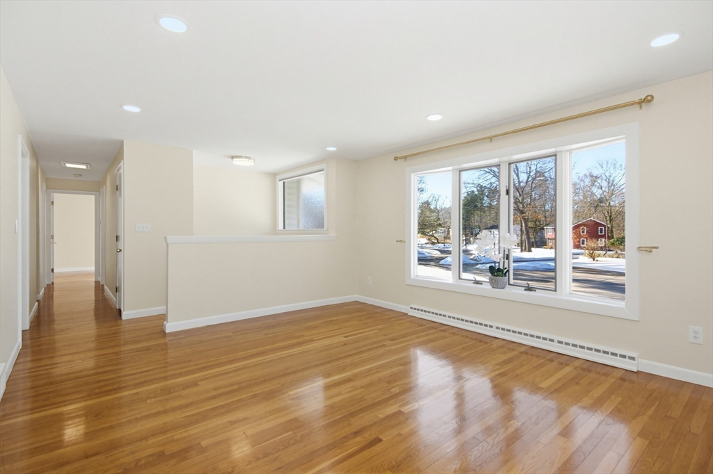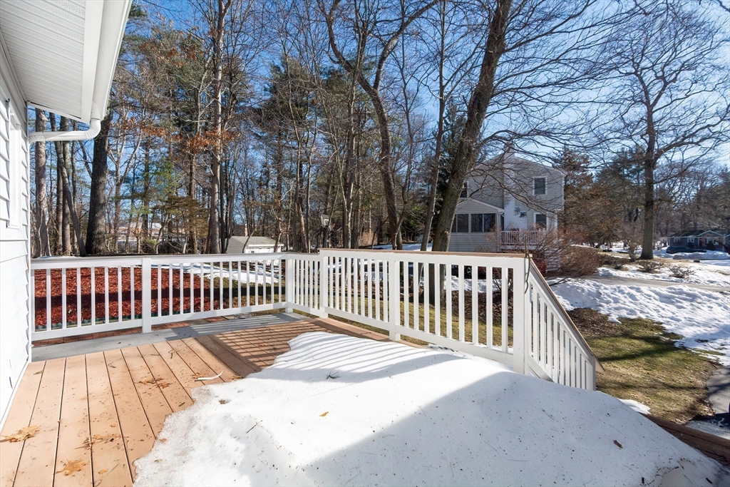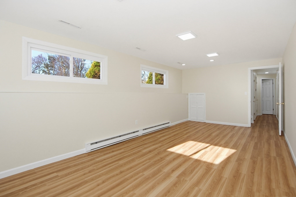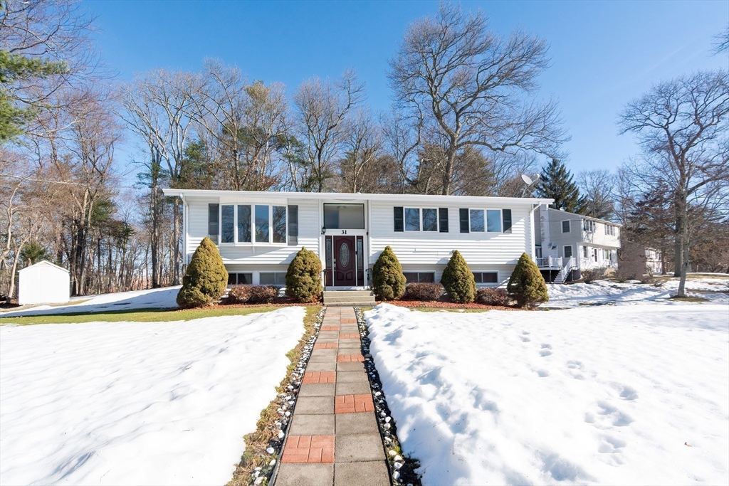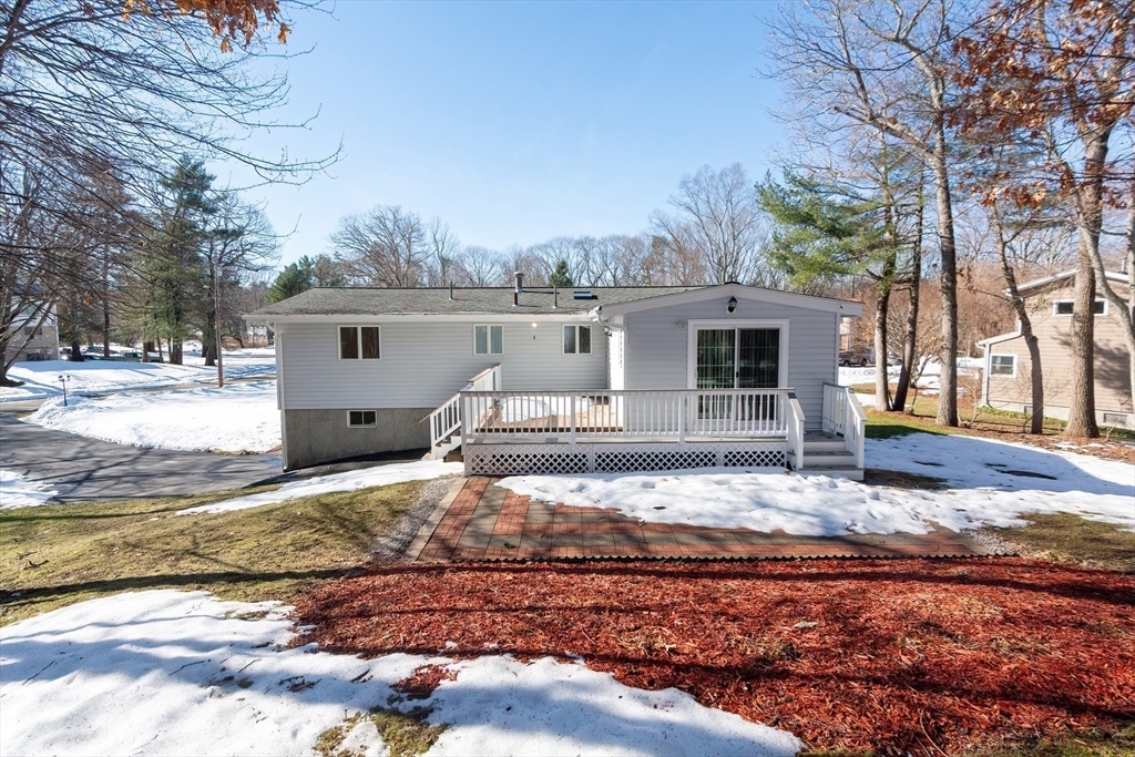 Impeccable home in SERENE peaceful CUL-DE-SAC, FRESHLY PAINTED move-in ready 3-4 bedroom, 2 bath home in great school neighborhood. BRIGHT AND SUNSHINE bay window living room opening to an adjoining dining room and REMODELED kitchen with skylight and newer appliances including NATURAL GAS stove. In back LARGE FAMILY Room with Skylight for entertainment opens to DECK. First floor Features primary bedroom and 2 additional bedrooms with renovated full bath. The FULLY finished lower level includes a spacious room can be used as GUEST Bed/BONUS room, PLUS an HOME OFFICE, WALK-IN CEDAR CLOSET, REMODEL full bath, laundry room and access to 1-car garage. Exterior features include upper level deck overlooking a brick patio and beautiful wooded back yard. This single family residence presents an inviting opportunity for living in Sharon, has style , space and house is cerified de-lead. Showing Starts first OPEN HOUSE. Just minutes to rated great schools and Lake Massapoag.