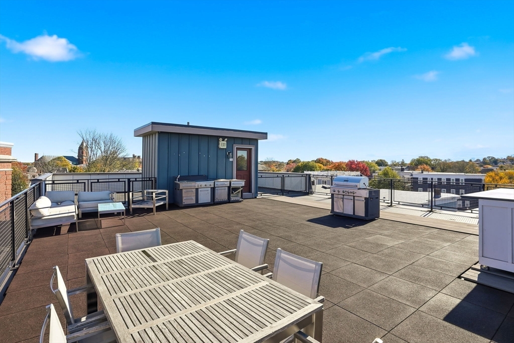 Penthouse with private roof deck AND deeded parking! This sun-drenched unit provides an idyllic floorpan with high ceilings and incredible natural light. This no-expense-spared young construction features a Chef's kitchen with quartz counters, SS appliances, built-in breakfast bar, and dedicated formal dining. Large and dimensional living is the perfect space to relax or entertain. Start your day with a cup of coffee on the exclusive balcony! Primary suite offers walk-in closet and designer bath with frameless glass shower. Generous guest bed, with dedicated bath, is ideal for the growing family and/or WFH. Enjoy the quickly approaching Spring & summer on your breathtaking private roof deck! Offering panoramic views toward Boston Harbor and across the entire Boston Skyline. Also available is common roof deck area with outdoor kitchen and TV's! Central AC. Private Storage. 1 car deeded parking. A rare opportunity to have-it-all in booming Dorchester!