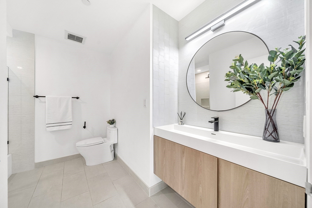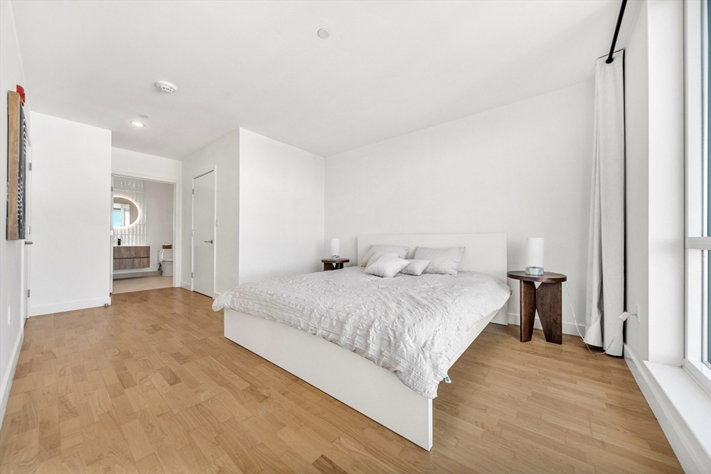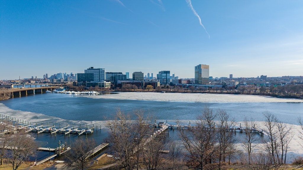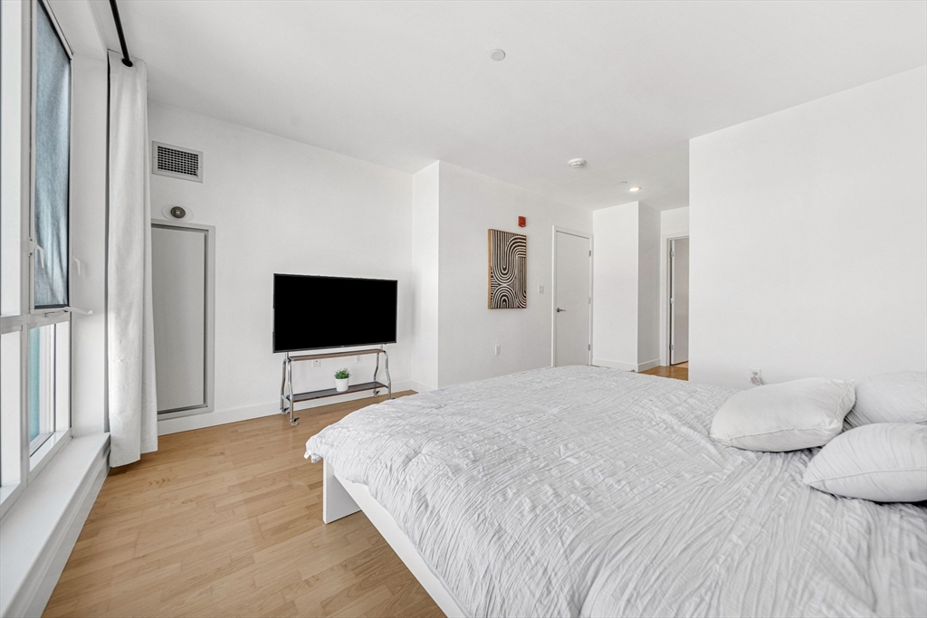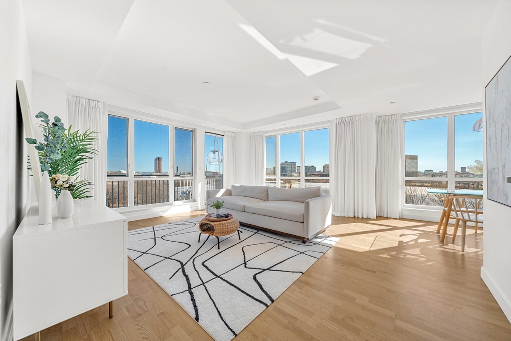 Rare 7th-level, 1,291 sqft corner condo at Skyline at Station Landing. Filled with natural light from floor-to-ceiling windows, with views of Mystic River, Boston, Wellington Marina, and Encore Casino. Open living, dining, and kitchen with private balcony. Kitchen features stainless steel appliances, cherry cabinets, granite counters, and bar seating for three. Two bedrooms, two full baths (renovated 2023), central air, primary walk-in closet, in-unit laundry. Amenities: concierge, lobby, 24-hr gym, conference room, lounge, terrace, shared kitchen, Wi-Fi. Near Shops at Station Landing and garage with covered bridge to Orange Line. Includes secure garage spot, private storage, heat and hot water. Pet-friendly, built 2007, move-in ready.