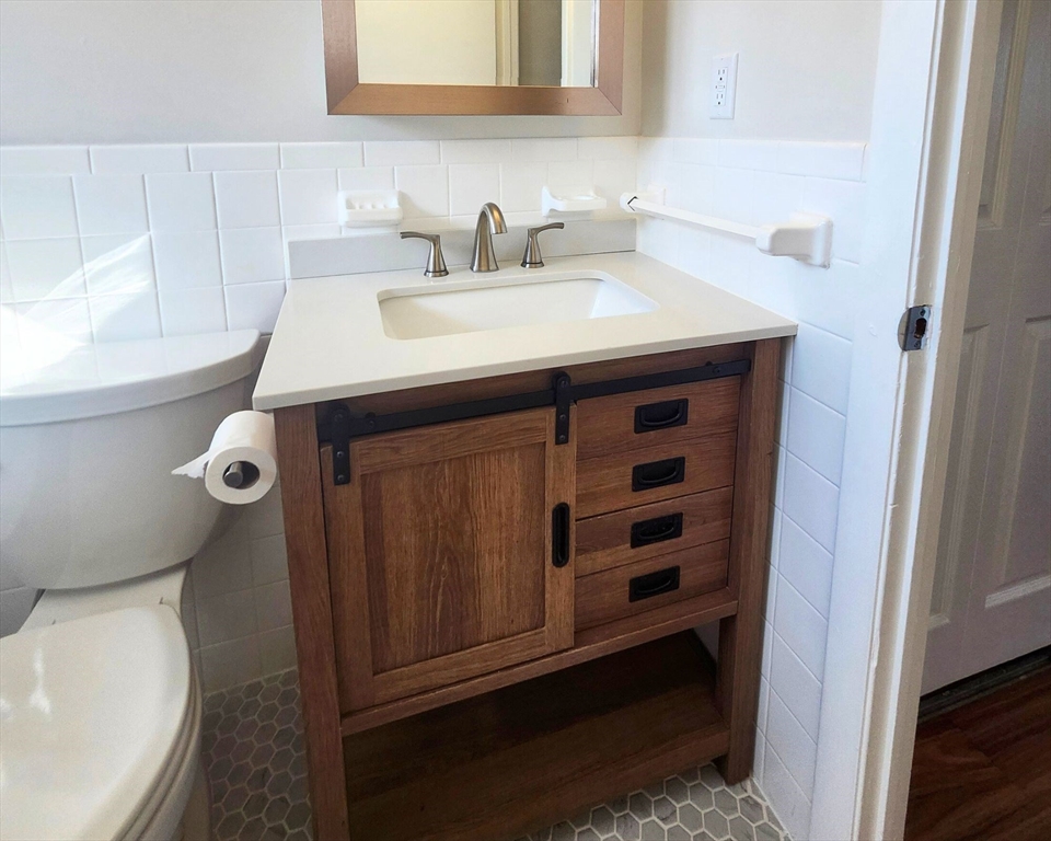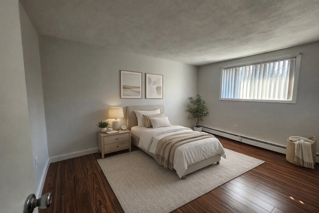 Garden-style condo located in convenient South Weymouth location offering 2 bedrooms and 1 full bath. The layout includes a bright living room that opens to a covered balcony, providing outdoor space for seating and relaxation. The eat-in kitchen features black granite countertops, dishwasher, garbage disposal, and a new over-the-range microwave. Interior updates include fresh paint, manufactured wood flooring throughout, and an updated bathroom with a modern vanity, new toilet, and tile flooring. Kitchen and bath plumbing have been updated. Additional storage is available in a nearby storage closet, and the building includes coin-operated laundry. One deeded parking space plus guest parking. HOA fee includes heat, water, hot water, snow removal, and trash. Located about 0.6 miles to the South Weymouth commuter rail, about 1.3 miles to Route 3, with MBTA bus service nearby and close proximity to grocery stores, restaurants, and retail shopping.