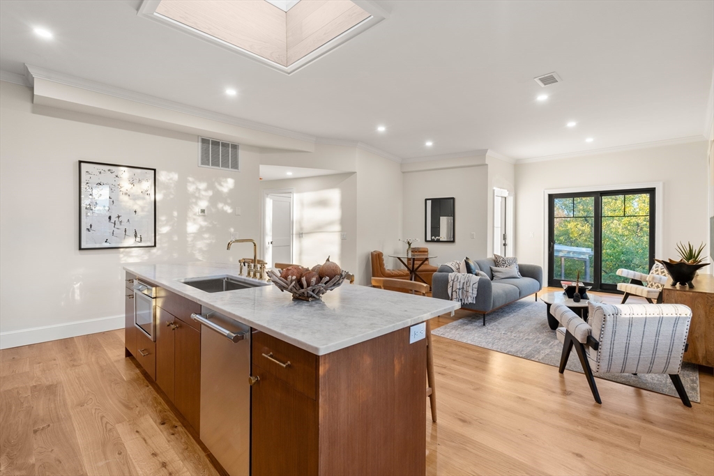 This stunning BRAND NEW top floor penthouse condo was designed in perfect balance—functional, modern, and effortlessly warm. Flooded with natural light with oversized Marvin windows, this home features a custom chef's kitchen with Taj Mahal quartzite countertops, and a stand-alone island that has a dramatic skylight by Marvin with smart capabilities. It showcases a premium Thermador appliance suite with induction range, custom cabinetry with real brass knobs and handles, and a bridge faucet. Highlights are the wide-plank white oak flooring, which is much higher than the usual developer grade, custom-tiled baths with Duravit fixtures, the primary shower features thermostatic shower system by Grohe. and a thoughtful floor plan elevating the home’s refined character. The property’s unique angled layout provides exceptional natural light, and dramatic sunsets. The deck from the living room is made of mahogany, with garage parking and a fenced patio space completes exceptional offering.