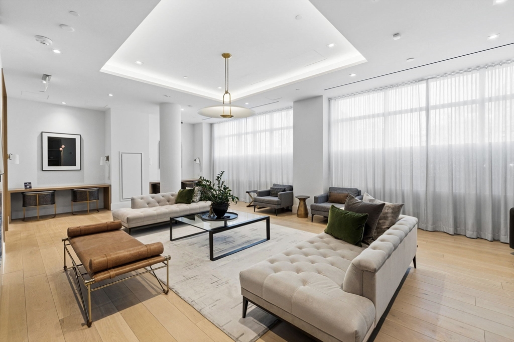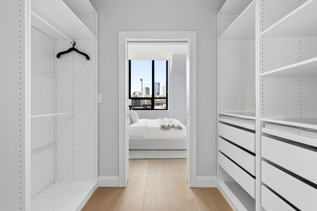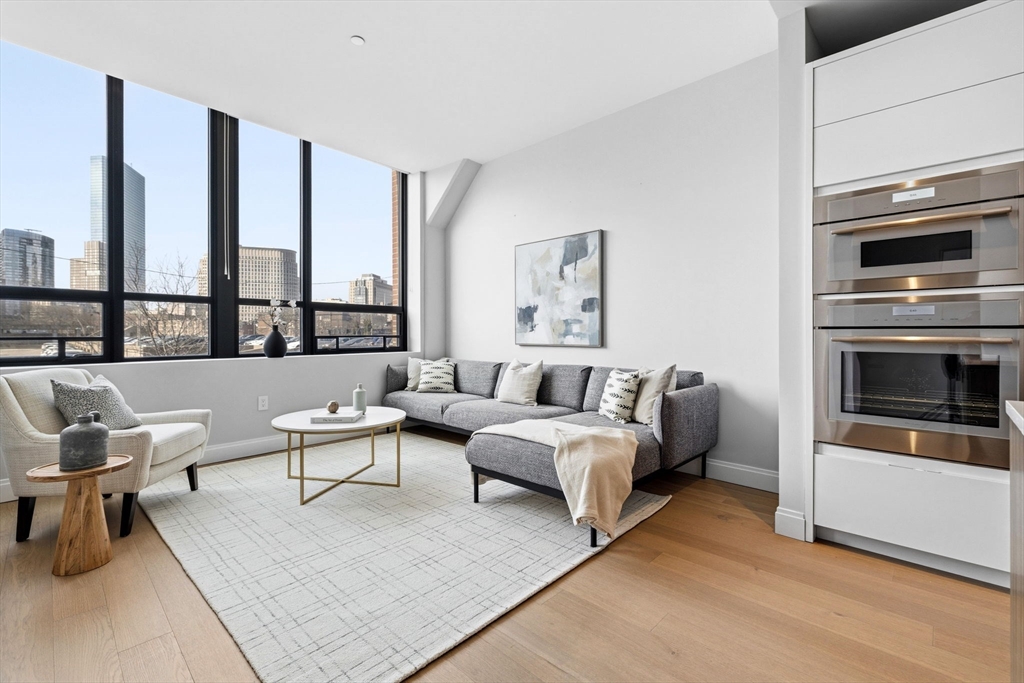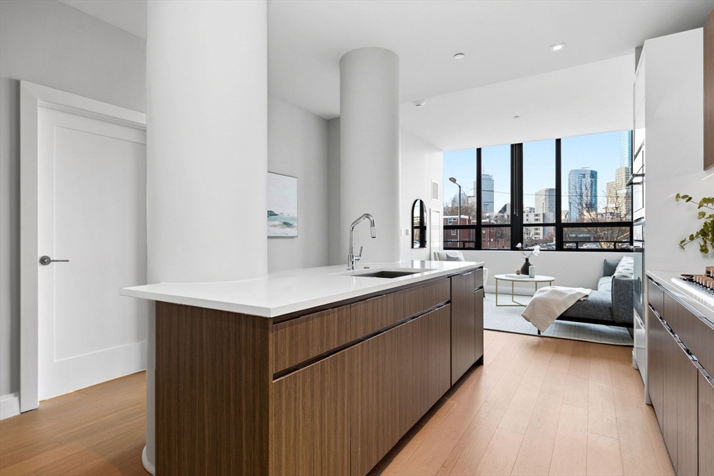 This exceptional oversized one-bedroom residence features a one-of-a-kind floor plan within the building, with soaring 9+ ft ceilings, oversized windows, and sweeping panoramic views of the Boston skyline, plus garage parking. The bright open living and dining area offers generous space for both entertaining and everyday living, with additional room for flexible use such as a home office or den. The modern kitchen is outfitted with custom cabinetry, Miami White Silestone countertops, and premium Thermador appliances. The spacious king-sized bedroom includes a custom built-in, walk-through closet leading to a spa-inspired bathroom with double vanity. Ideally located steps from Whole Foods, renowned South End dining, and convenient access to public transit as well as I-90 and I-93. Residents enjoy luxury amenities including 24/7 concierge, on-site management, coworking lounges, caterer’s kitchen, two rooftop terraces with skyline views, pet spa, and more. Best value in the building!